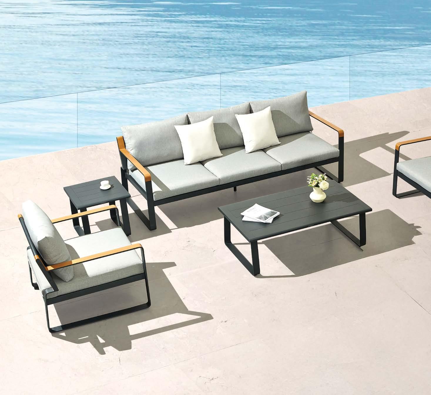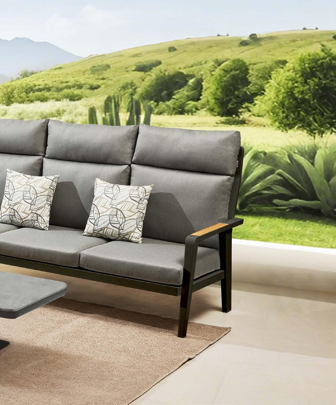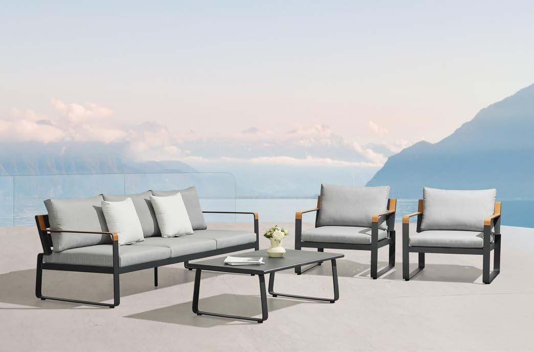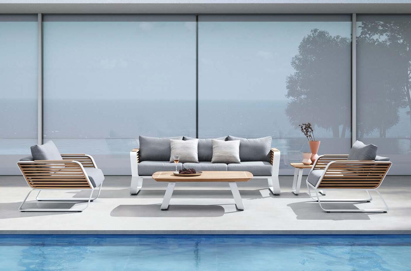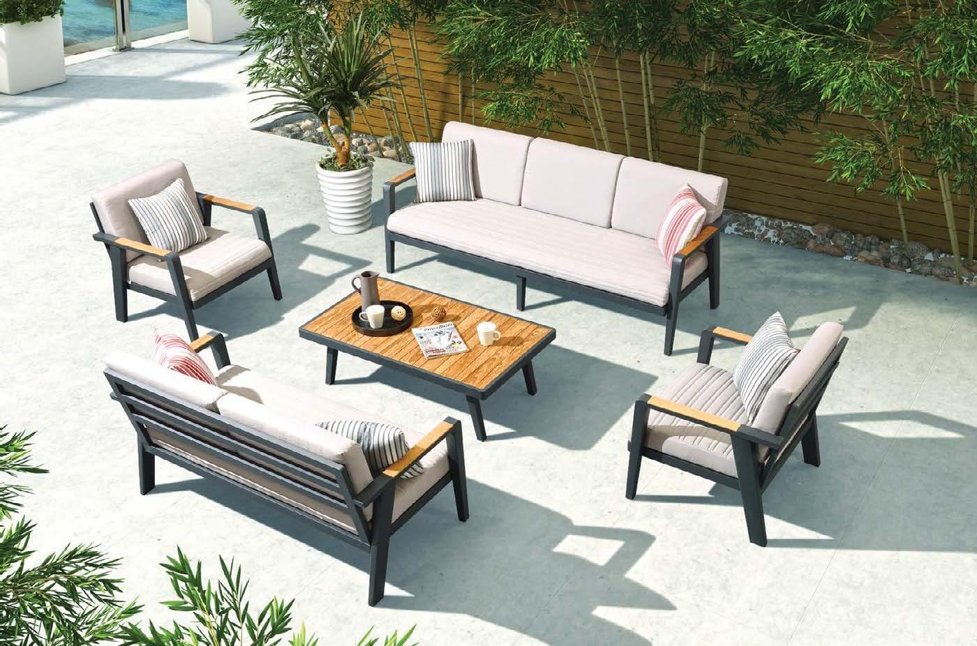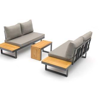 3-sed NOFI, 220x81cm, z blazinami, aluminij/tik 2-sed NOFI, 155x81cm z blazinami, aluminij/tik Fotelj NOFI, 80x81cm z blazinami, aluminij/tik Mizica NOFI, 70x120cm, aluminij/tik
