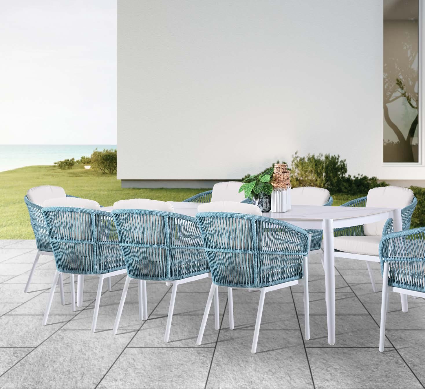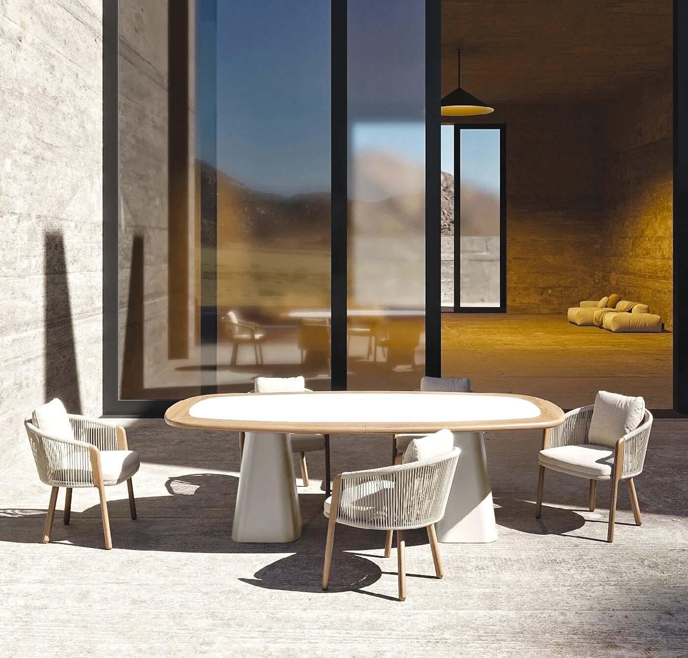 miza 120X230cm aluminij/keramična plošča/tik in 6x stol z blazinami, aluminij/tik/vrv