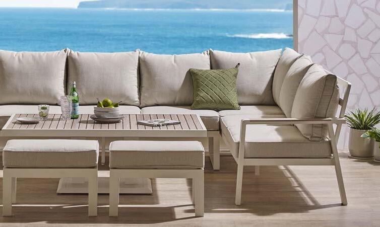 293x225cm, z blazinami, mizica 82x105cm, aluminij/tik/tekstilen
