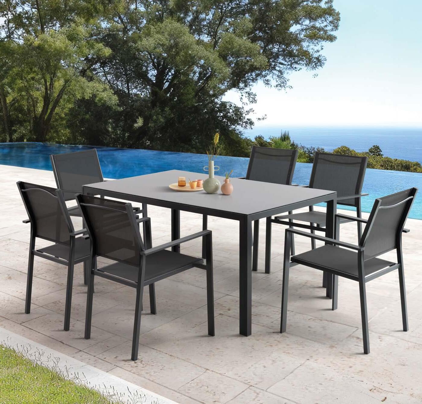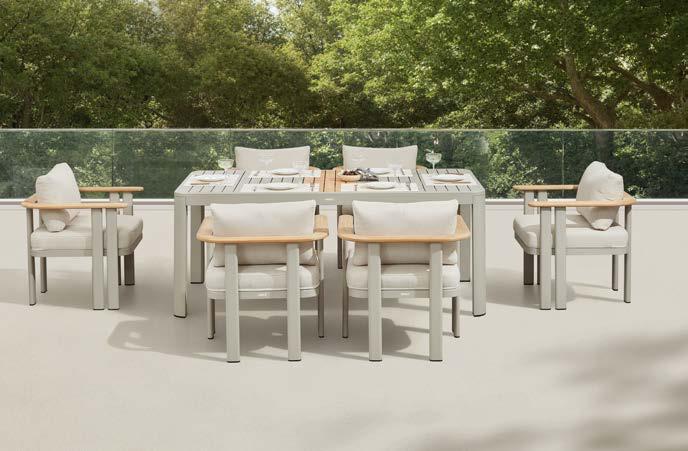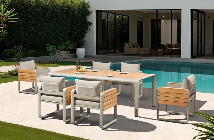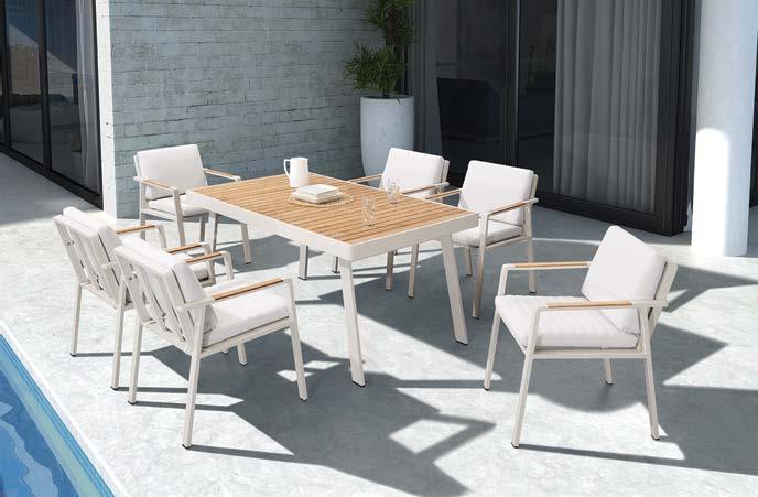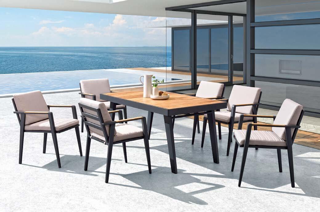 Set NOFI, 7 kosov, miza 90x180cm, 6x stol z rokonaslonom in blazinami, aluminij/tik