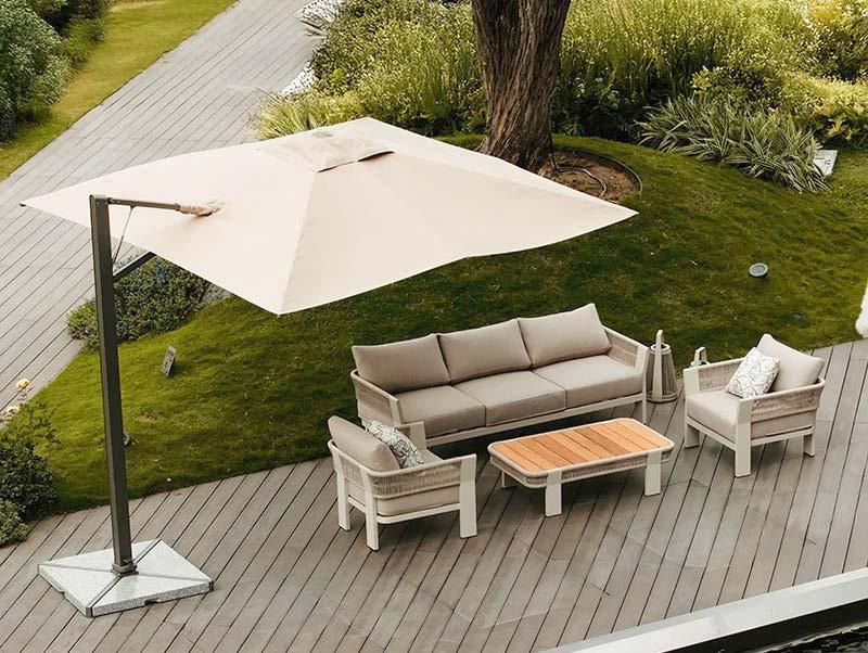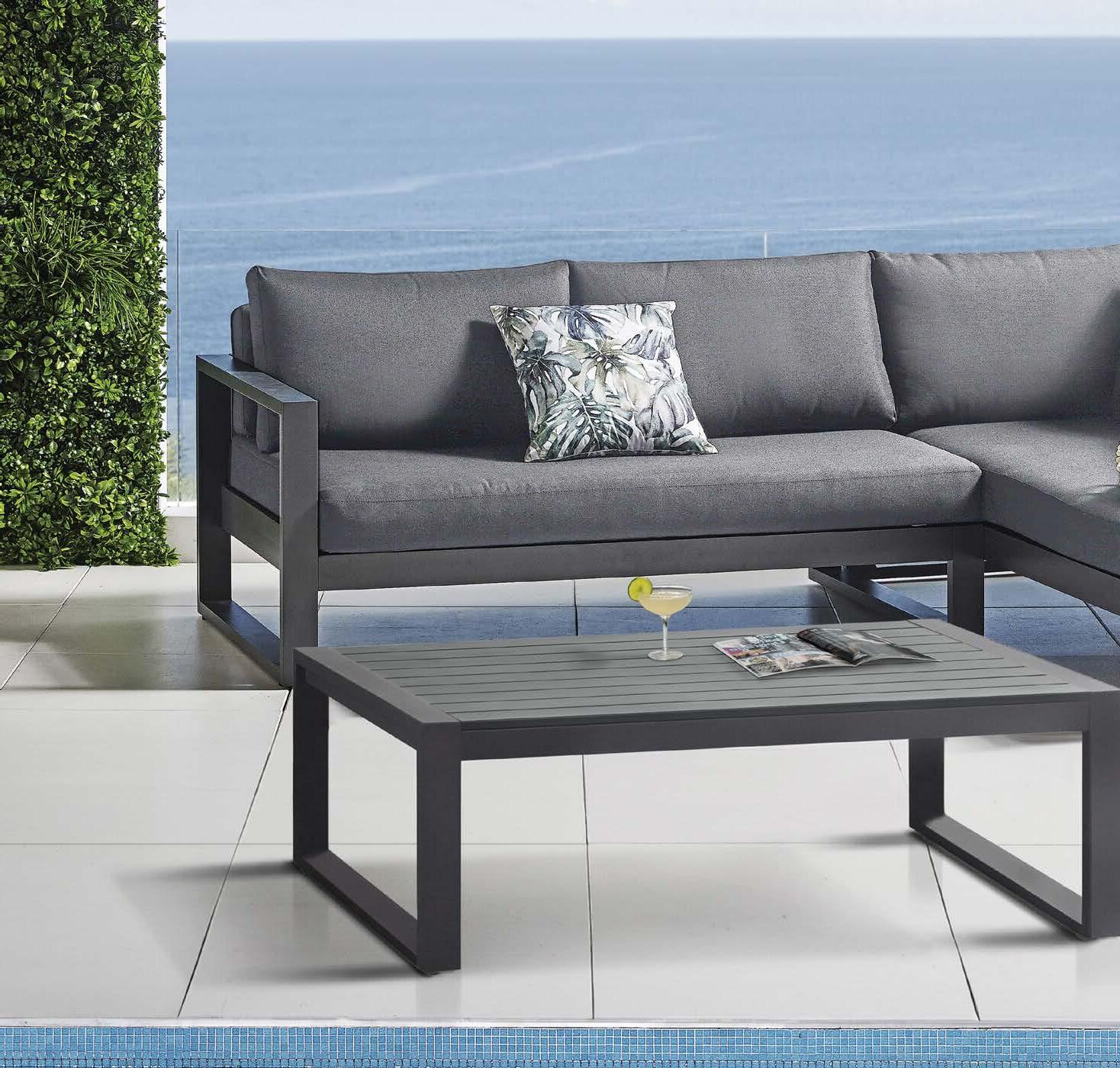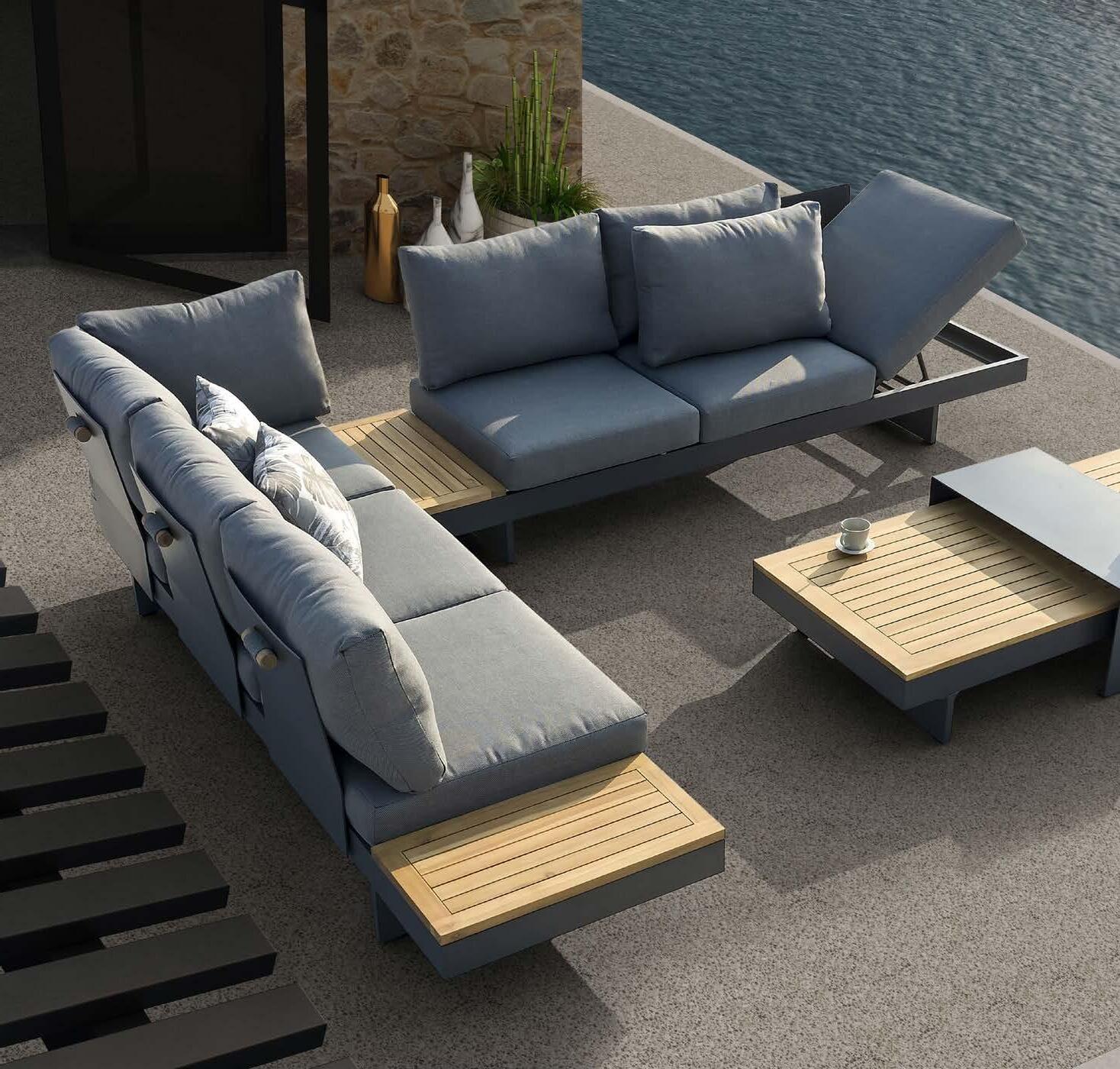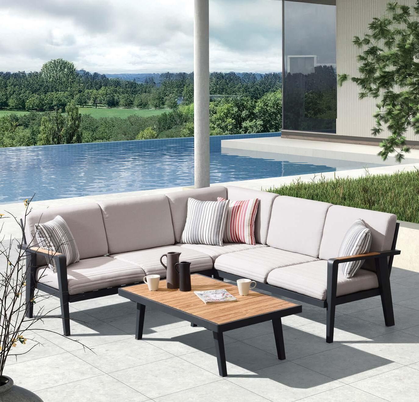 kotna sedežna garnitura 213x213cm z blazinami in mizica 70x120cm, aluminij/tik