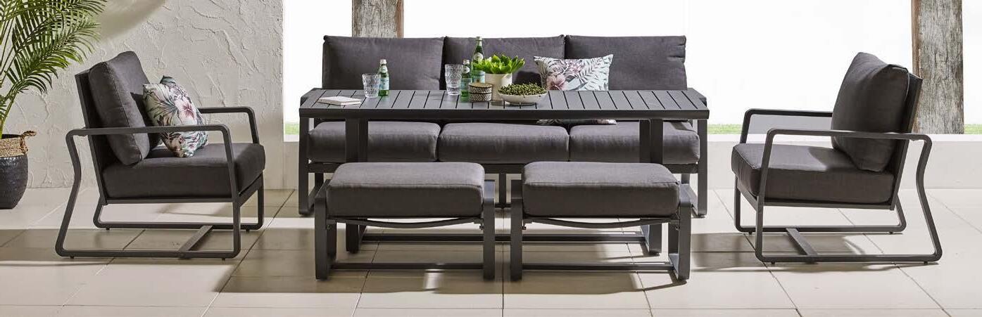 Set CARACAS, 5 kosov, dvižna miza 90x150cm, višina do 75cm, kotna sedežna garnitura z blazinami 221x288cm, fotelj z blazinami 81x95cm, 2x tabure z blazino 60x40cm, aluminij, antracit ali bež