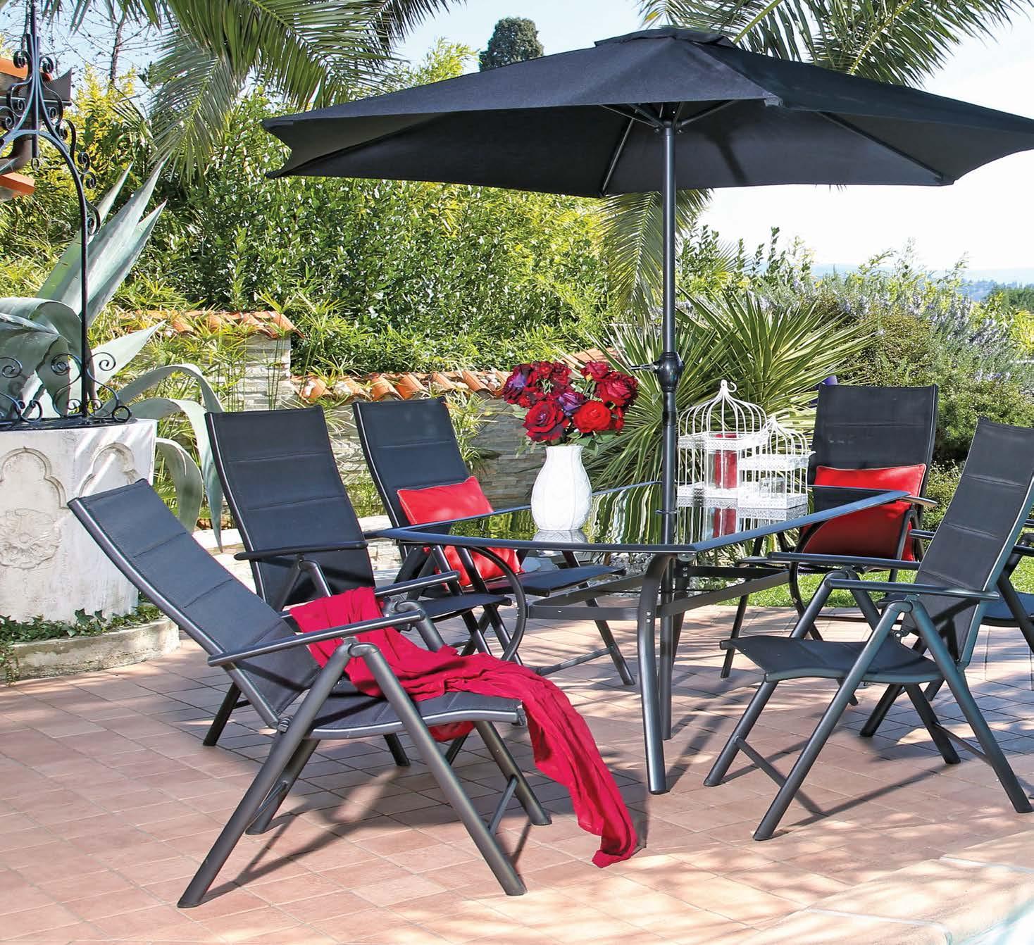 Set LIGO, 9 kosov miza 100x219cm, 8x stol z blazinami, aluminij, črna/črne blazine ali črna/zelene blazine