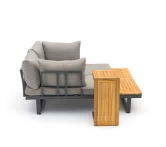 3-sed z blazinami 228x77cm s funkcijo dvižne mizice v rokonaslonu, 2x fotelj z blazinami 88x77cm s funkcijo dvižne mizice v rokonaslonu, mizica 80x120cm, stranska mizica 50x50cm, aluminij/tik