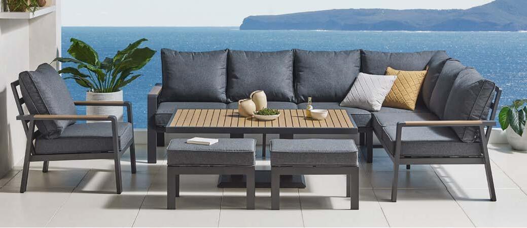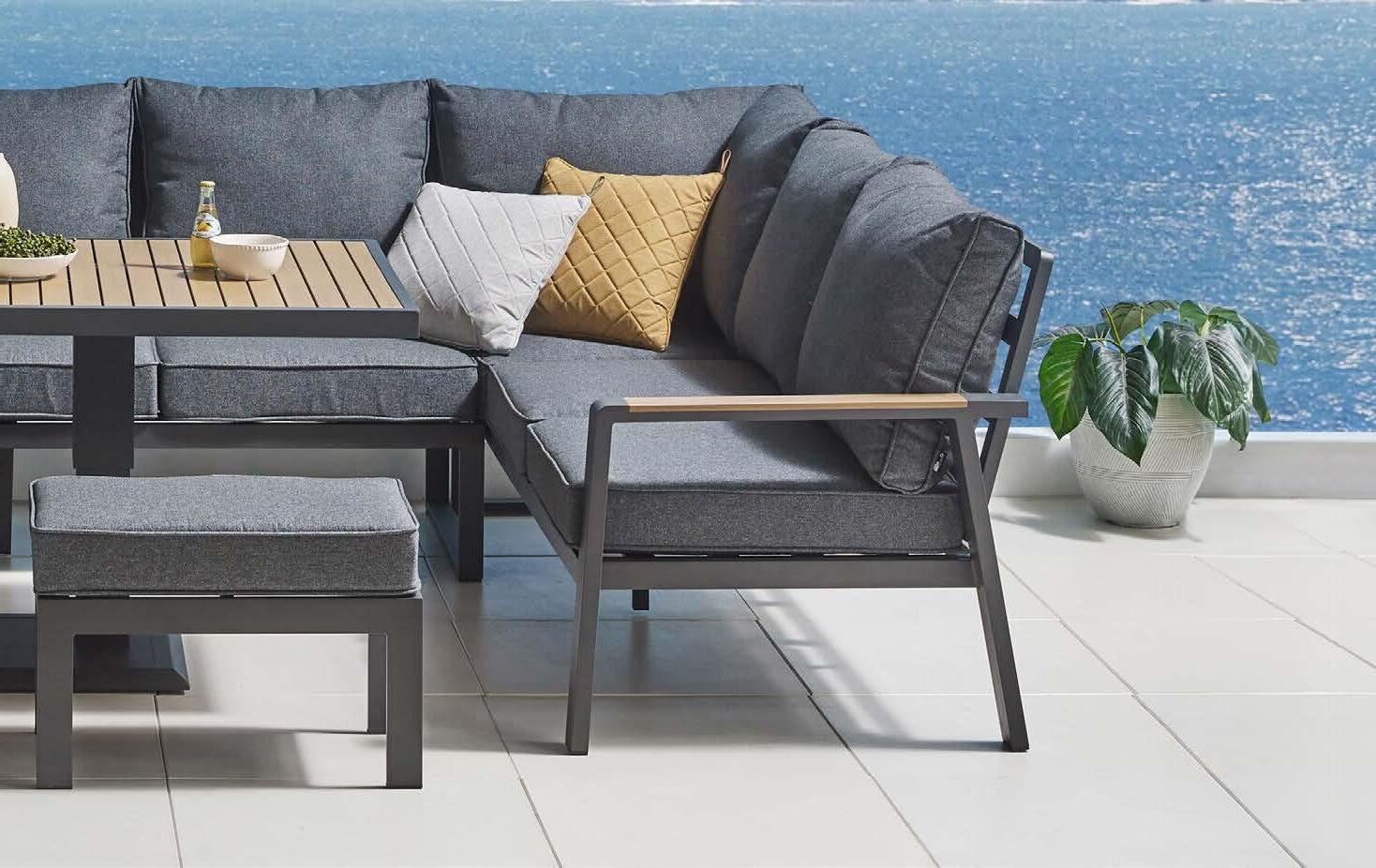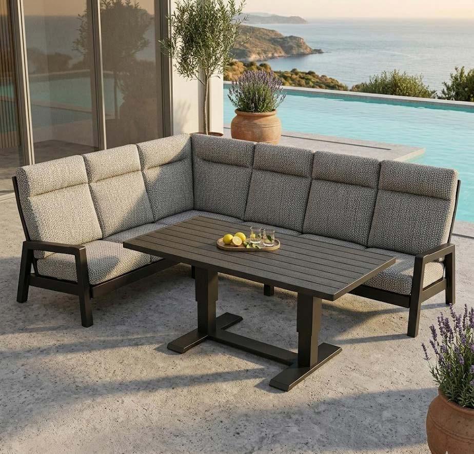 Kotna sedežna garnitura PIETRA z dvižno mizo 211x272cm, z blazinami, dvižna miza 85x160cm, višina 51-69cm, aluminij antracit/polywood