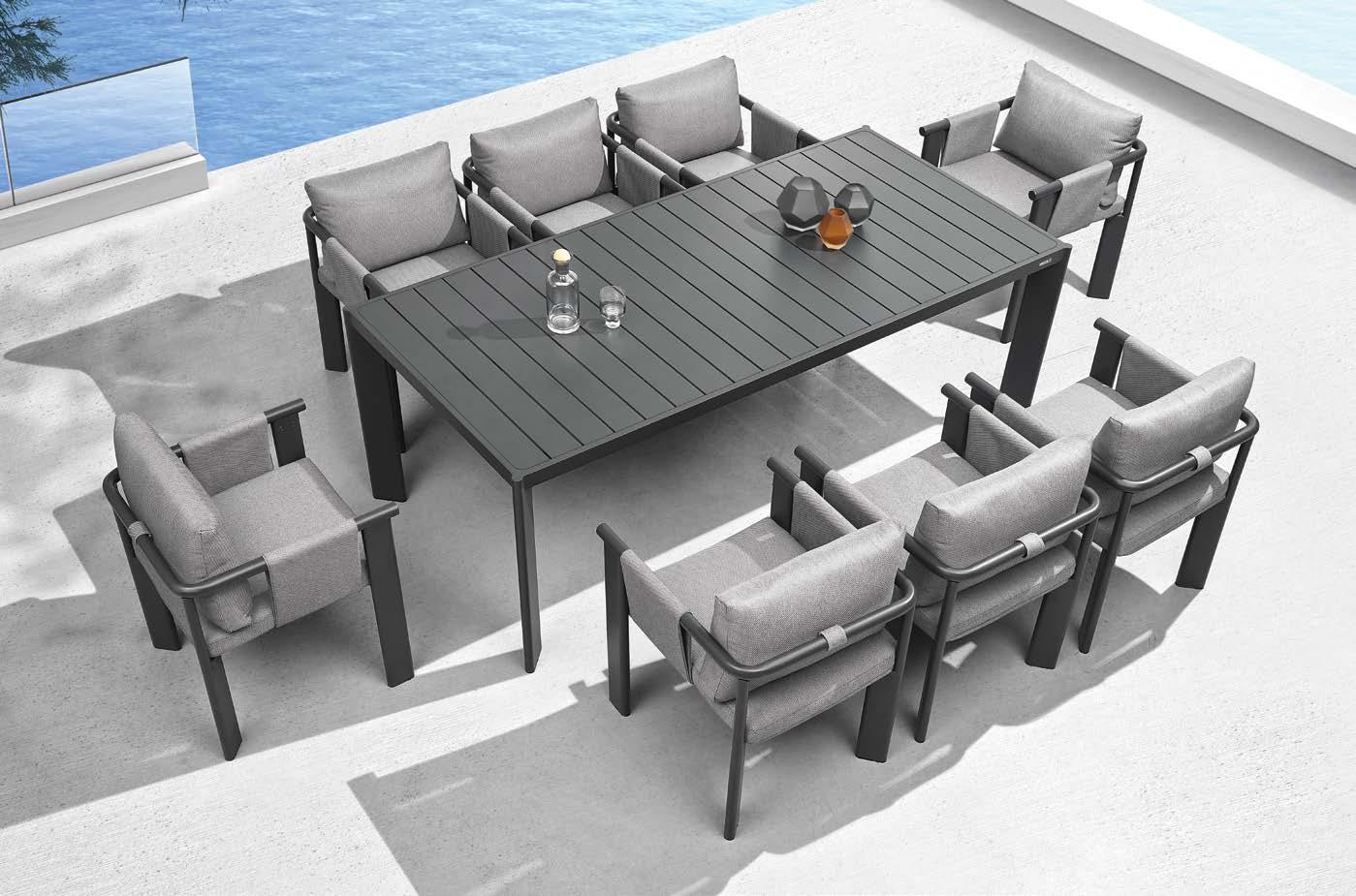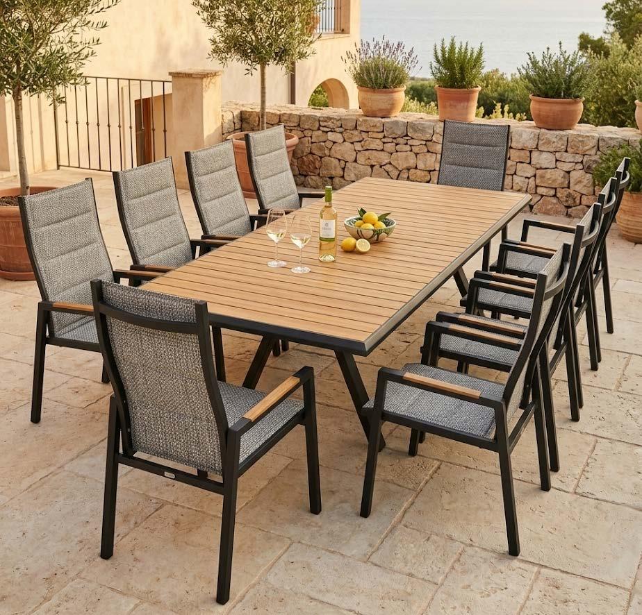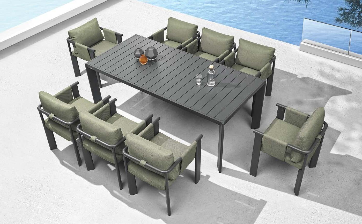 Set NOFI, 9 kosov, miza 90x220cm, 8x stol z rokonaslonom in blazinami, aluminij/tik