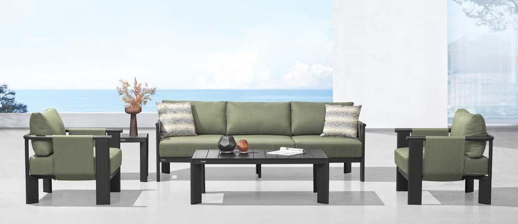 Set LIGO, 4 kosi, 3-sed z blazinami 212x77cm, 2x fotelj z blazinami 76x77cm, mizica 70x120cm, aluminij, črna/zelene blazine