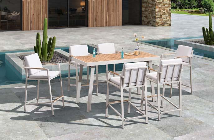 Set NOFI, 7 kos., barska miza 92x180cm, višina 107cm, 6x barski stol z blazinami, aluminij/tik