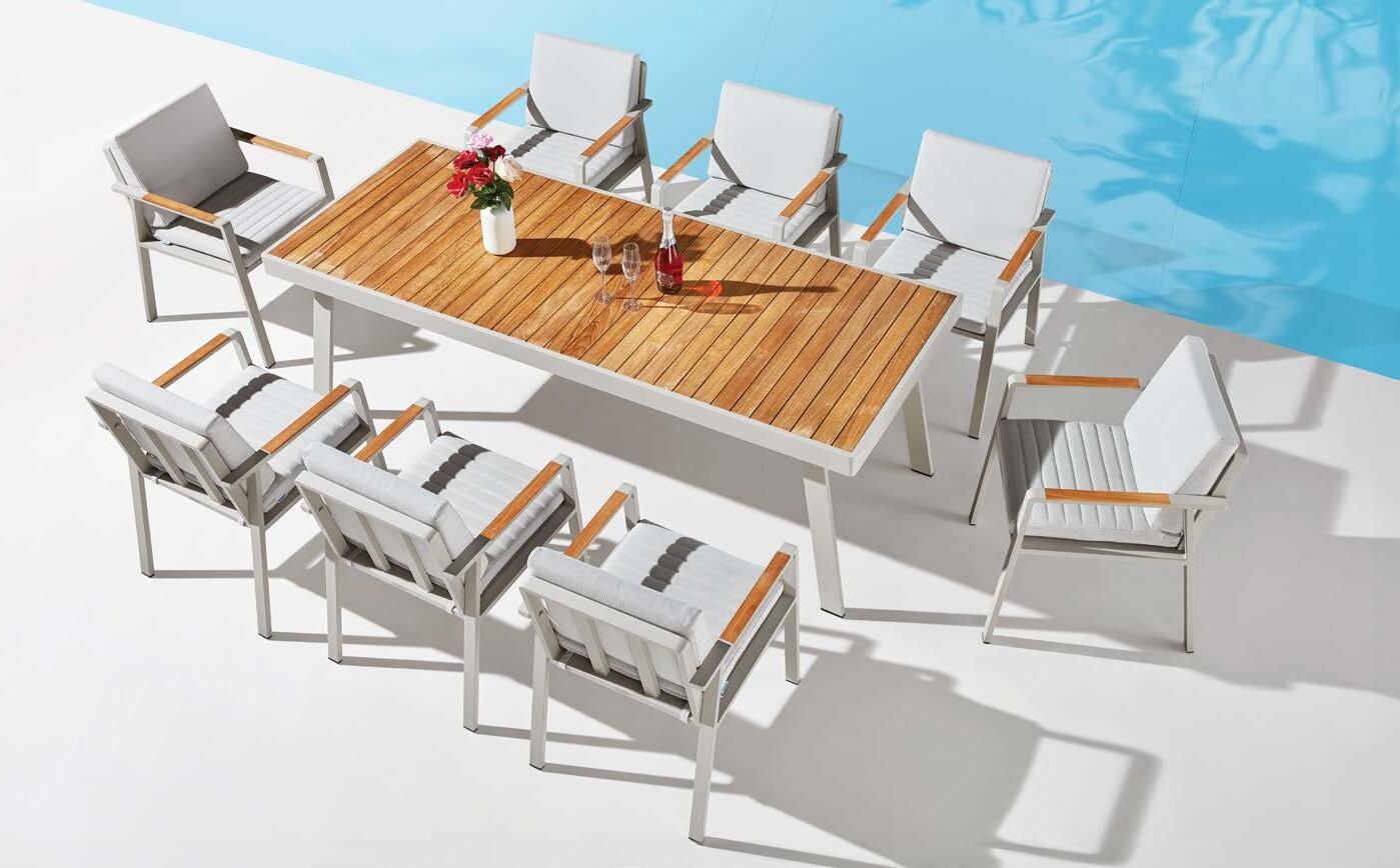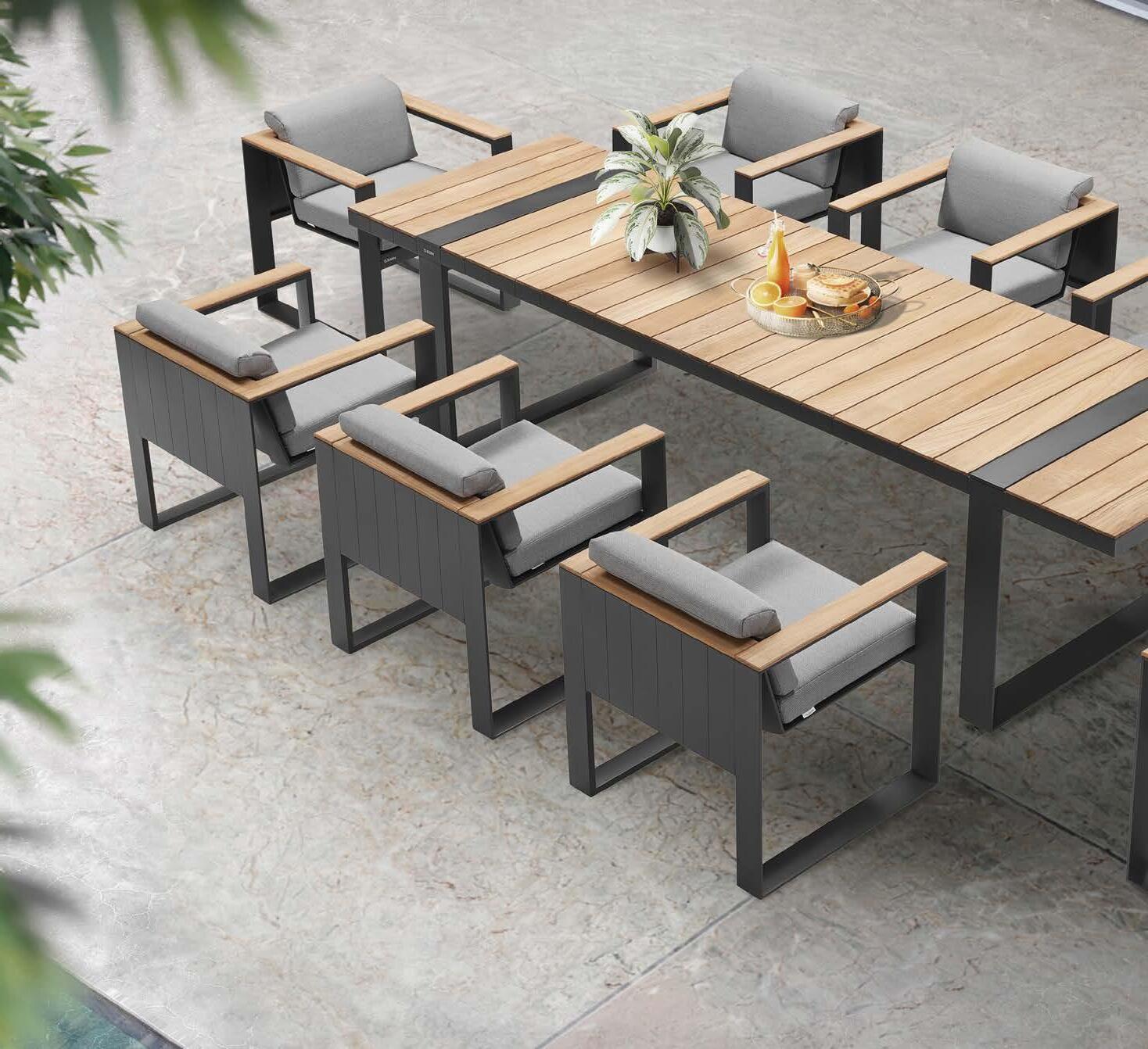 Set NOFI, 9 kosov miza 90x220cm, 8x stol z rokonaslonom in blazinami, aluminij/tik
