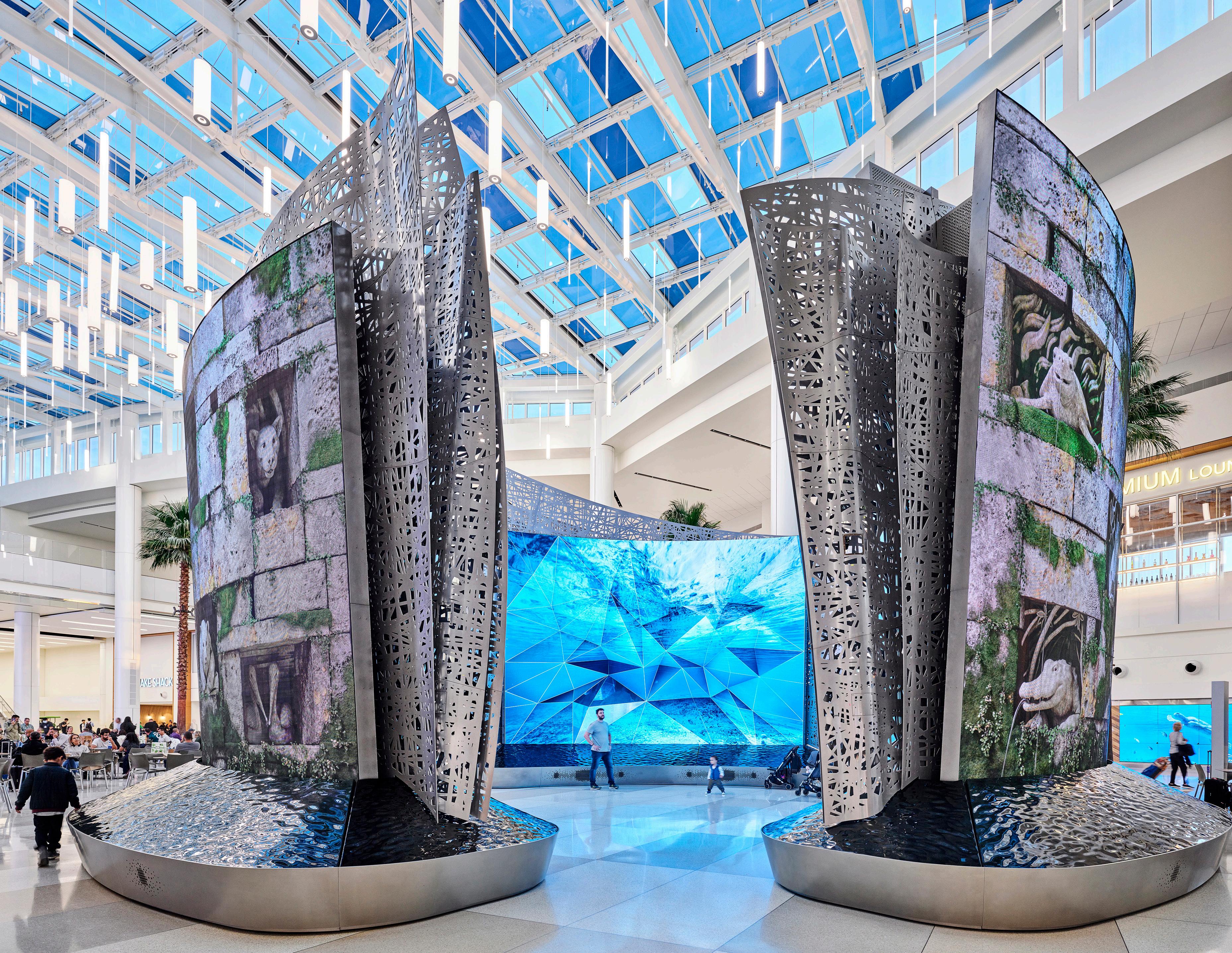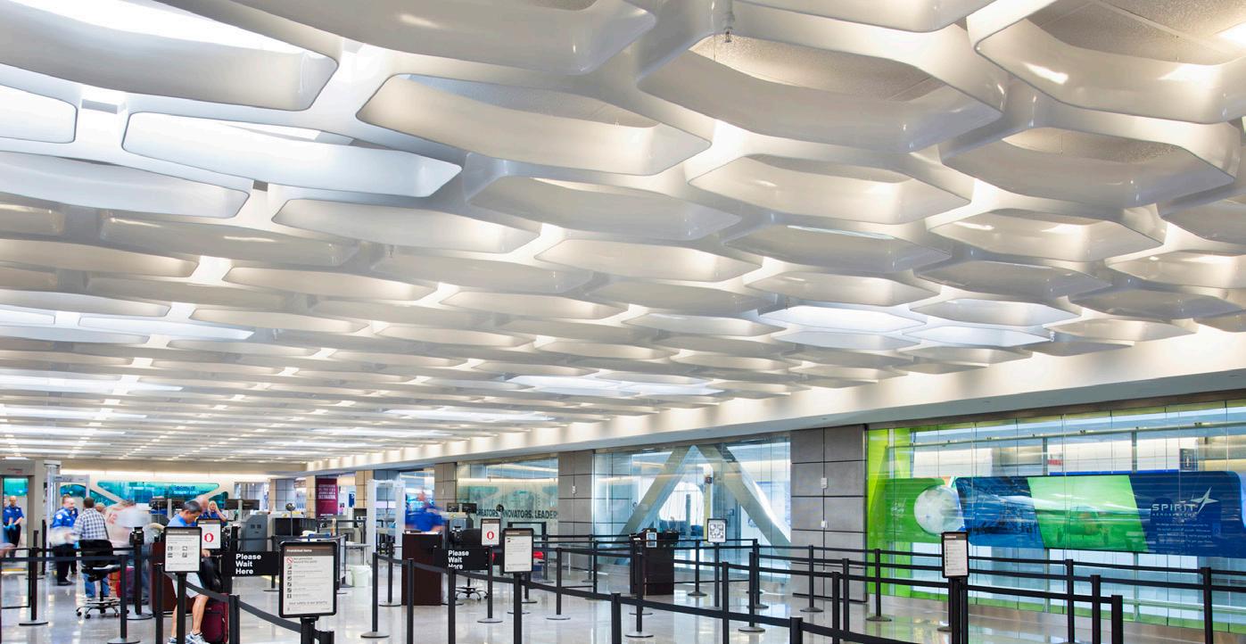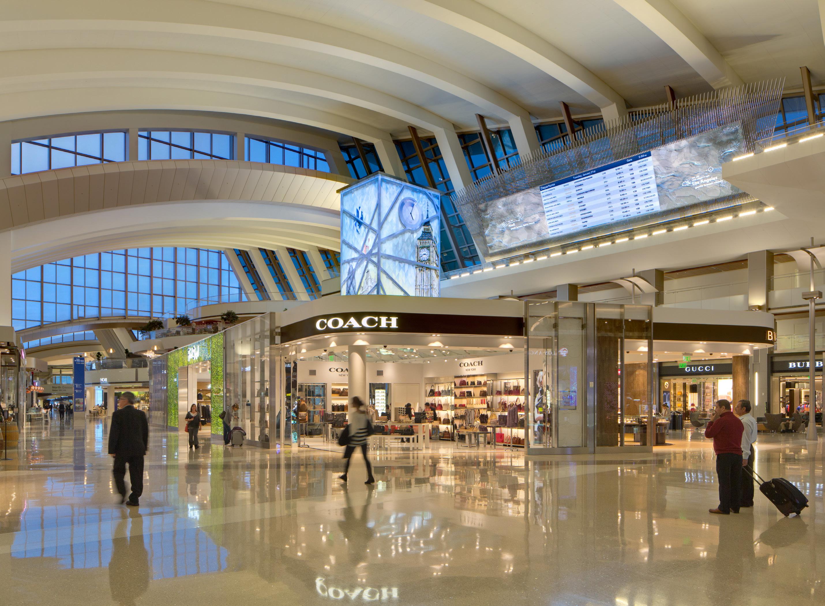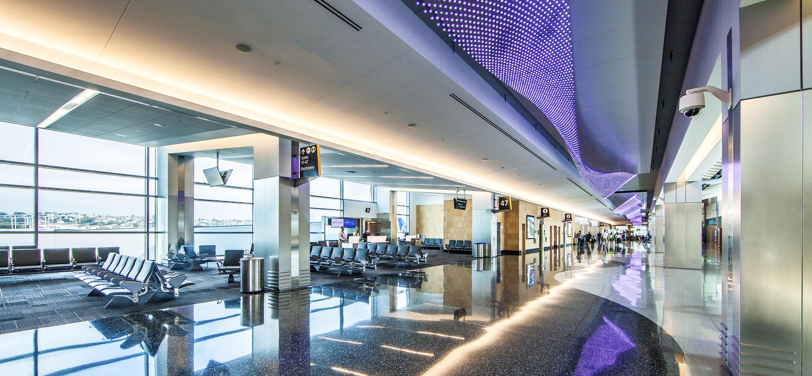 HNTB’s design achieved the world’s first LEED Platinum certification for a commercial airport terminal. Designers incorporated sustainable elements such as natural daylighting in the Sunset Cove atrium, reducing power consumption. Pre-conditioned air and a 400-Hz ground power gate system allow aircraft to turn off their engines and auxiliary power unit, reducing air emissions and fuel costs. Additional sustainable design efforts saved the airport approximately 4 million gallons of water annually. The terminal includes an entertainment stage, upscale airline clubs with magnificent views, a meditation room, significant integrated public art and the nation’s first post-security service animal relief area.
