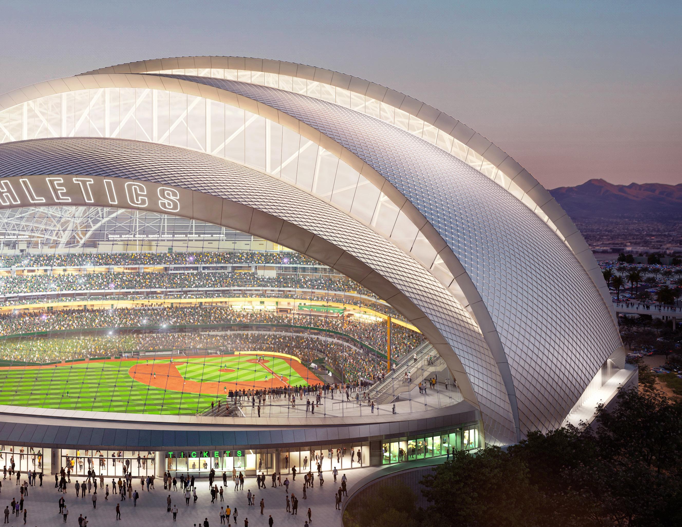 Shaped by its location on the Las Vegas Strip, the A’s new 33,000person capacity ballpark provides an outdoor feel with views of the city’s skyline. The tiered design will split upper and lower seating bowls to bring fans closer to the action than traditional ballparks and provide clear sight lines from every seat. The roof’s five overlapping layers, whose design is inspired by traditional baseball pennants, open to the north to allow for natural light and views up the Strip, while also limiting direct sunlight and heat from the south. The outfield features the world’s largest cable-net glass window, facing the corner of Tropicana and Las Vegas Boulevards. The ballpark is currently designed to include an 18,000-square-foot jumbotron, which would make it the largest screen in MLB.