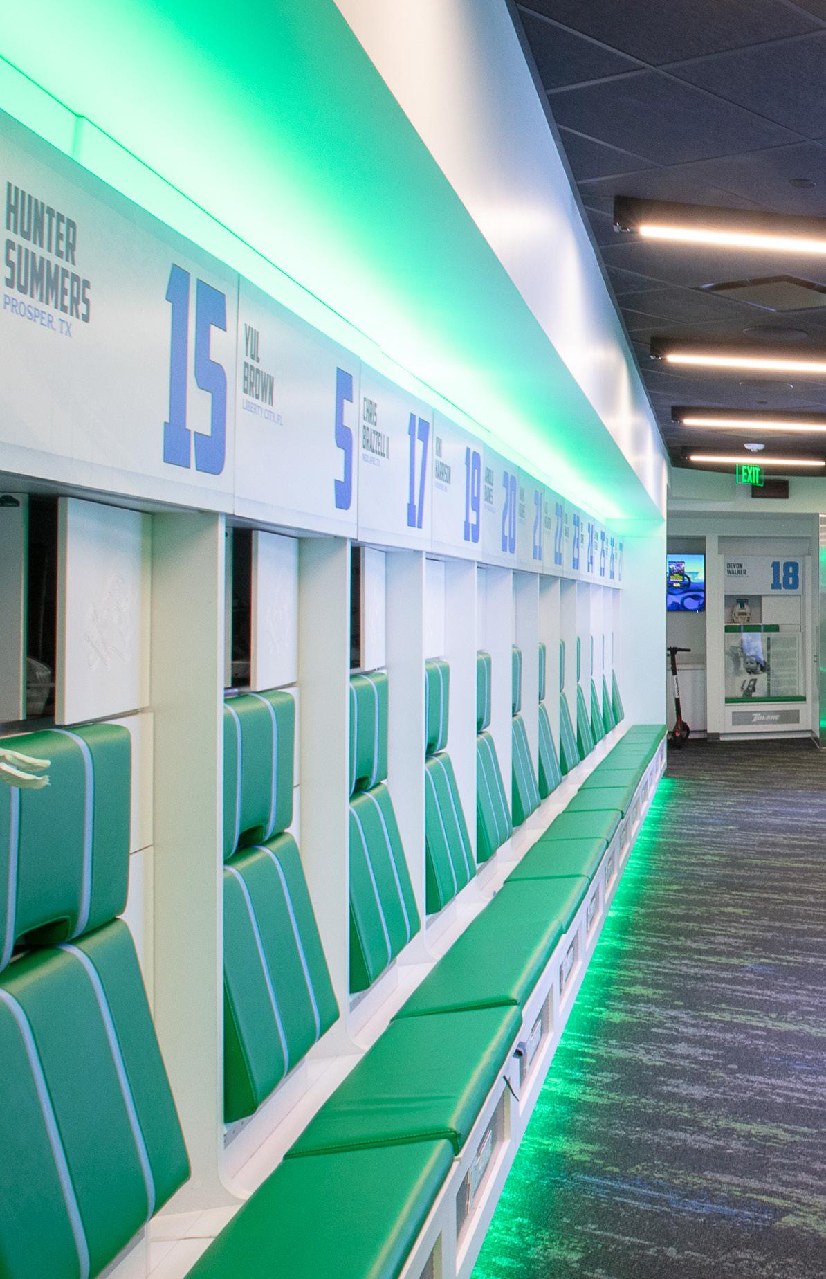 When entering the locker room area from the main corridor, recruits and players pass through a portal element made with LED lighting. There is also an area for nutrition distribution.. Featuring 126 custom lockers, the new space includes integral power for charging, lighting, upholstered seats and backrests and ventilated storage compartments. There are 4 large LED matrix displays that can be utilized for recruiting, daily team messaging and post-game victory celebrations. The locker room also features large-scale branding and a Nike gear wall to reinforce the Green Wave culture. The player shower and restroom area were also upgraded through the incorporation of new fixtures, finishes and lighting. The training room received new flooring, millwork, lighting and branding that speaks for all Tulane athletes. The renovated hydrotherapy suite includes new pools and material finishes.