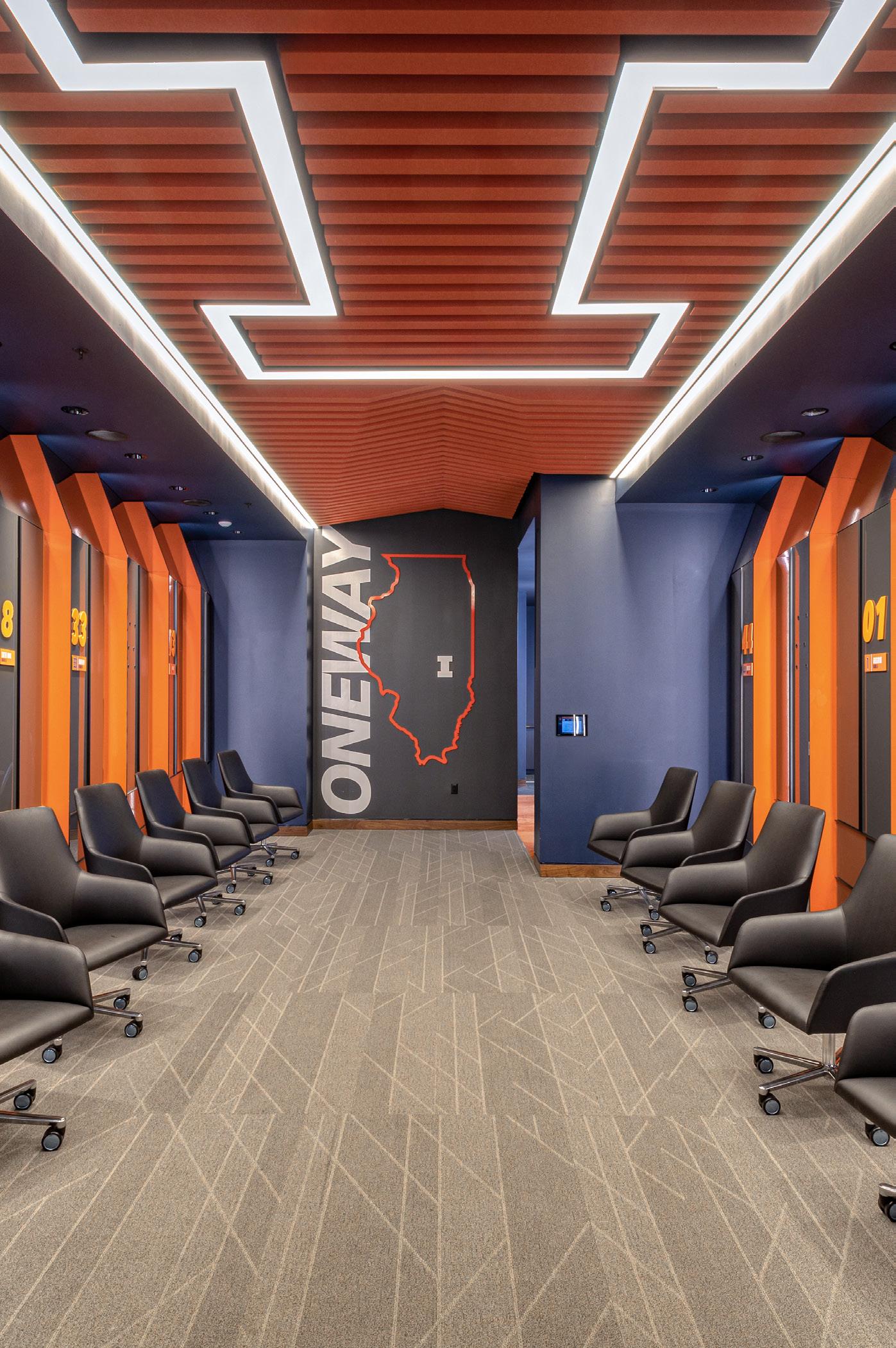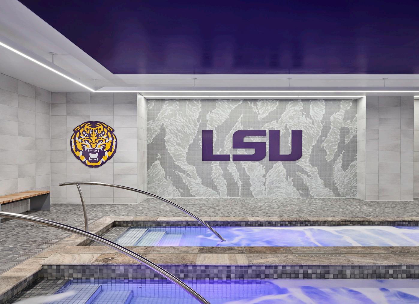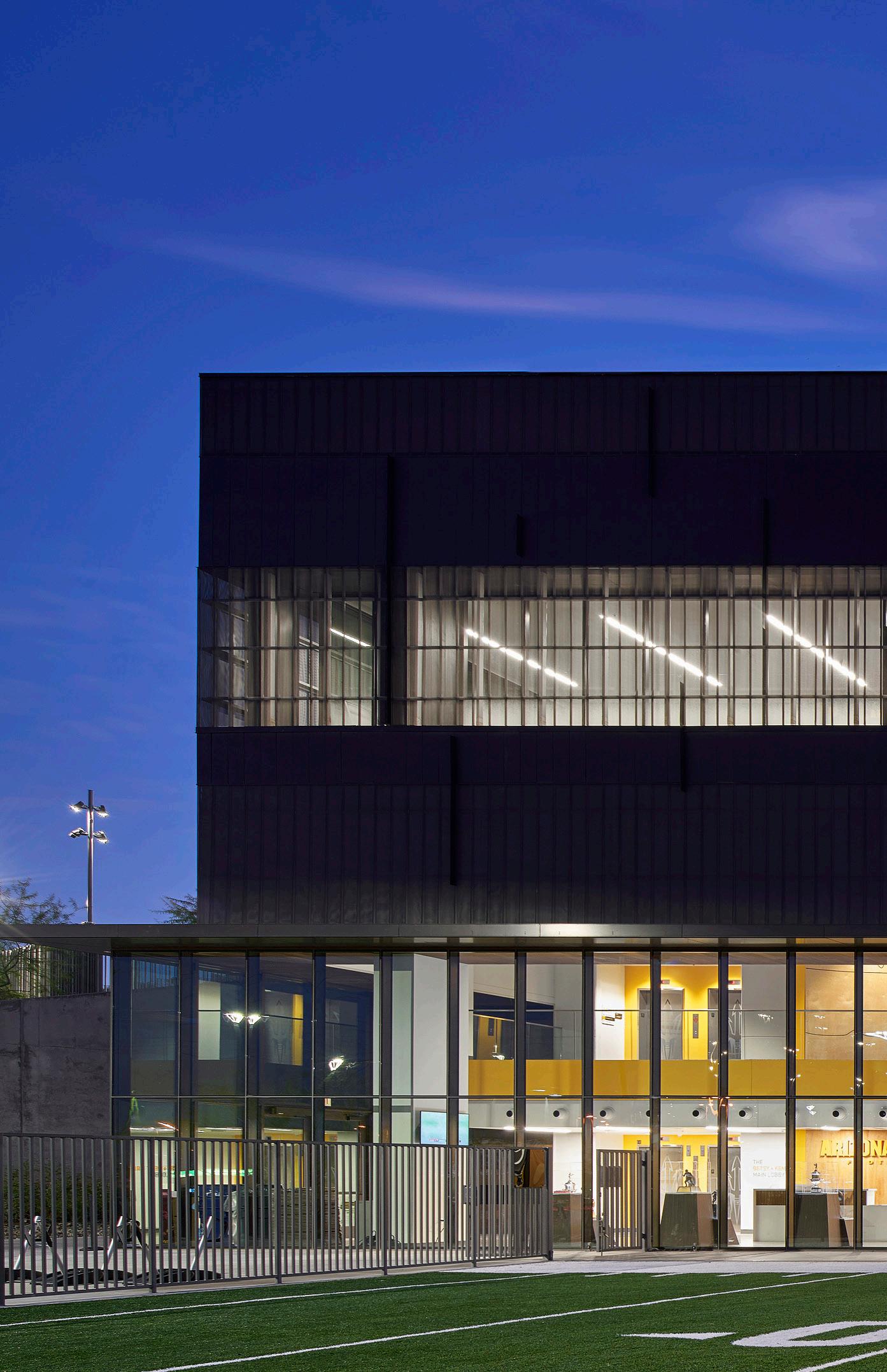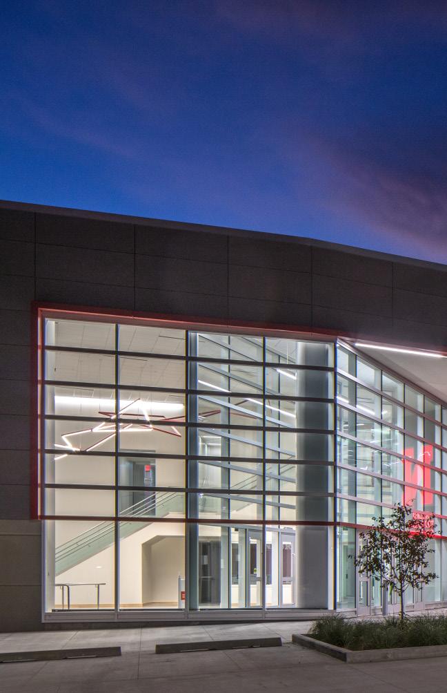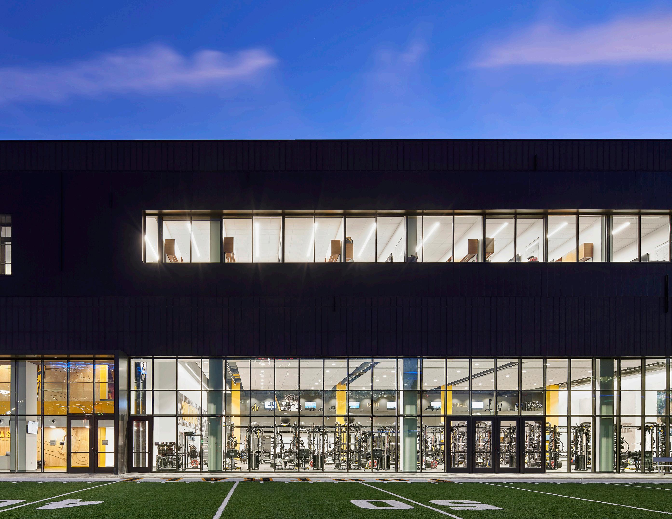 The new Bloom Football Performance Center is a 160,000+ squarefoot, stand-alone facility crafted to serve as the hub of USC’s football program. The facility includes a lobby with immersive displays and graphics that highlight USC’s storied history, two full-length practice fields and a locker room with direct access to hydrotherapy and recovery pools. The cutting-edge sports medicine suite features an adjoining cool down pool, while the weight room seamlessly connects to outdoor practice areas. Multi-level lounges, both indoor and outdoor, foster team cohesion and provide athletes with relaxing spaces. The facility also features a two-story team meeting room, 12 position-specific meeting rooms that support collaboration and development and dedicated office spaces for staff with views of the outdoor terrace and practice fields. Designed with future growth in mind, this project supports USC’s transition to the BIG 10 Conference and reflects a commitment to providing world-class facilities that will benefit studentathletes for decades.