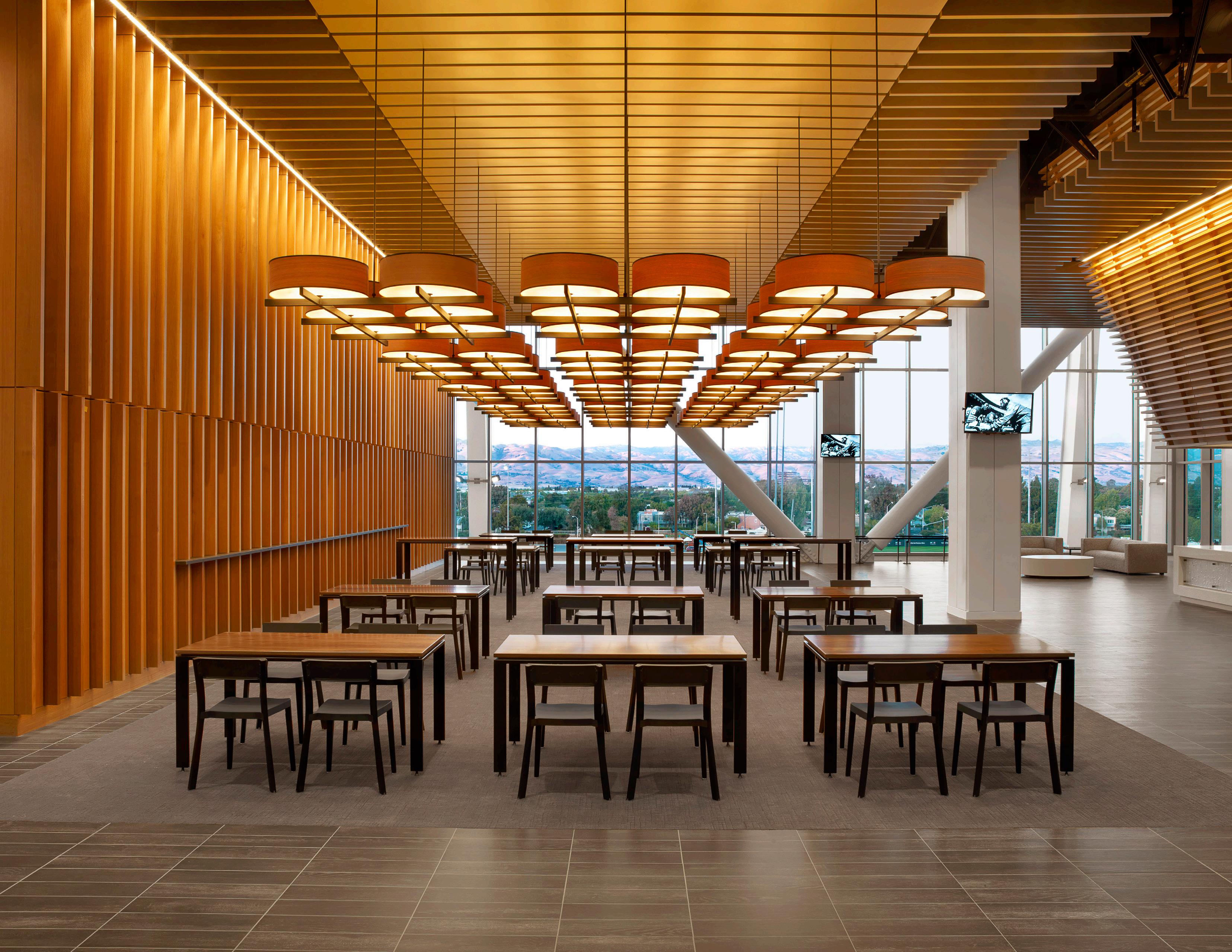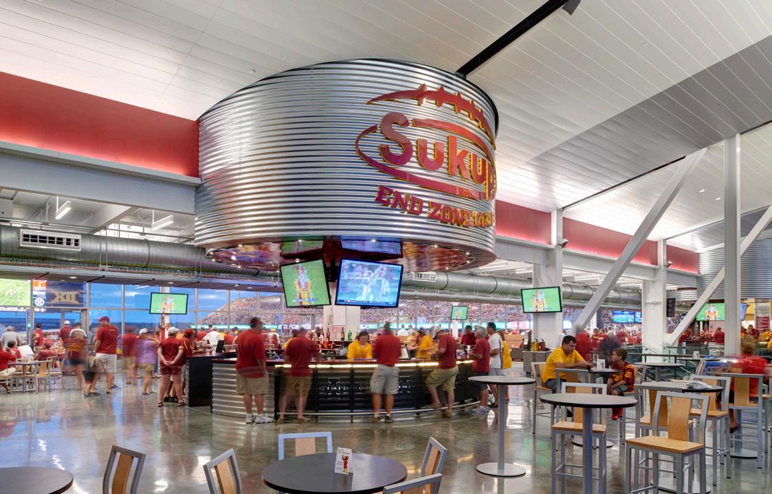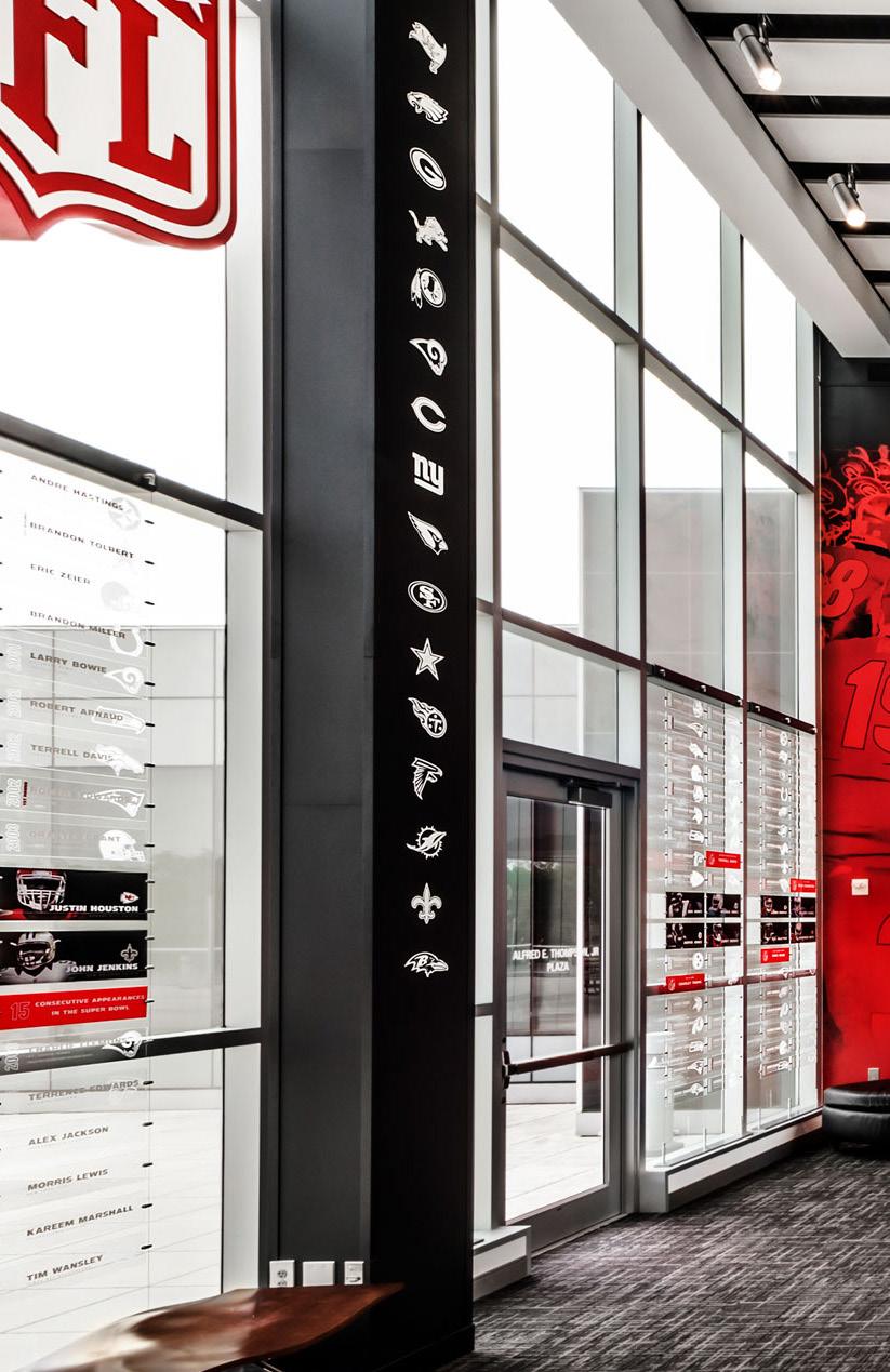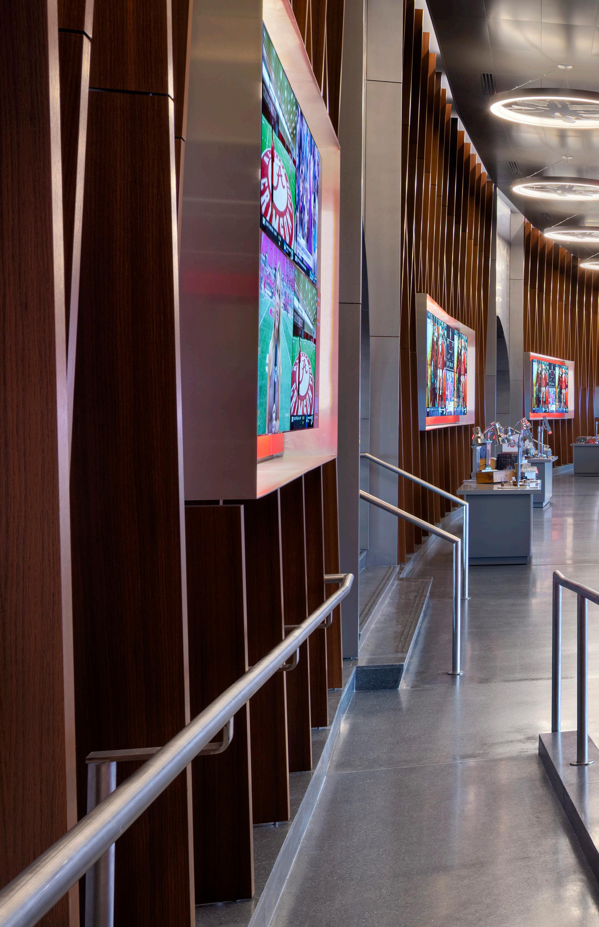 The new Bloom Football Performance Center is a 160,000+ squarefoot, stand-alone facility crafted to serve as the hub of USC’s football program. The facility includes a lobby with immersive displays and graphics that highlight USC’s storied history, two full-length practice fields and a locker room with direct access to hydrotherapy and recovery pools. The cutting-edge sports medicine suite features an adjoining cool down pool, while the weight room seamlessly connects to outdoor practice areas. Multi-level lounges, both indoor and outdoor, foster team cohesion and provide athletes with relaxing spaces. The facility also features a two-story team meeting room, 12 position-specific meeting rooms that support collaboration and development and dedicated office spaces for staff with views of the outdoor terrace and practice fields. Designed with future growth in mind, this project supports USC’s transition to the BIG 10 Conference and reflects a commitment to providing world-class facilities that will benefit studentathletes for decades.