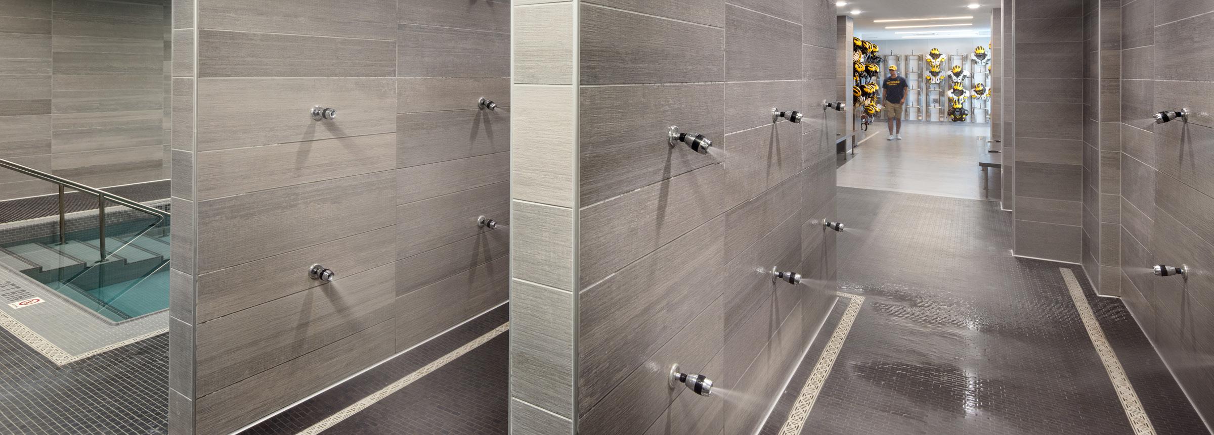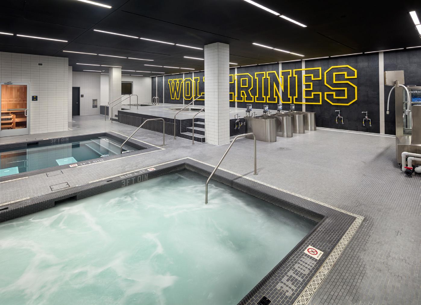 Player recovery is a point of emphasis at Michigan. HNTB created a space that allows for recovery to begin the moment the players finish practice. Wolverine players exit the practice field and enter an equipment drop-off room, shower and immediately go into a 100-footlong cold-water recovery pool.