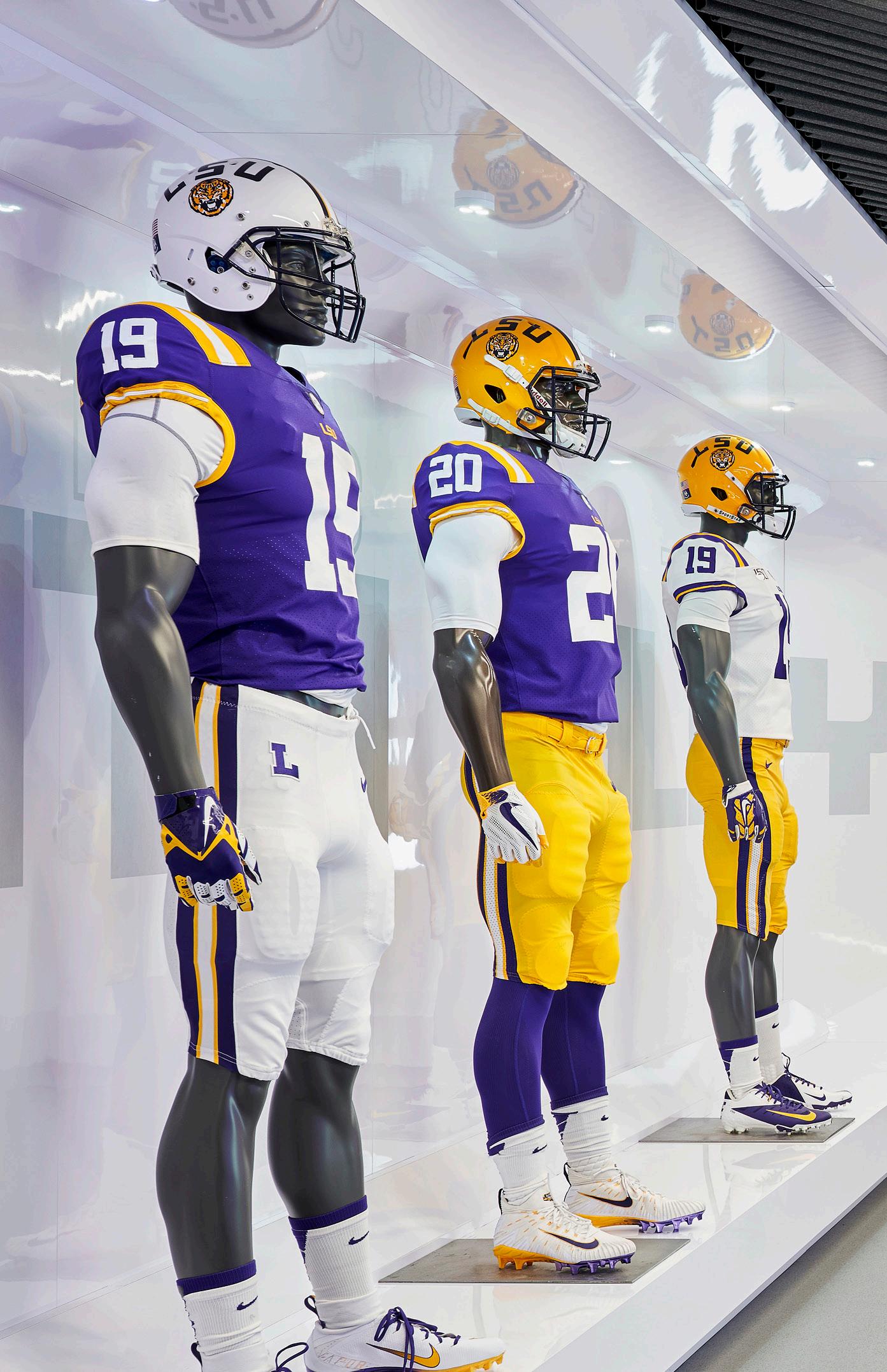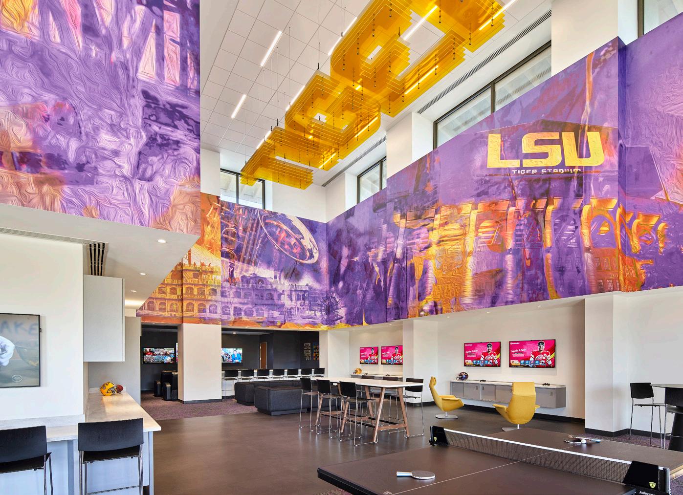 Designed in a collaborative effort between HNTB and RHH Architects, the renovated LSU Football Operations Center has redefined function and purpose, solidifying the Tigers their position as having one of the top football complexes in the nation. The signature feature of the project is a new state-of-the-art locker room that emphasizes player comfort and recovery, which is complemented by an integrated player’s lounge. The new, 9,100-SF locker room space redefines how a football program thinks about these spaces. Each athlete is provided with a highly functional multi-use locker pod that not only creates a first-class experience for players, but also integrates sports science so athletes can rest, refuel and recover in their individual space. The negative air pressure system integrated into each upper and lower storage compartment allows for a cleaner and more comfortable space to enjoy during recovery periods.