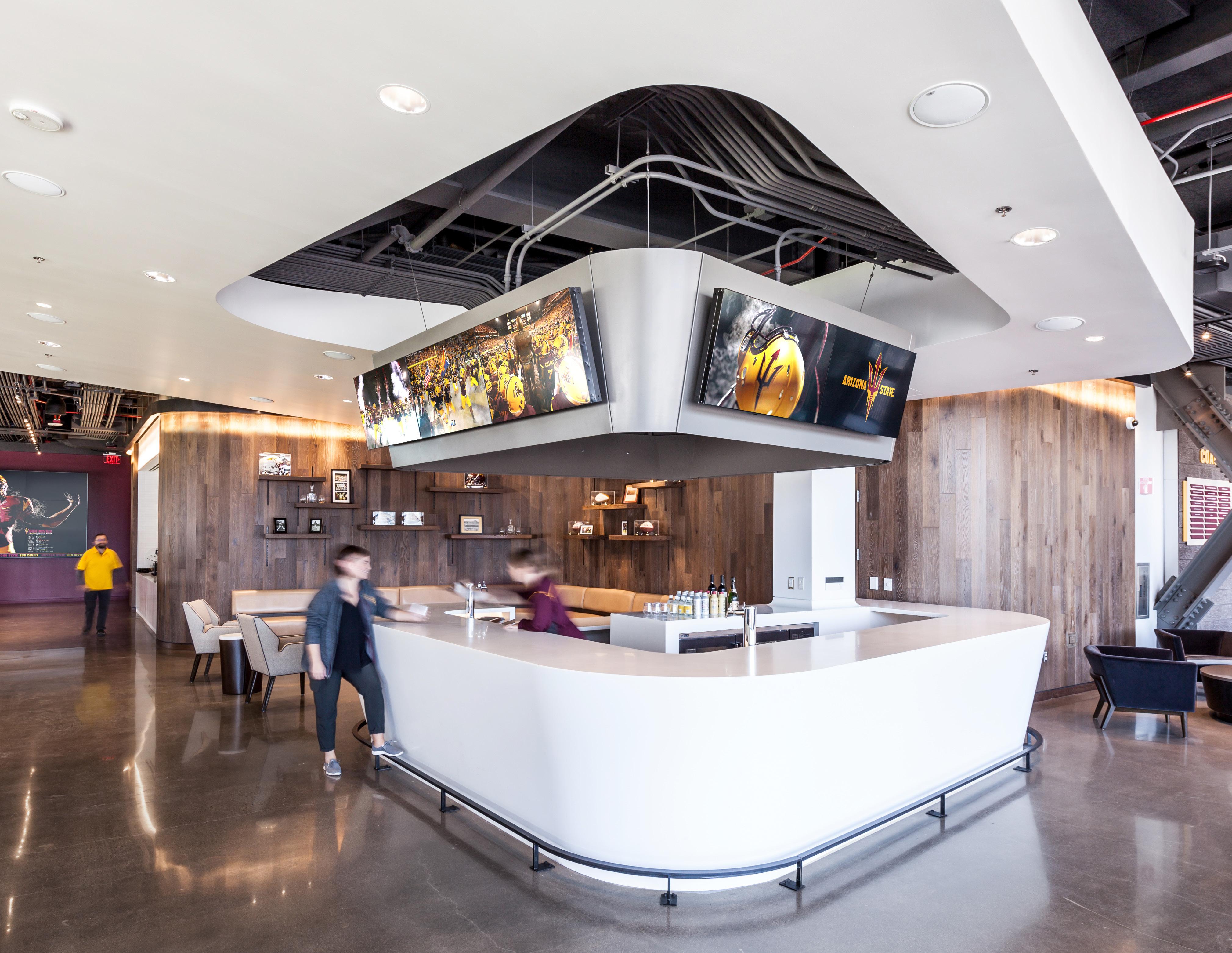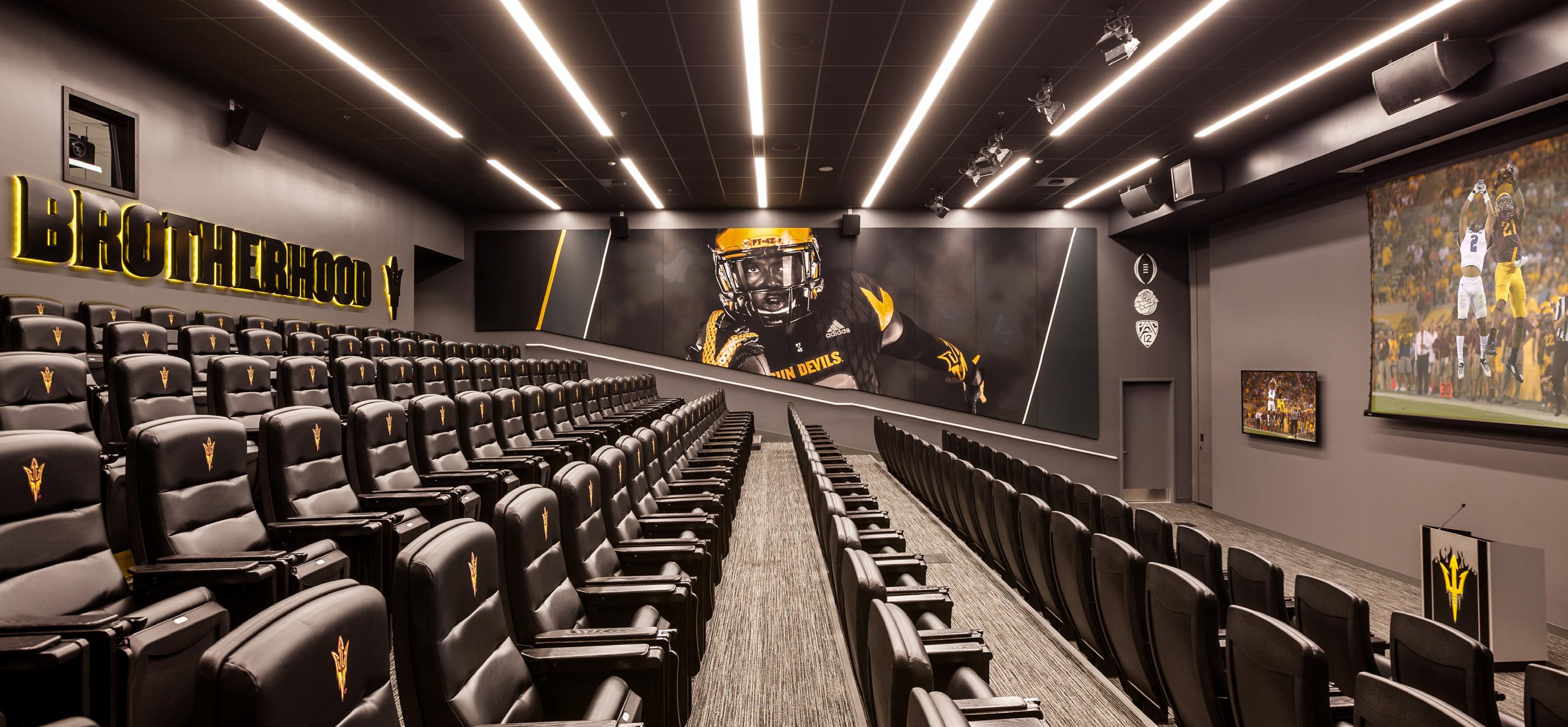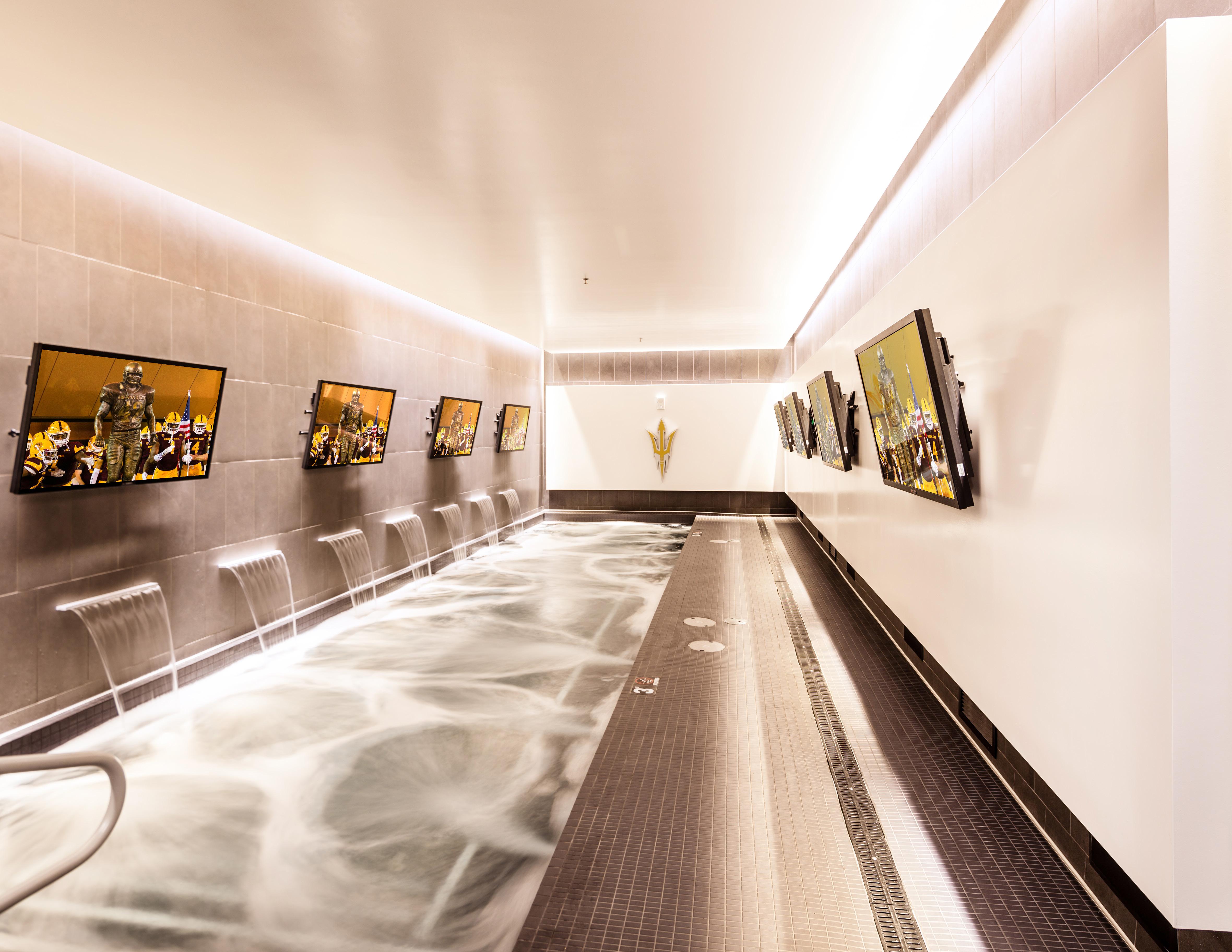 The center also offers a modern training and sports medicine center with hydrotherapy pools, a theater that accommodates the entire football team and a player lounge for studying and relaxing. Other amenities include a full-service kitchen, team locker rooms, coaches’ offices and recruiting and position meeting rooms. Environmental graphics and sophisticated digital display systems throughout the building are branded with Sun Devil accomplishments and traditions that instill pride and promote ASU as a world-class institution and a premier football program.