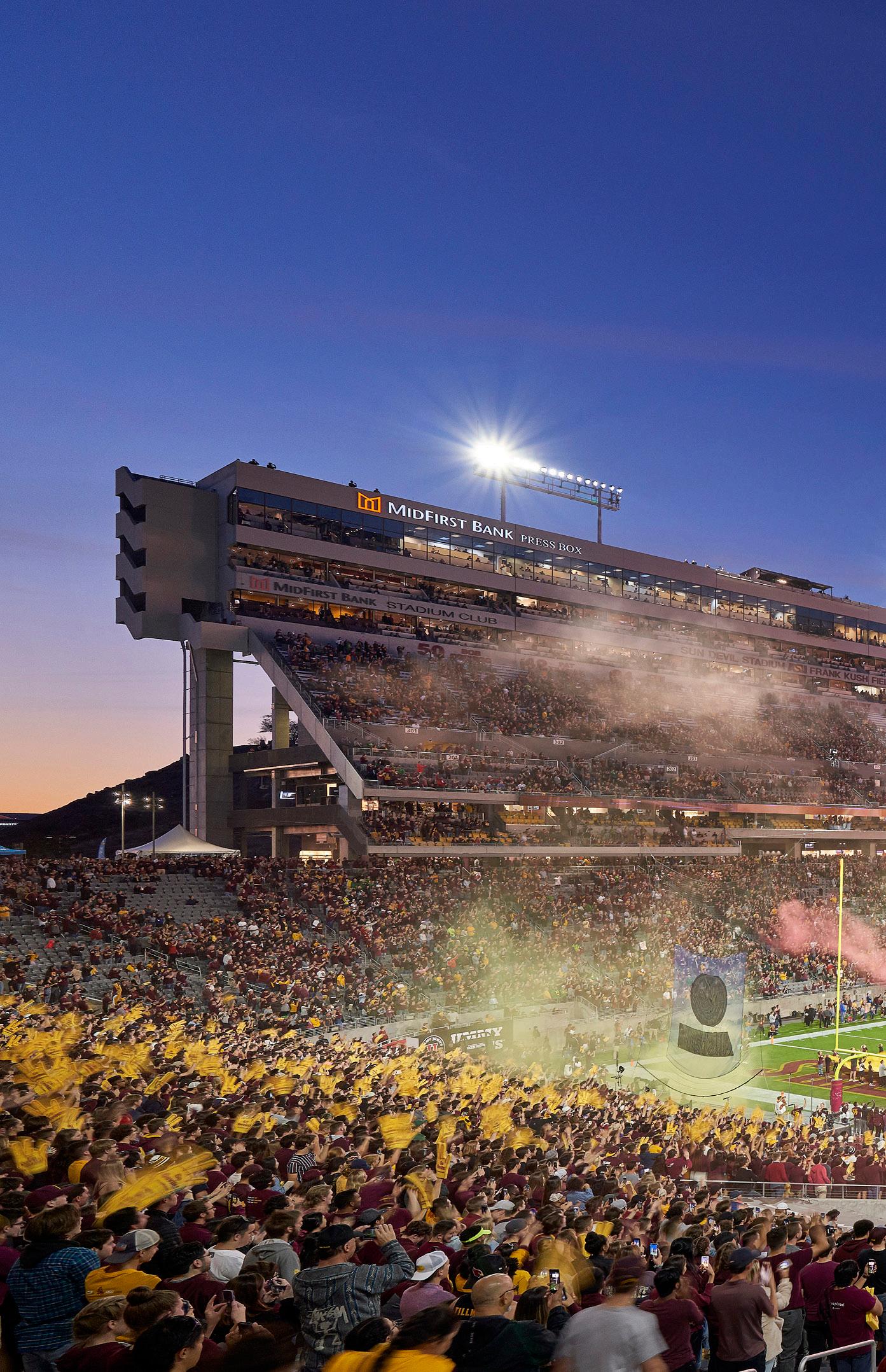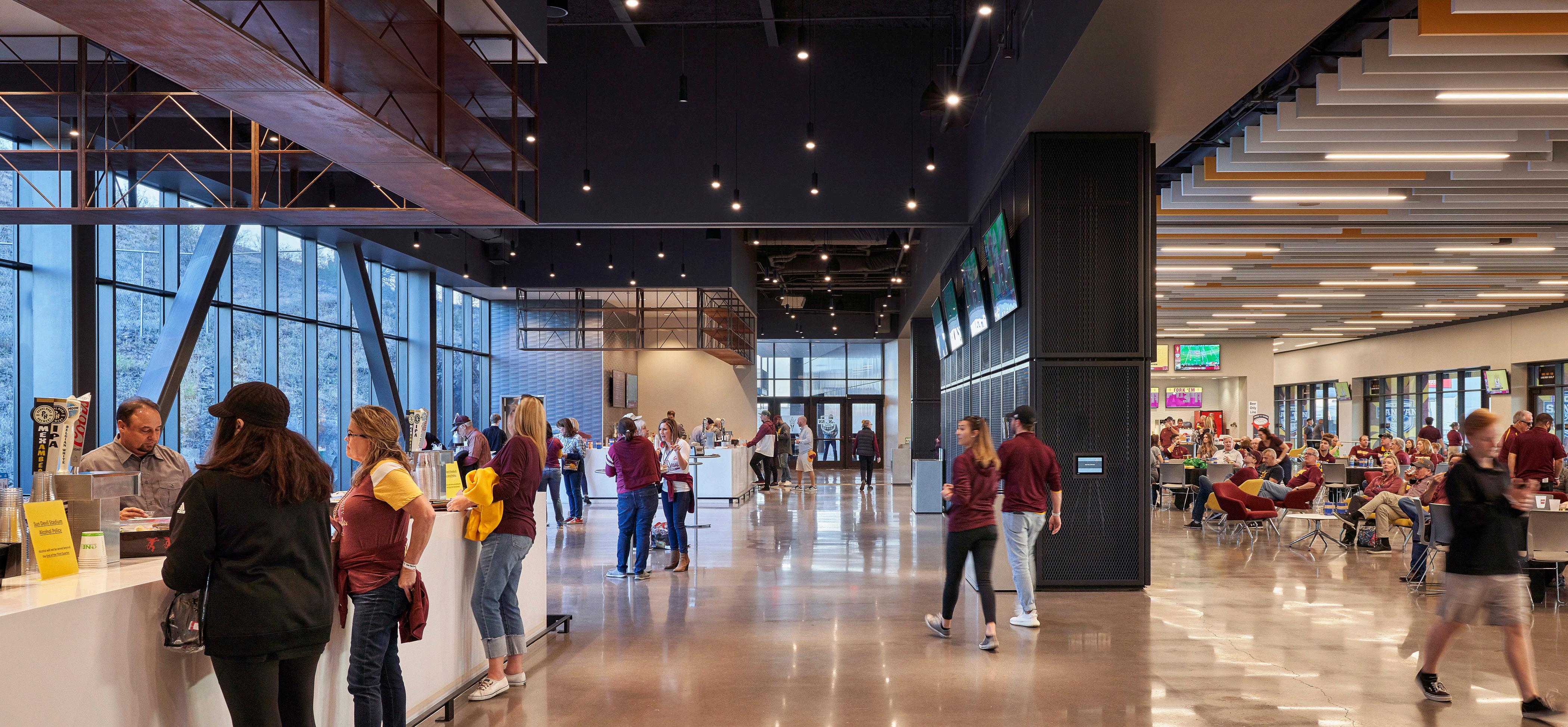 Integrated within the north end zone of Mountain America Stadium is a new 106,000-SF facility that supports the sports performance, sports medicine and nutritional needs for ASU’s football program. Players can meet with their academic advisors, receive medical attention or prepare for practice, train in a spacious strength and conditioning area or meet their dietary and nutritional needs at the dining area.