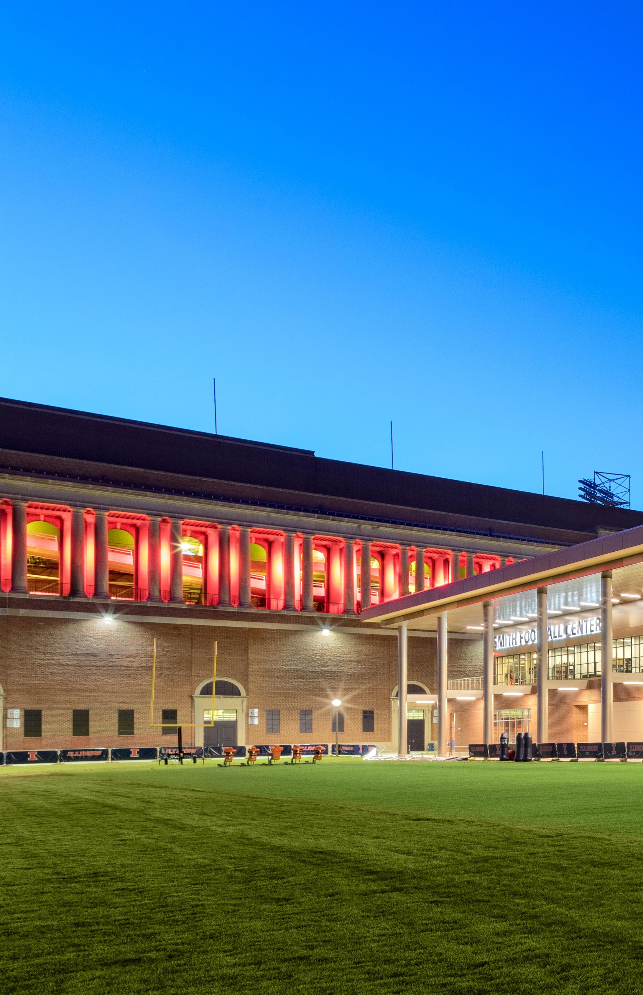 X Knowing that a cutting edge performance center is key to recruiting the best players, the university teamed HNTB’s design team to deliver world-class amenities for the Fighting Illini. The new facility is adjacent to the renovated Memorial Stadium, and connected to the Irwin Indoor Practice Facility, making it a new front and central hub for football.