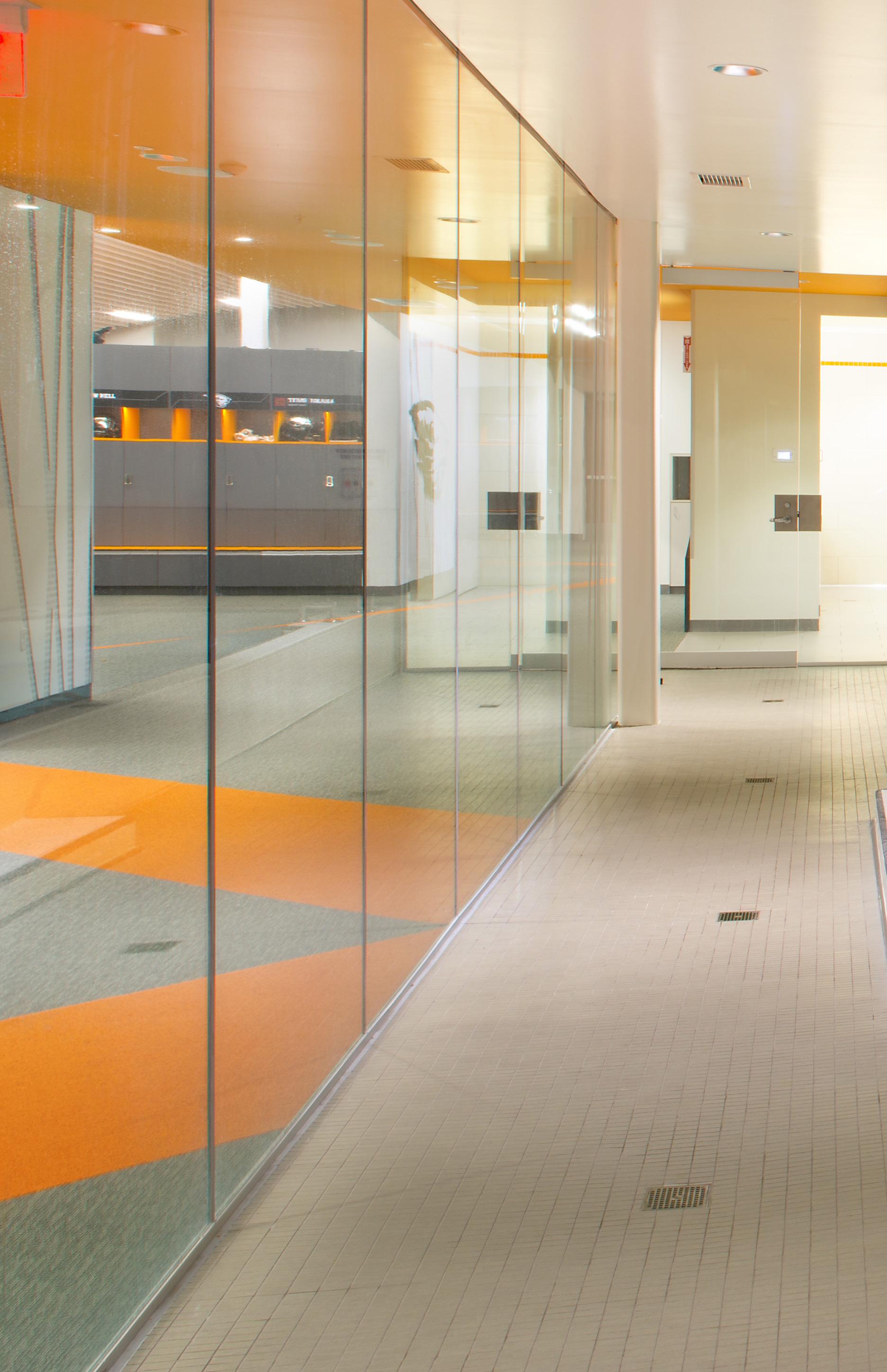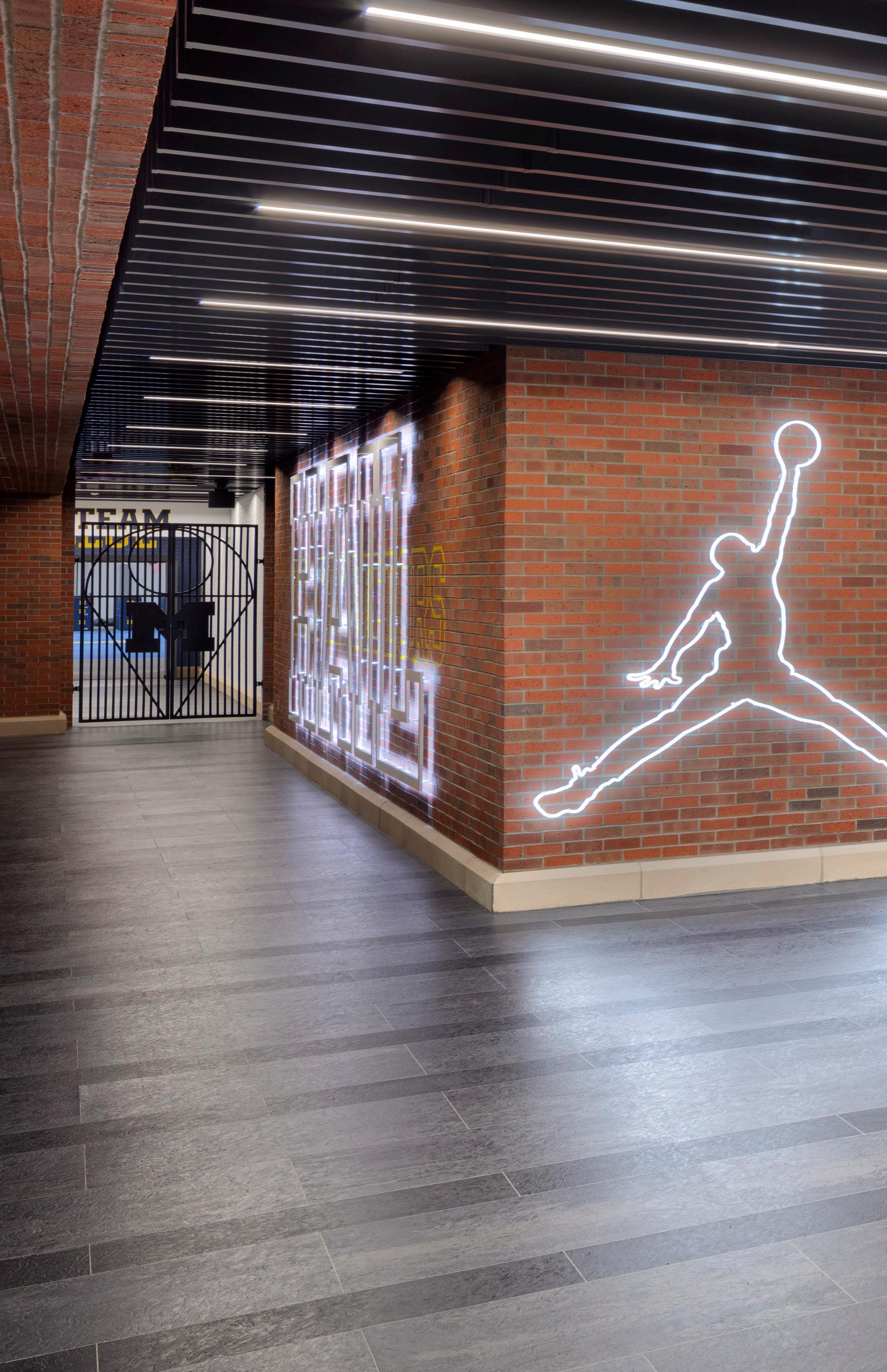 The design team worked closely with the university to evaluate multiple alternatives for materials that would complement the existing building and provide the high-quality of finishes expected for top NCAA Division I performance centers.