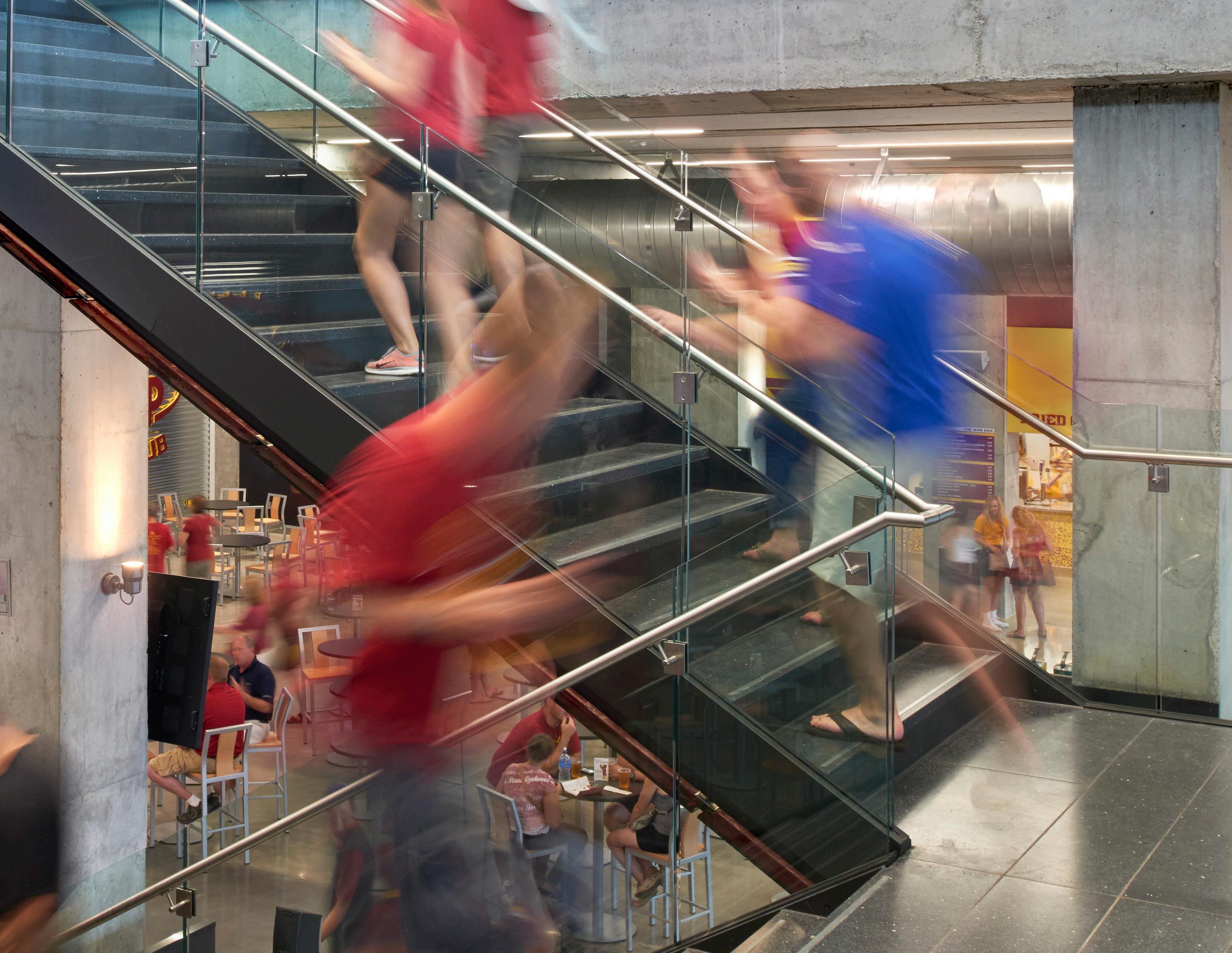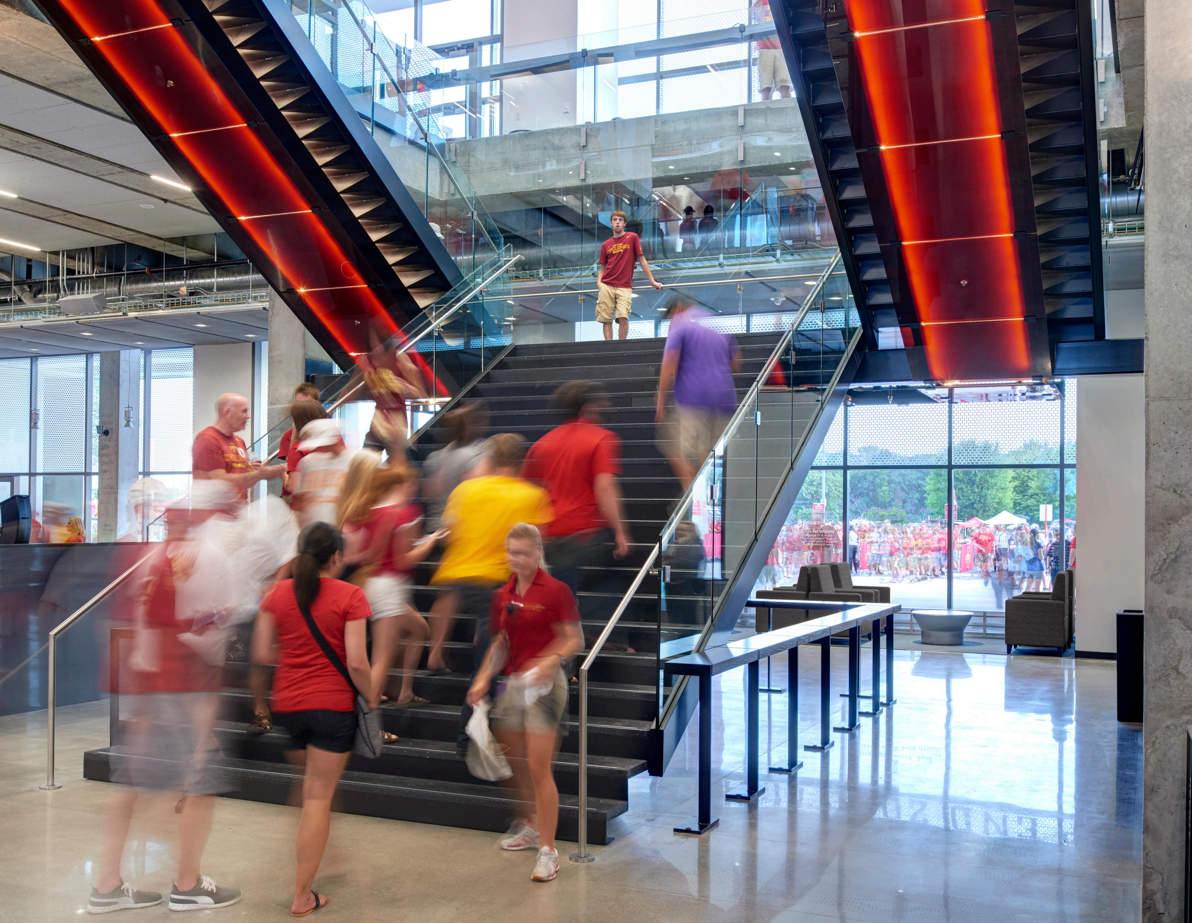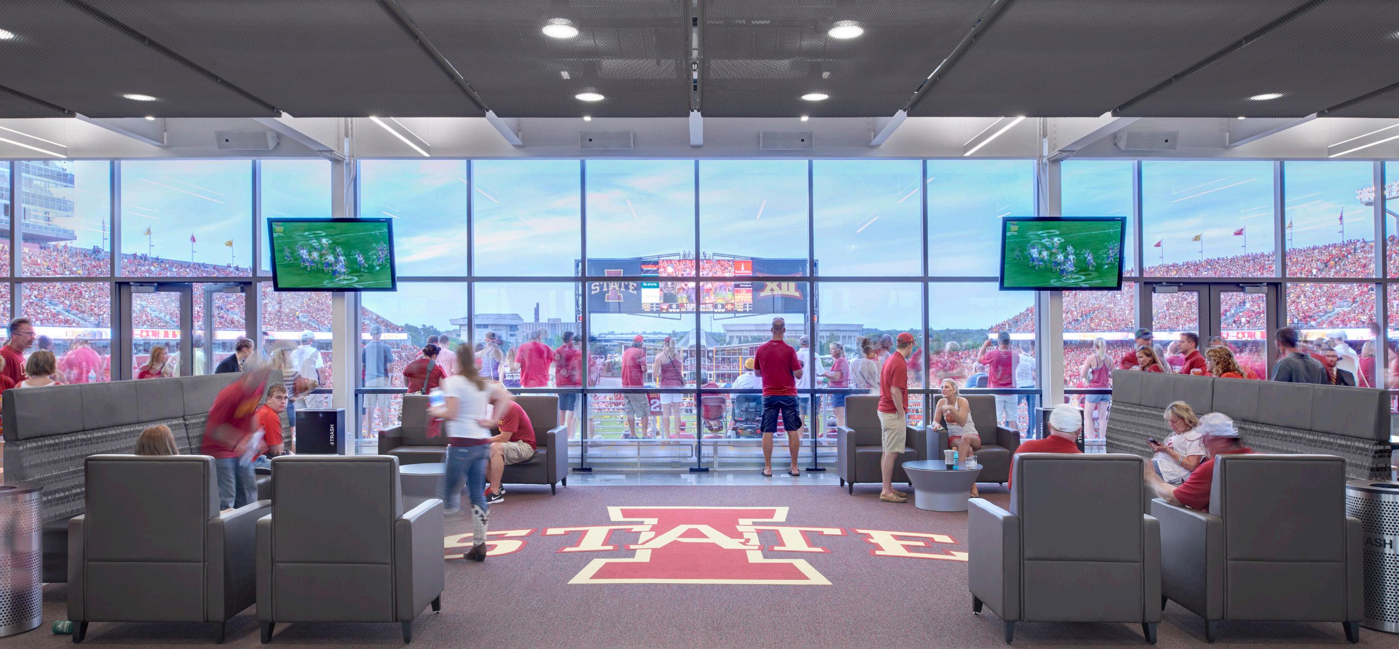 The project creates a new face on both the north and the south ends of the building. On the north, a new entrance pavilion has been placed in front of the existing building to offer a light-filled, welcoming face to the main campus. On the opposite end facing the stadium, the project includes end zone premium terrace seating to provide a casual, social setting for Beaver fans.