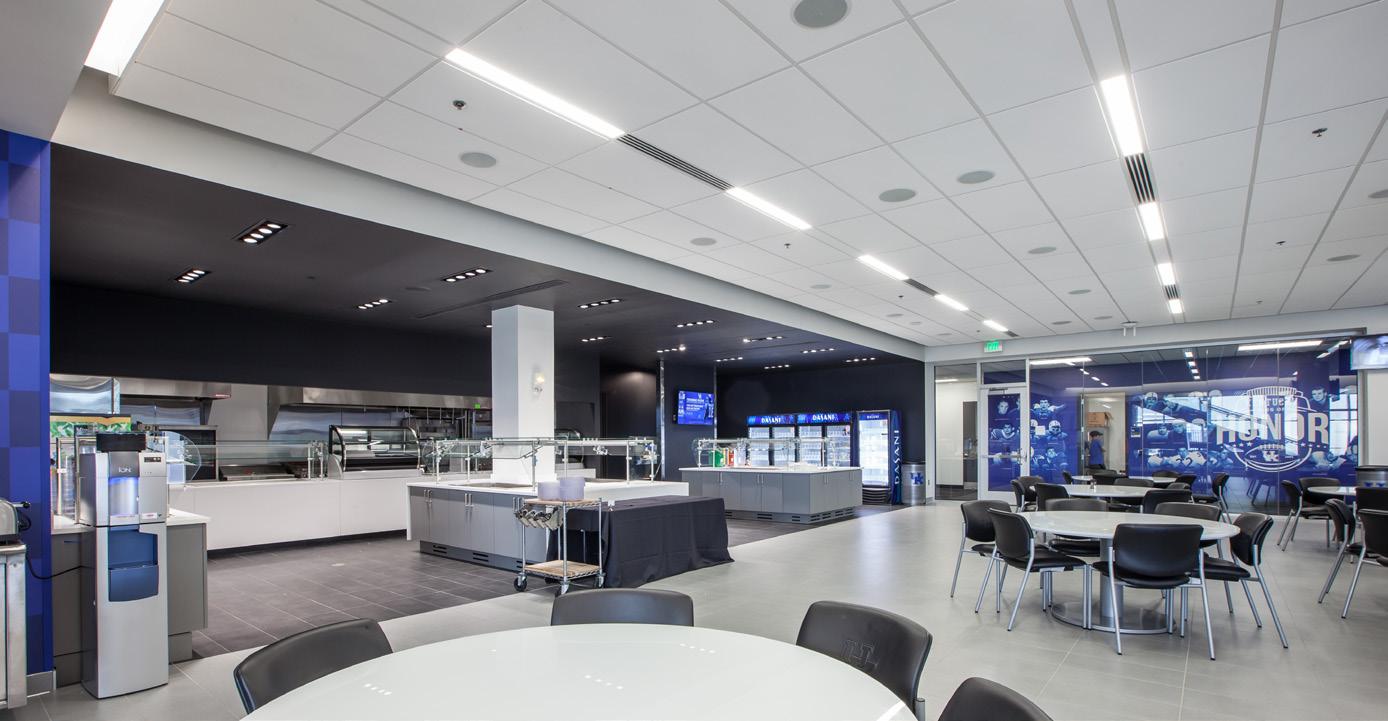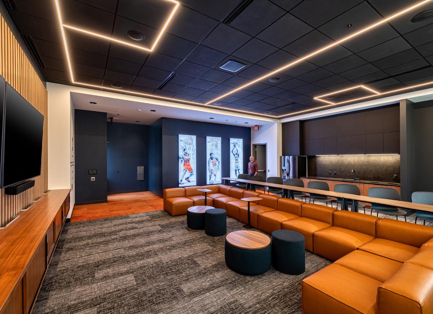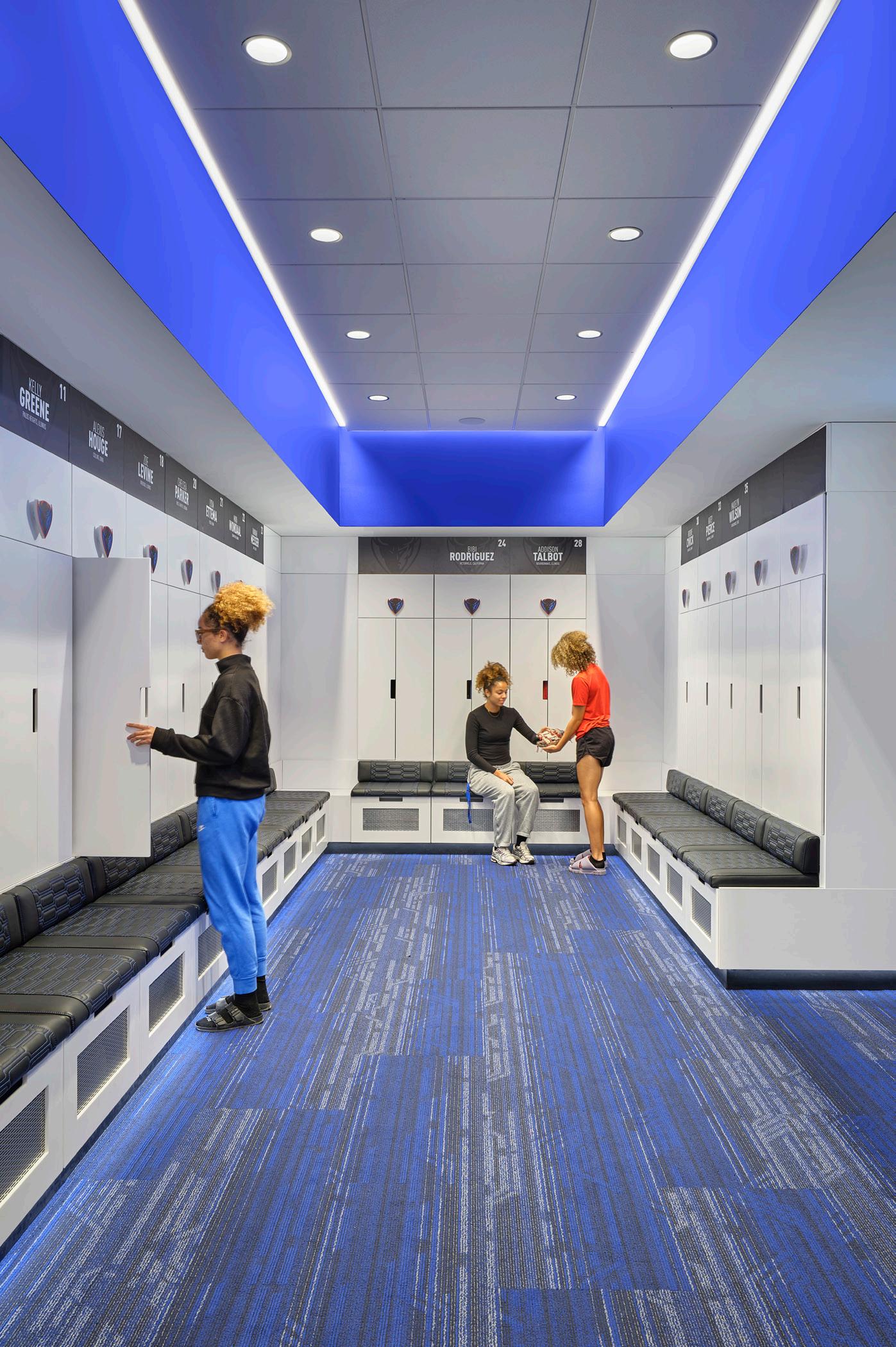 The new Bloom Football Performance Center is a 160,000+ squarefoot, stand-alone facility crafted to serve as the hub of USC’s football program. The facility includes a lobby with immersive displays and graphics that highlight USC’s storied history, two full-length practice fields and a locker room with direct access to hydrotherapy and recovery pools. The cutting-edge sports medicine suite features an adjoining cool down pool, while the weight room seamlessly connects to outdoor practice areas. Multi-level lounges, both indoor and outdoor, foster team cohesion and provide athletes with relaxing spaces. The facility also features a two-story team meeting room, 12 position-specific meeting rooms that support collaboration and development and dedicated office spaces for staff with views of the outdoor terrace and practice fields. Designed with future growth in mind, this project supports USC’s transition to the BIG 10 Conference and reflects a commitment to providing world-class facilities that will benefit studentathletes for decades.