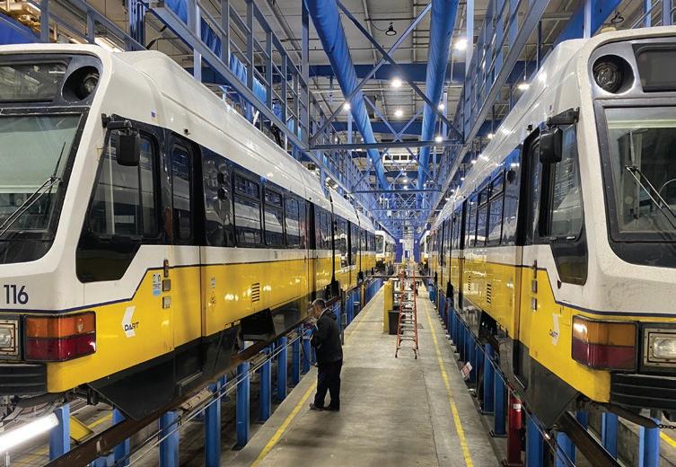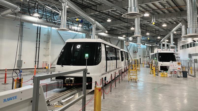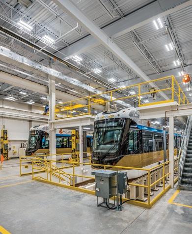 The 58,800-square-foot facility accommodates inspections, maintenance, repairs, fueling from two 35,000-gallon tanks, train washing and storage and a control center. In addition, a tunnel under the mainline tracks connects the loading dock and operations building with the maintenance shops.