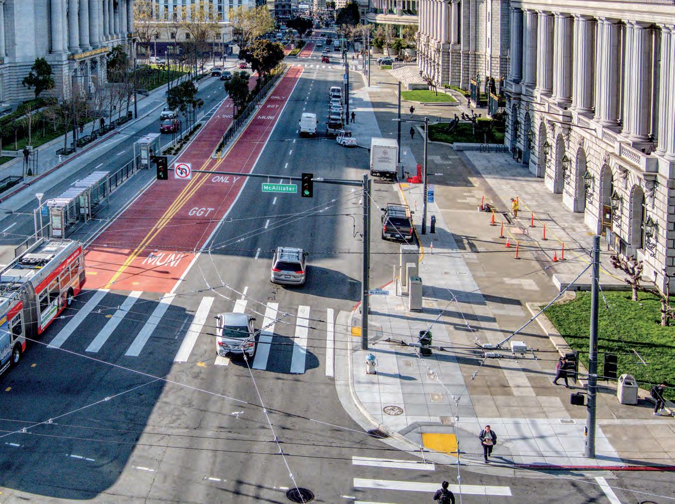HNTB’s work on the Central Subway extension led to the firm’s selection as construction manager on SFMTA’s Van Ness Improvement Project, a first-of-akind project for San Francisco. The initiative delivered 2 miles of the city’s first dedicated, center-running bus rapid transit (BRT) lanes to the highly traveled U.S. 101 urban thoroughfare in the northeastern part of the city, an area long recognized as underserved by highcapacity transit. The project also included new signals at 32 intersections, sidewalk extensions and safety improvements, including high-visibility crosswalks and audible countdown signals.