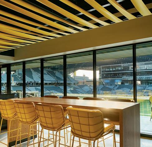 The Columbus, Ohio, facility’s imposing black roof canopy one of the largest in the league caps the aesthetic. Covering every seat in the 20,000-seat stadium, it both provides comfort for fans and delivers the Crew a competitive advantage by reverberating noise back to the field.