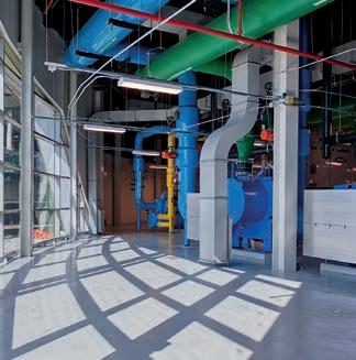 Windows allow guests exiting the airport’s Red Side drive to see the maze of brightly colored pipes and mechanical equipment inside. At night, multicolored LED lighting enhances the surprising visuals. The reclaimed water used in the cooling towers