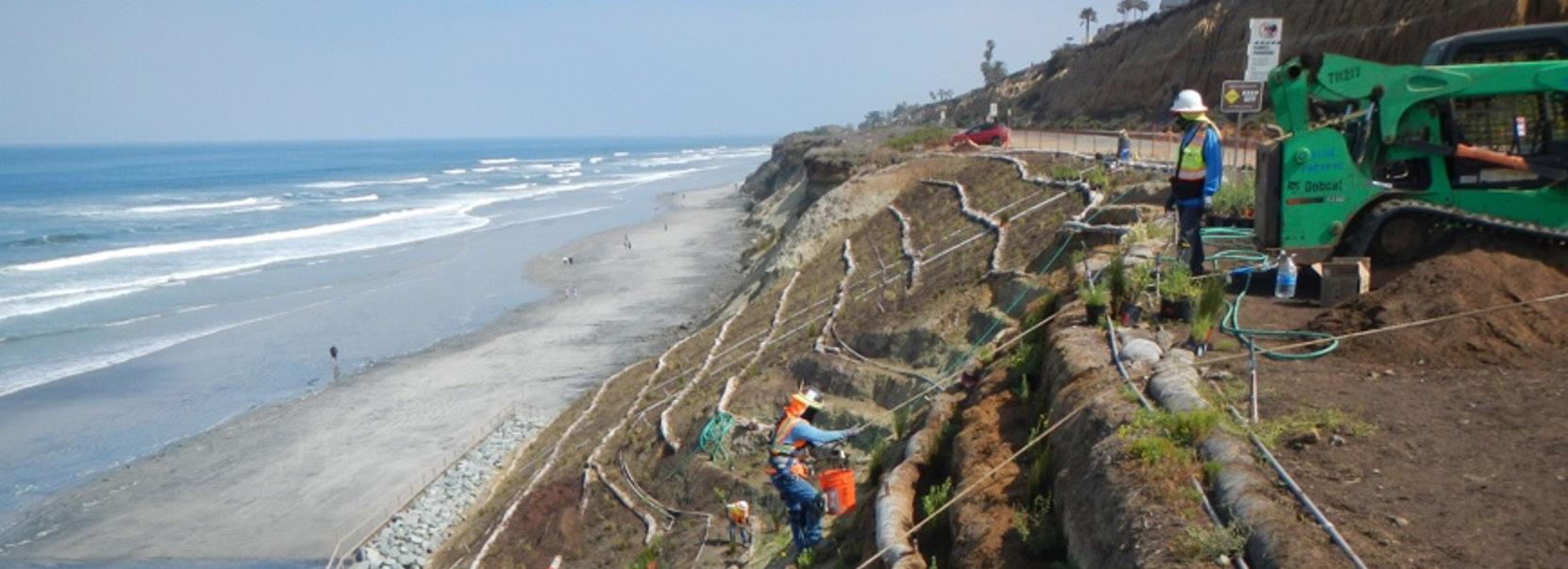 The Los Angeles – San Diego – San Luis Obispo (LOSSAN) rail line is a critical part of the north-south corridor through San Diego. It supports the NCTD COASTER commuter rail, Amtrak’s Pacific Surfliner intercity service, and BNSF Railway freight operations serving 7.6 million passengers annually, and facilitating $1 billion in goods and services through reliable rail operations. The coastal bluffs in Del Mar that support this rail alignment have a long history of landslides and slope failure. Rising sea levels and erosion pose current and future threats to this rail corridor, and HNTB is supporting the San Diego Association of Governments (SANDAG) with their stabilization program.