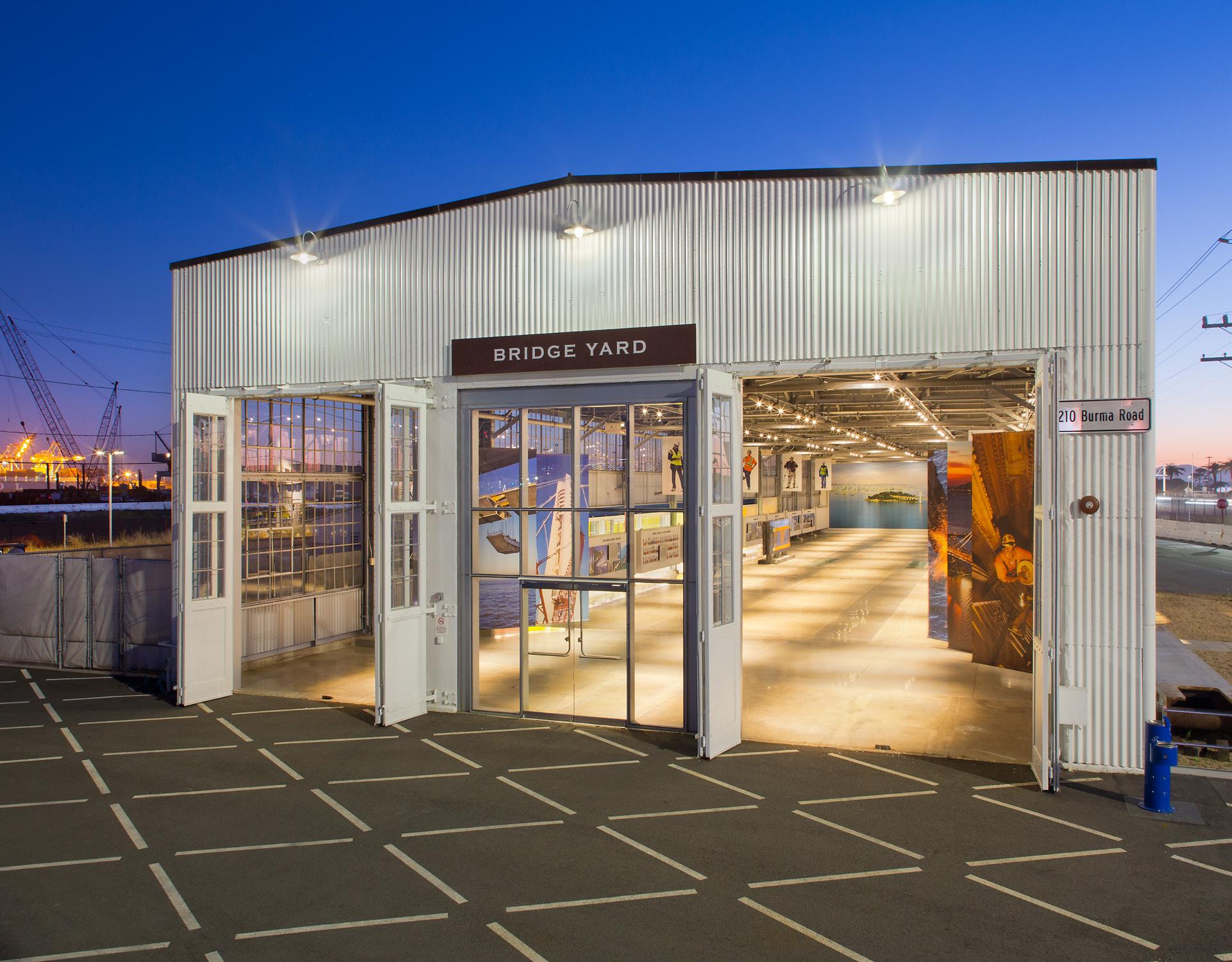The Bridge Yard is a unique re-imagining of a 1930s industrial building for the Port of Oakland. Listed on the National Register of Historic Places, it was built originally as a repair facility for trains, used later for maintenance and storage, and is now an exhibit and public assembly building. The site at the base of the Bay Bridge is planned to be a future public park, and lies along the new Oakland to San Francisco Bike Path.