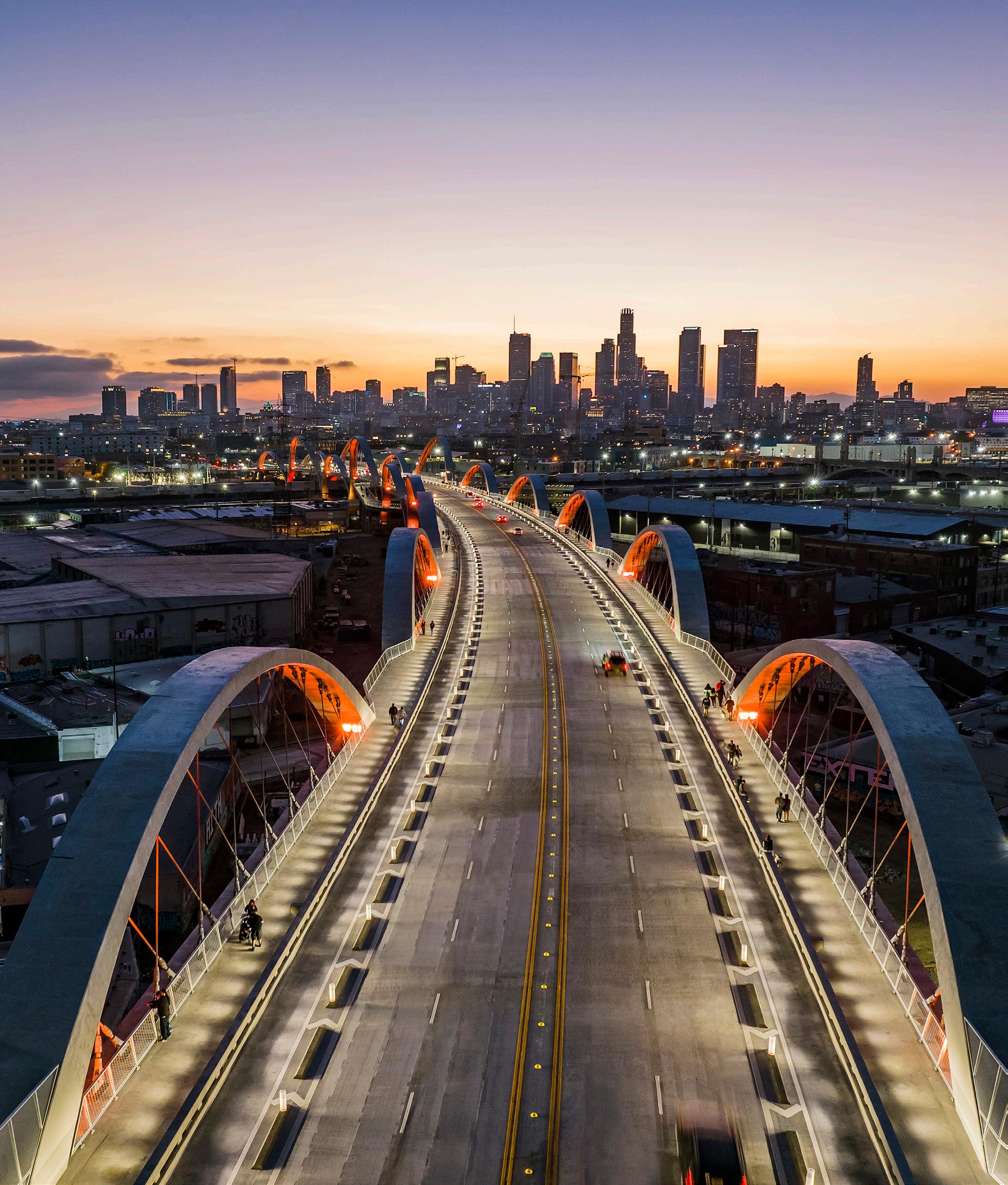 The Sixth Street Viaduct was designed to complete a single, unifying connection between Boyle Heights, the Arts District, and downtown Los Angeles. The design’s signature arches represent a heartbeat against the skyline of the city, and recalls the preceding historic LA bridge with a modern twist. The viaduct, known locally as the Ribbon of Light, threads together urban neighborhoods and landscapes, while providing opportunities for future growth and transformation. The viaduct is already a catalyst that is helping surrounding neighborhoods to develop new amenities and form public-private partnerships that will foster innovation for LA’s Clean Tech Corridor. Plans for a new arts plaza beneath the Sixth Street Viaduct will create bridges of their own within communities to reinvigorate public life and cultural development.