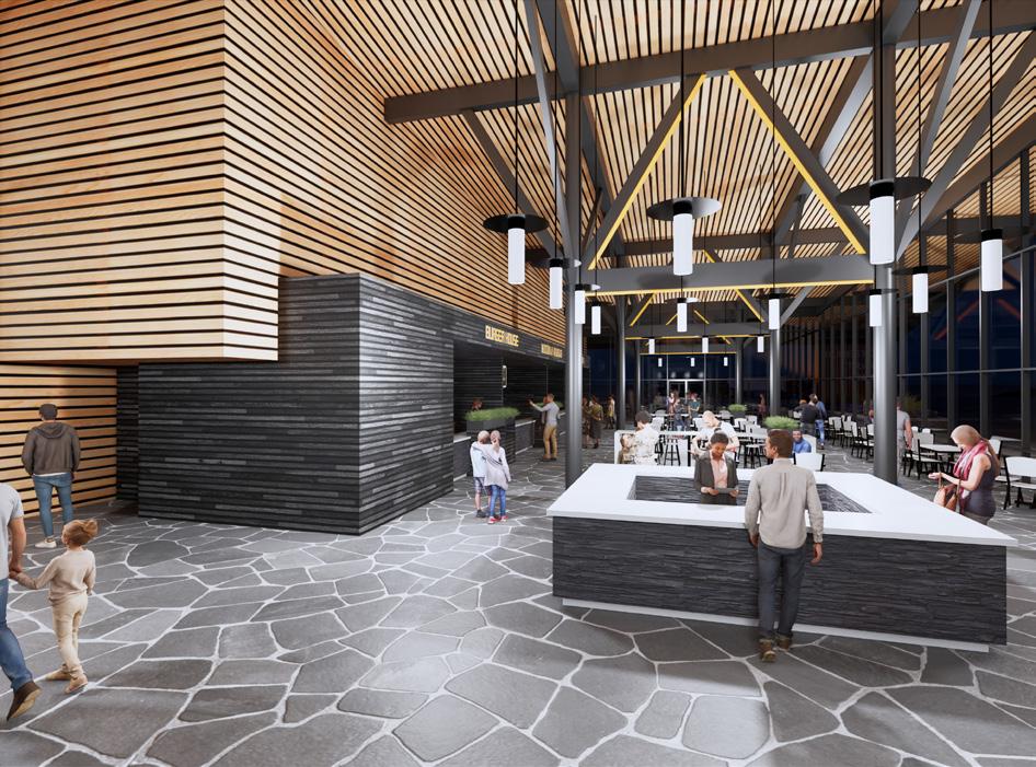 Inspired by the rugged beauty of West Virginia, these facilities incorporate materials and spaces designed to create a sense of calm and peace. Coupled with its outstanding exterior design, the facilities evoke a mountain resort atmosphere. Natural materials indigenous to the area are incorporated in the interior, including recycled or reclaimed wood as well as a wide selection of wood and leather furniture. Large pavilion spaces will house retail, West Virginian crafts, tourist information and food services.