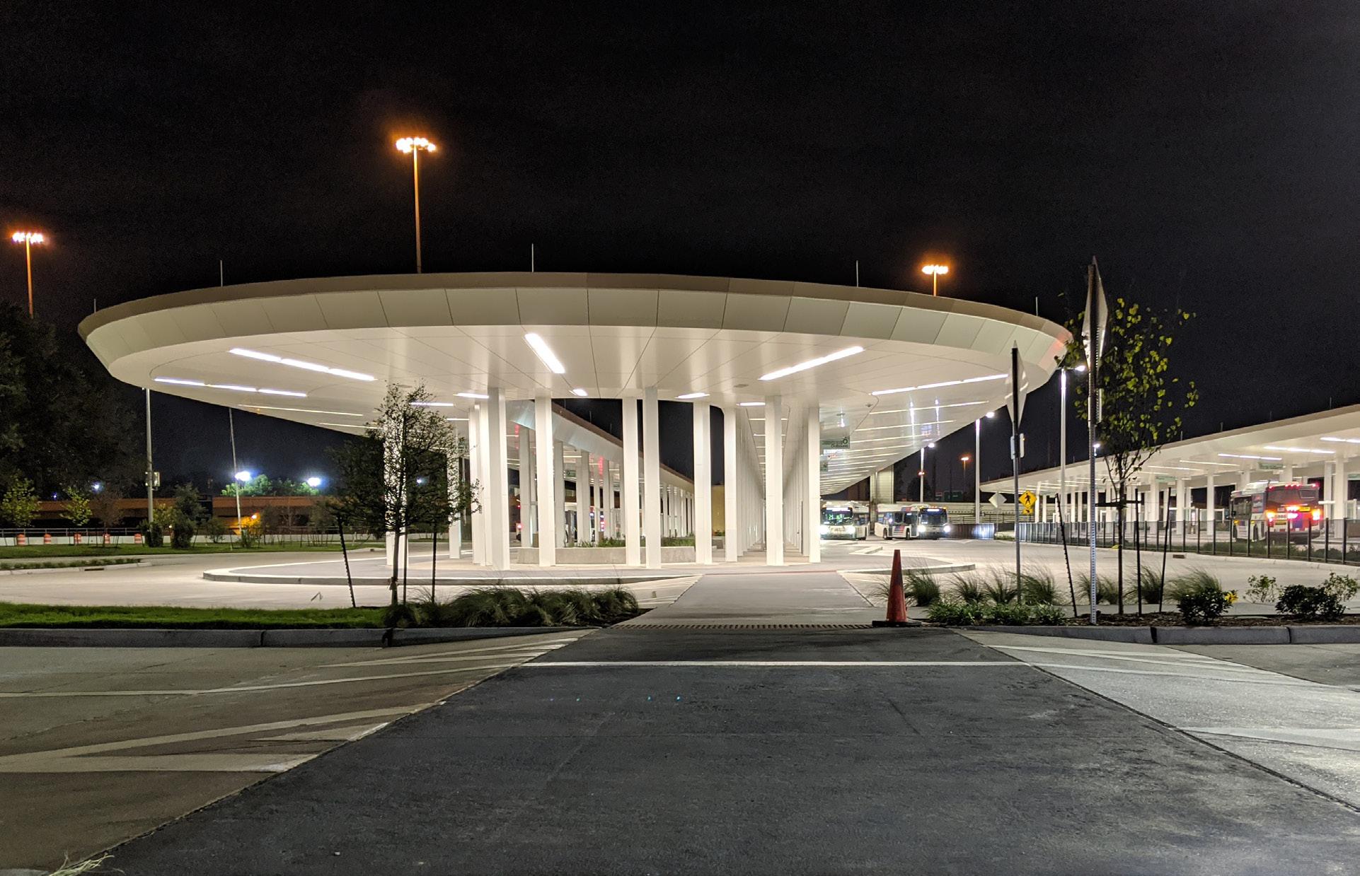 HNTB increased and enhanced public transit ridership by creating an attractive, durable and inviting transit center. U-shaped canopies trace the bus circulation loops and are designed to maximize access to bus bays with quick, safe traffic and pedestrian flow. Glass screens protect benches from wind-driven rain, and cooling breezes blow through in summer. The broad projection over the waiting areas allow lowangle winter sun to reach the seating and queuing areas. The north canopy shelters a Ride Store, where patrons buy transit passes.