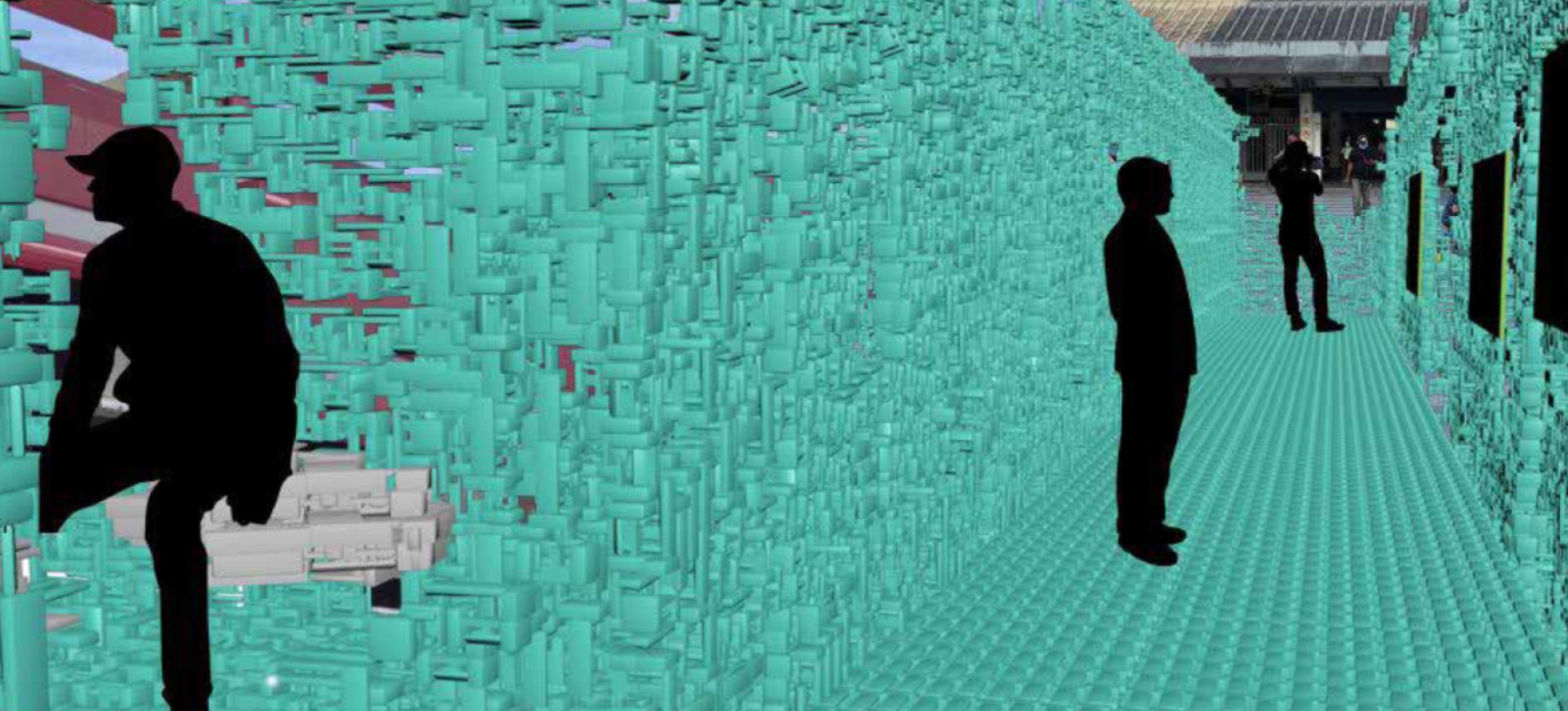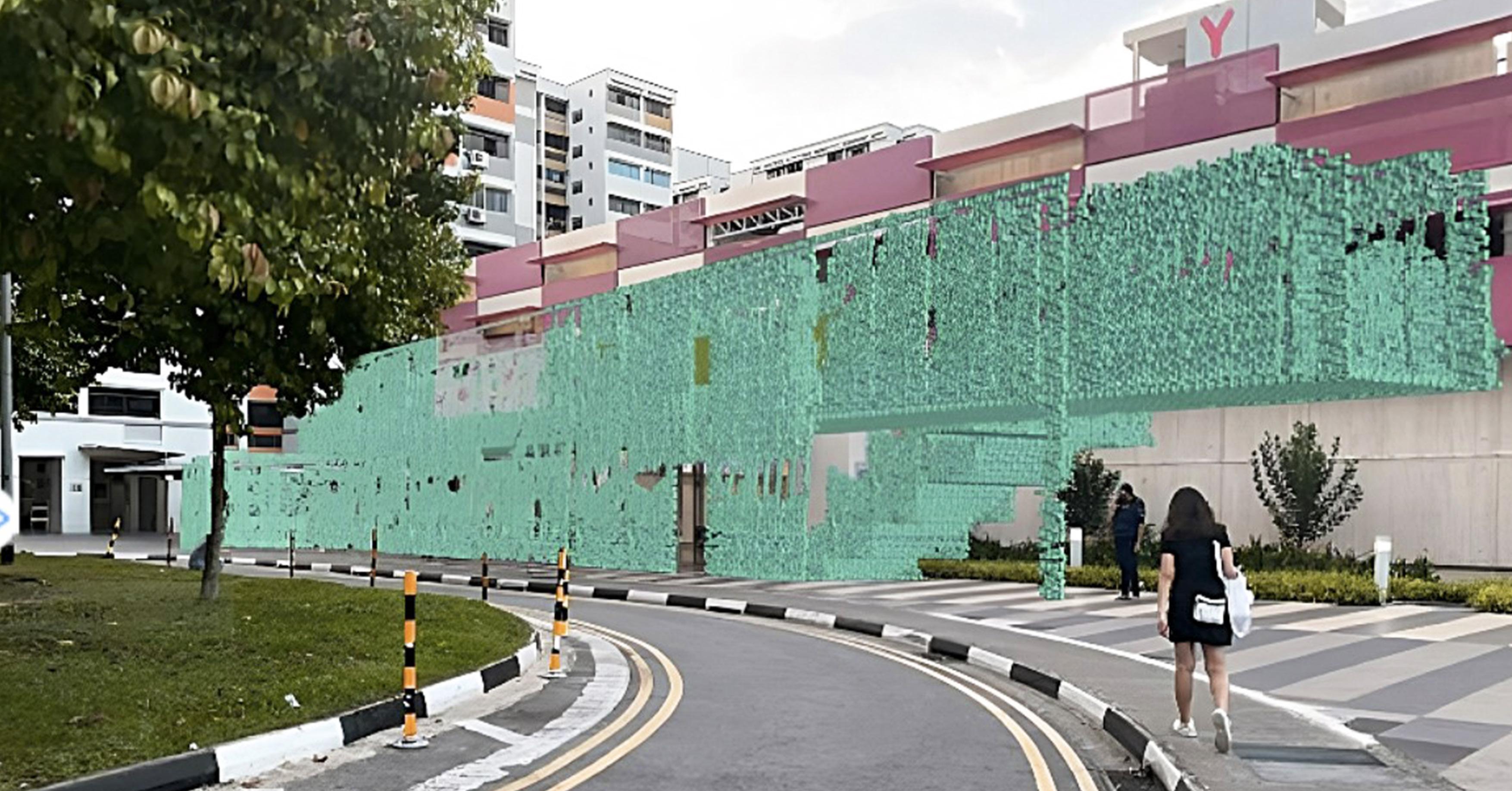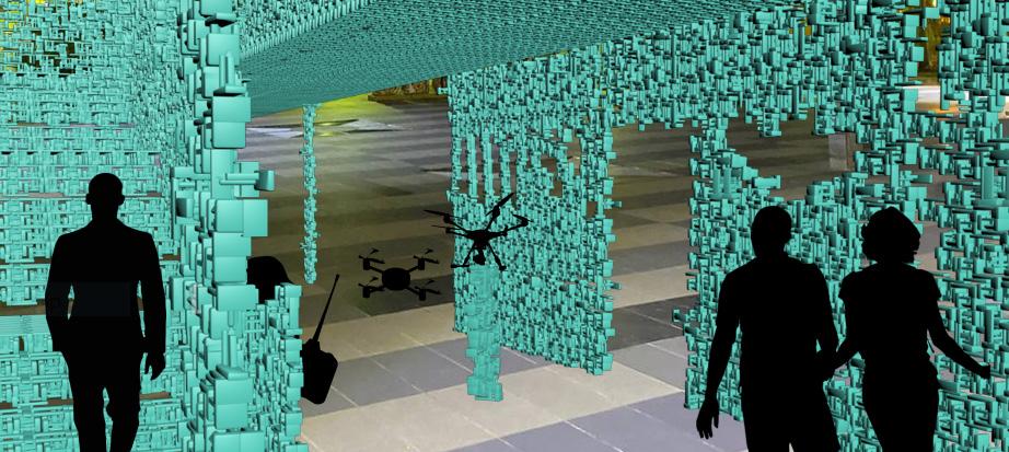 The abstract and eye catching colours can be spotted from a mile away. The design was to also act as a green screen and form a transitional space and creating a complex and interesting spatial experience for the users that pass by the space.