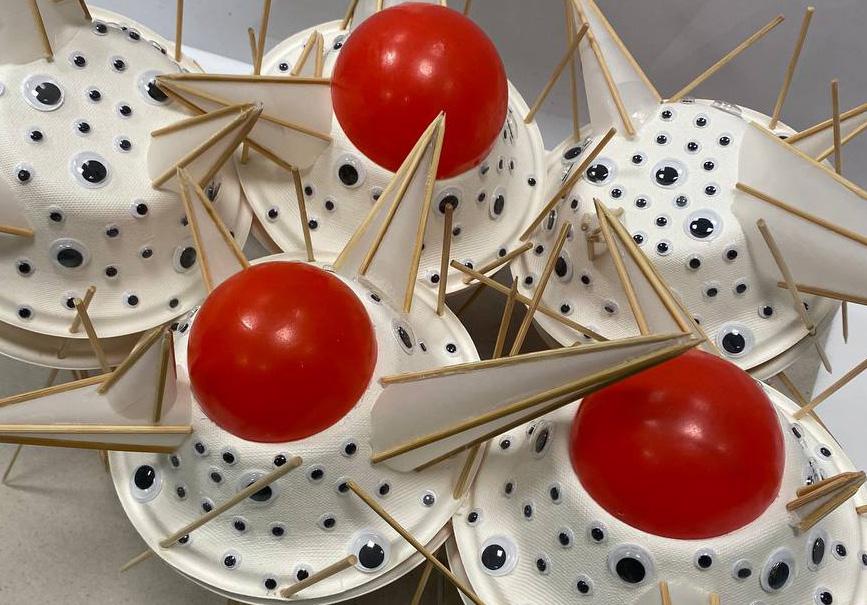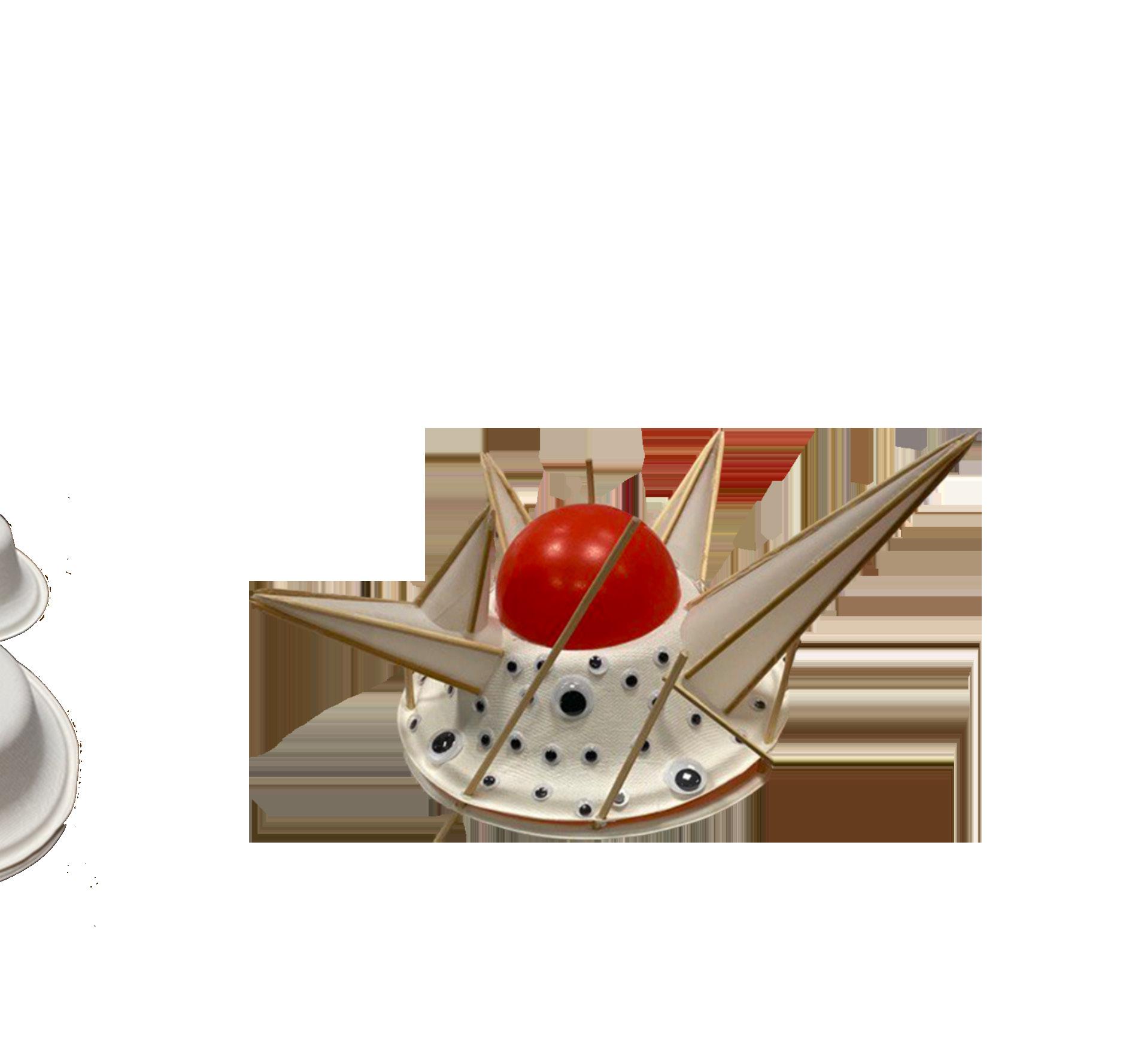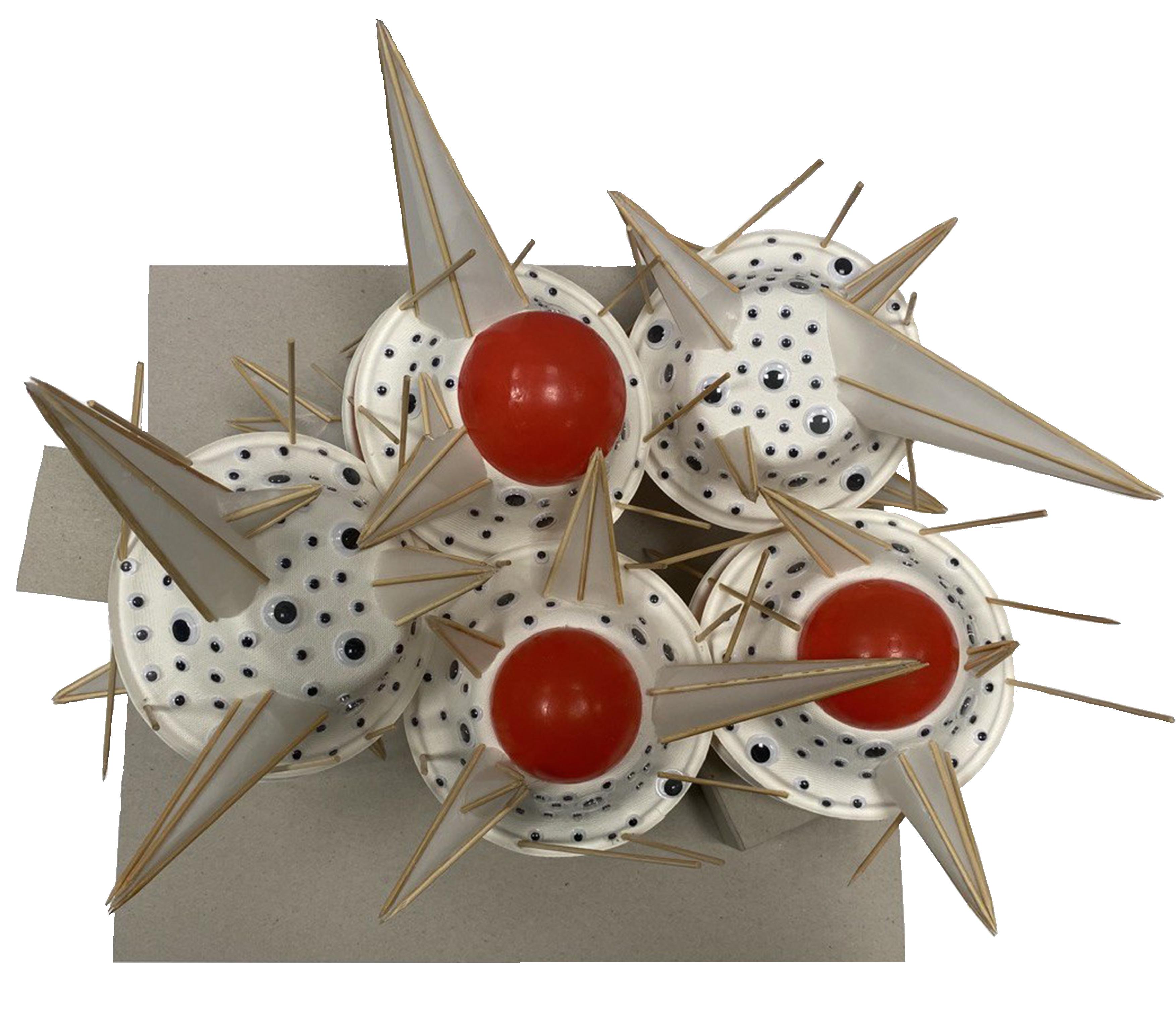 04-06 is the process of placing materials into respective placement to form structure using paper bowls, red plastic balls, sticks and plastic eyeballs. The wooden sticks were able to shape the paper giving it a rigid, angled structure. Making use of conventional items to create this abstract model.