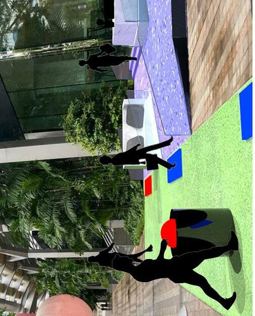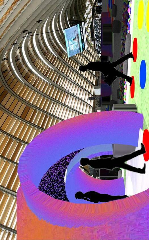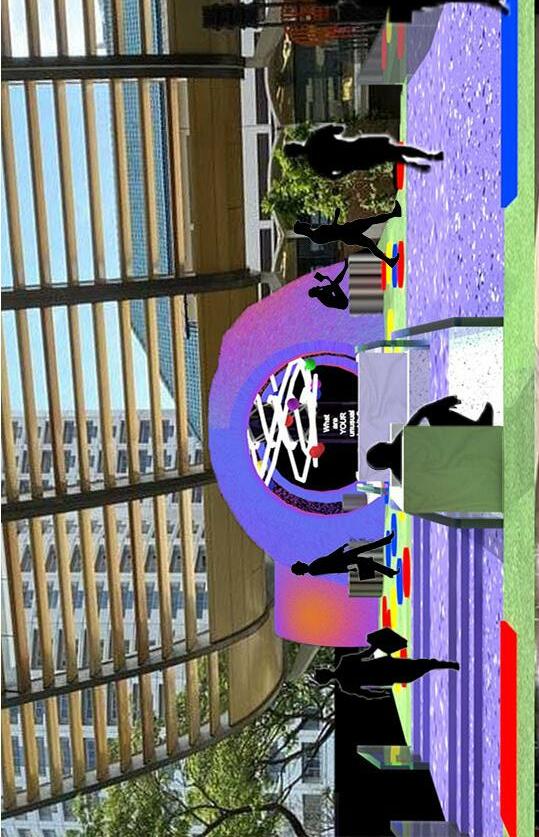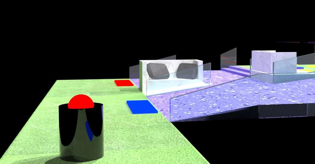 The colour circles on the ground are lighted panels consisting 3 primary colours: Red, Blue and Yellow. Acting as pavements for moving from one space to another attempting to engage users. Bringing us back to the basics of simplicity in colour.