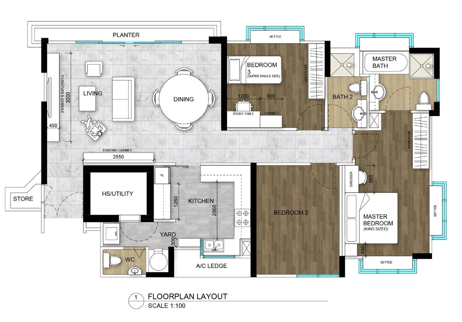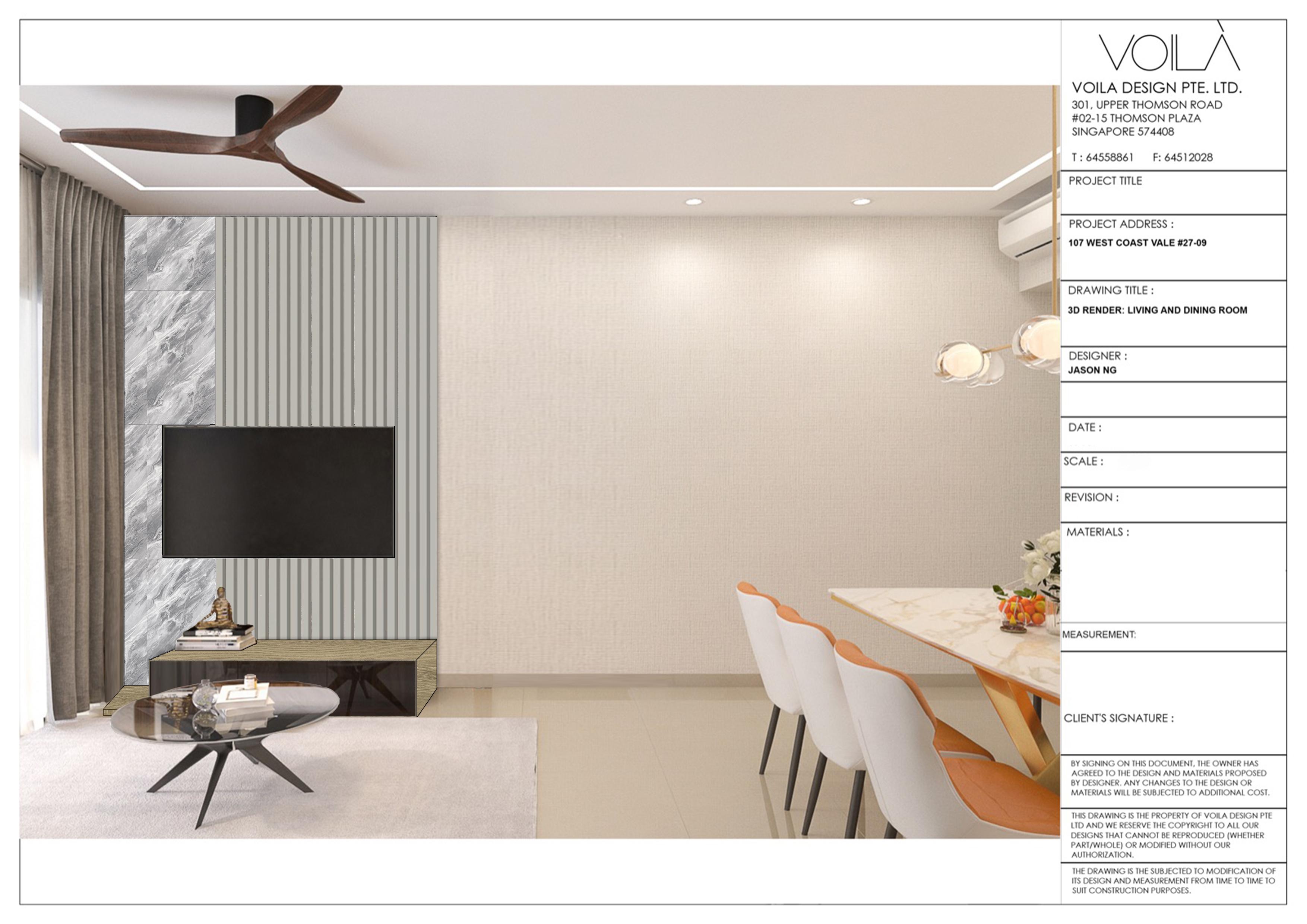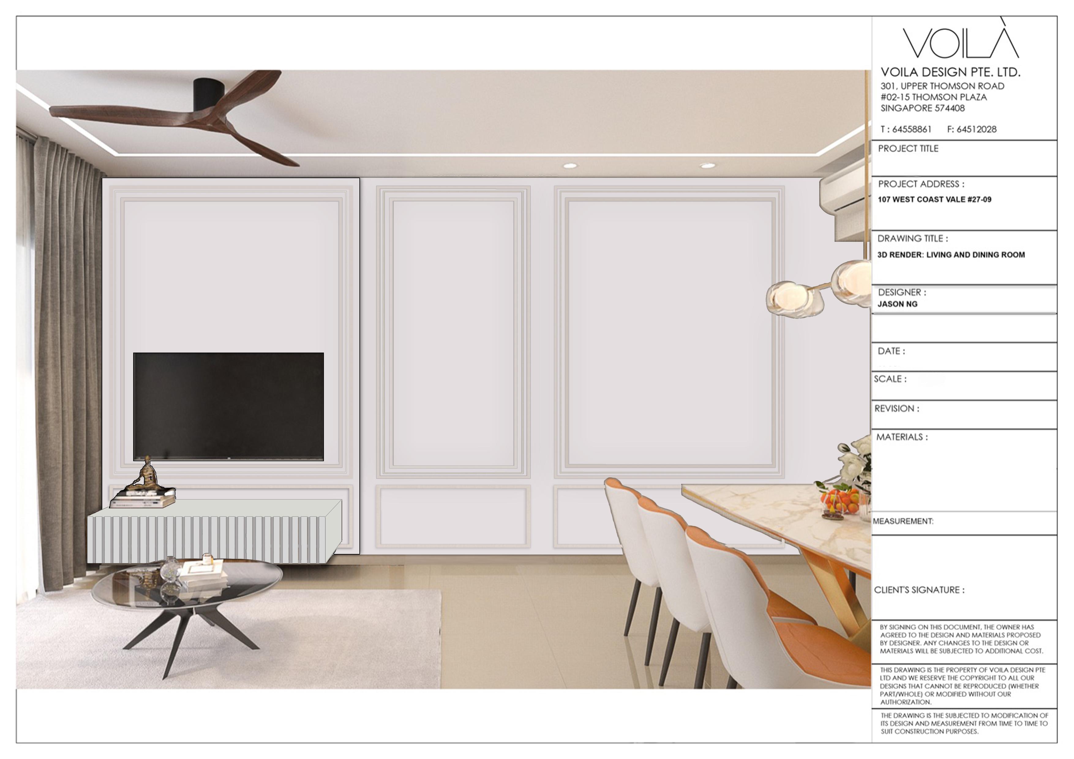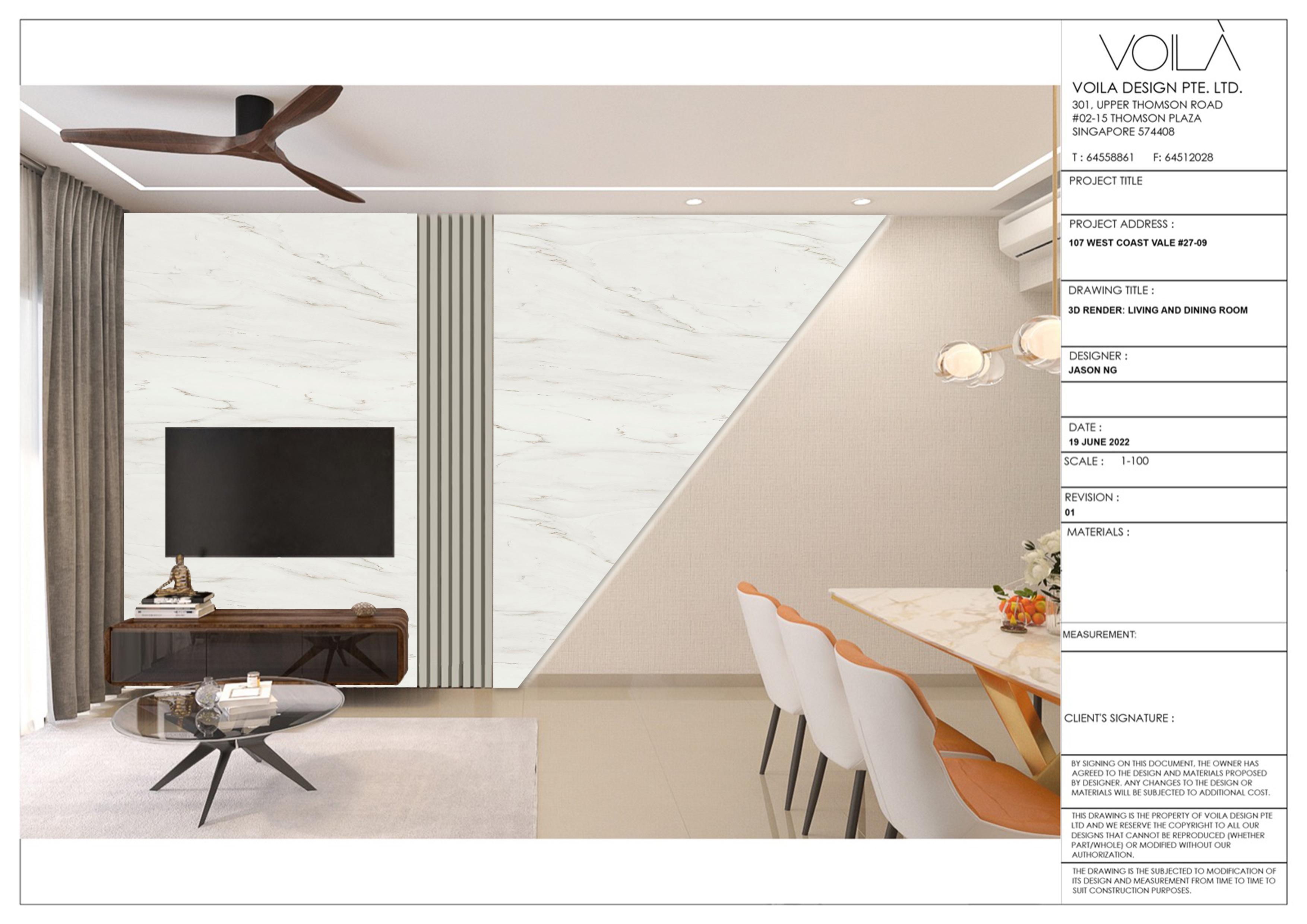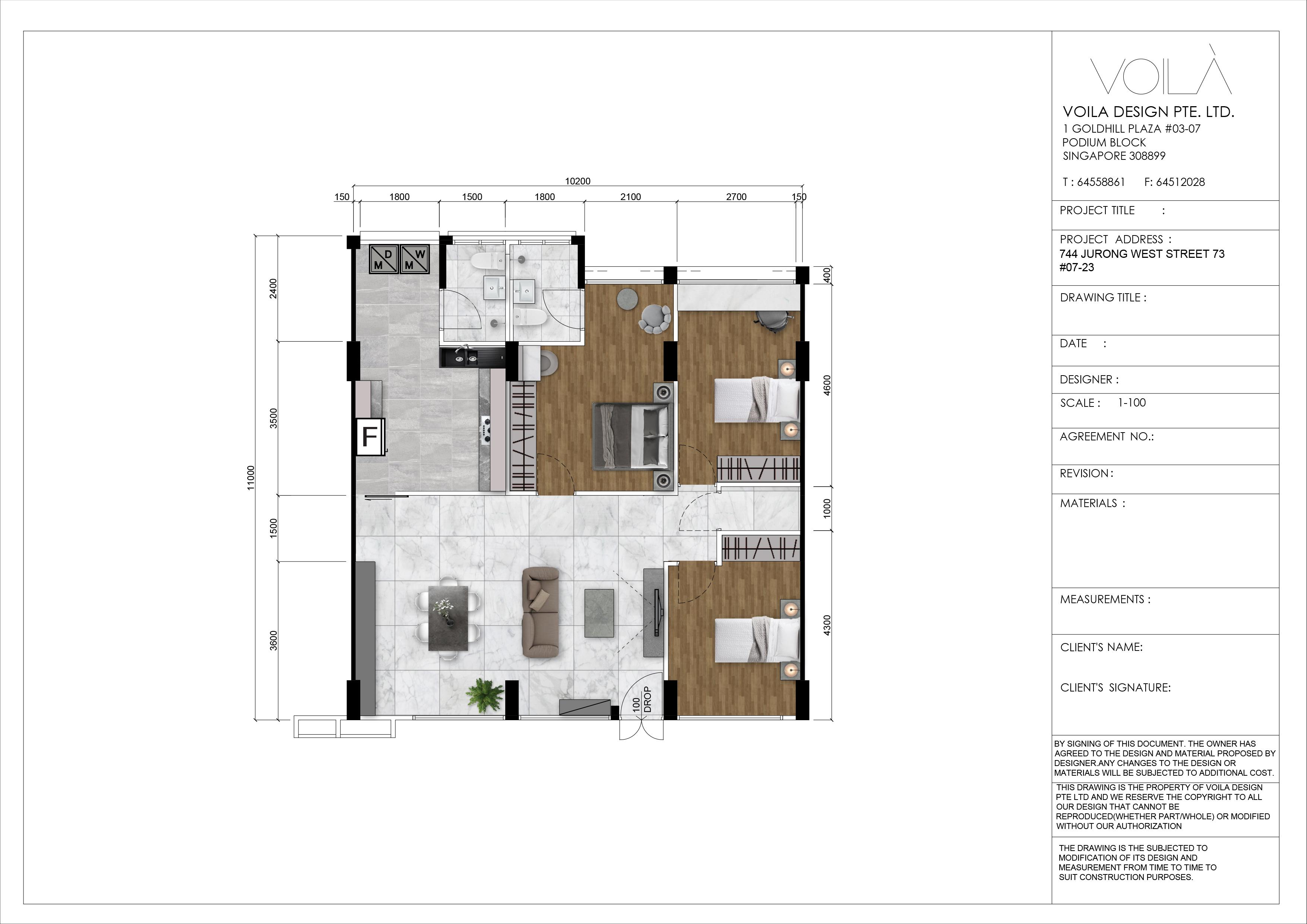 BY SIGNING OF THIS DOCUMENT. THE OWNER HAS AGREED TO THE DESIGN AND MATERIAL PROPOSED BY DESIGNER.ANY CHANGES TO THE DESIGN OR MATERIALS WILL BE SUBJECTED TO ADDITIONAL COST. THIS DRAWING IS THE PROPERTY OF VOILA DESIGN PTE LTD AND WE RESERVE THE COPYRIGHT TO ALL OUR DESIGN THAT CANNOT BE REPRODUCED(WHETHER PART/WHOLE) OR MODIFIED WITHOUT OUR AUTHORIZATION