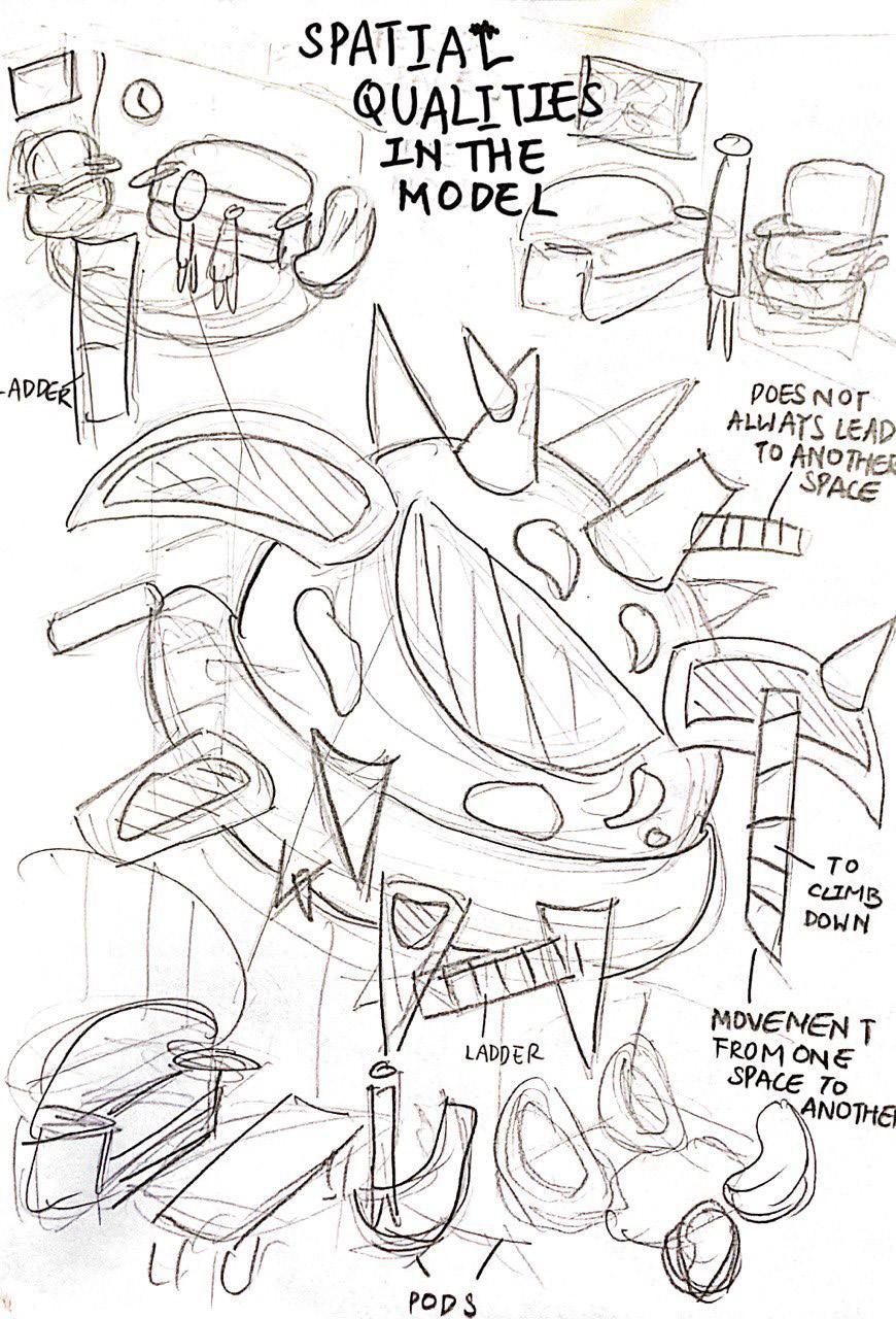 After abstracting components of the model, we had to craft out lines in specific detailed parts of the model that shows a form of connection that I find interesting. We had to analyse three zoomed in spaces within the model. Drawing 3 stick drawings, 3 three dimensional drawings and make 3 exploration models.