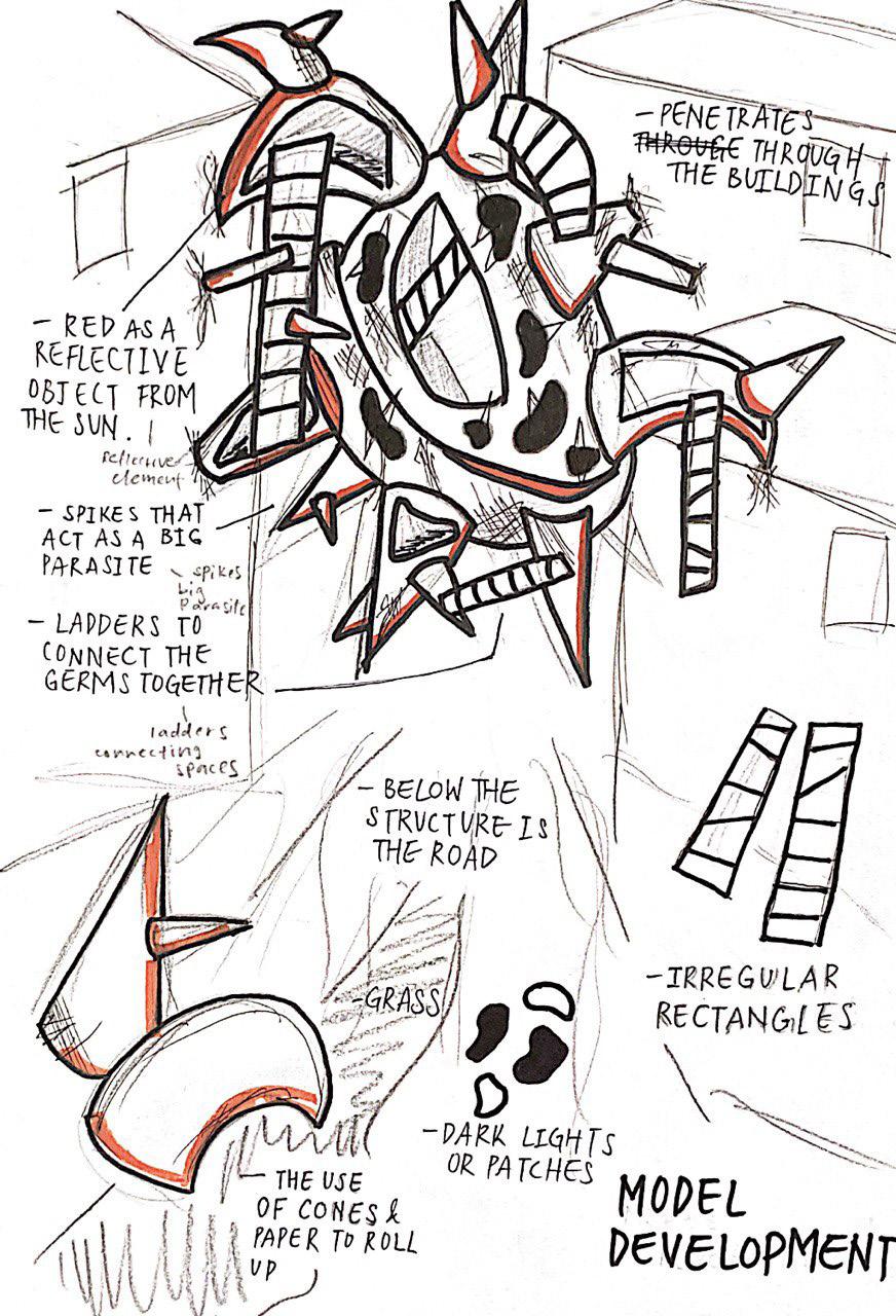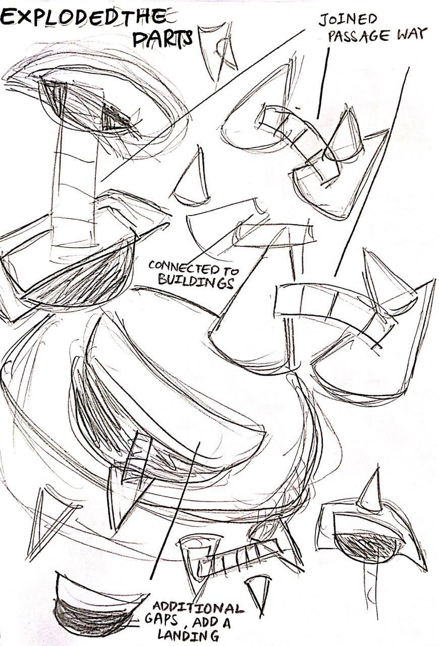 My sketches showed my thought process when creating the model and how I visualised the model to look like. As my site is between 2 office buildings, I had to create connections from one space to another. Needing to add one structure and eventually having multiple structures in the same area. After sketching, I was concerned of how complicated it might be and I ended up deciding to simplify my model towards the end. Where I would still get my message across.