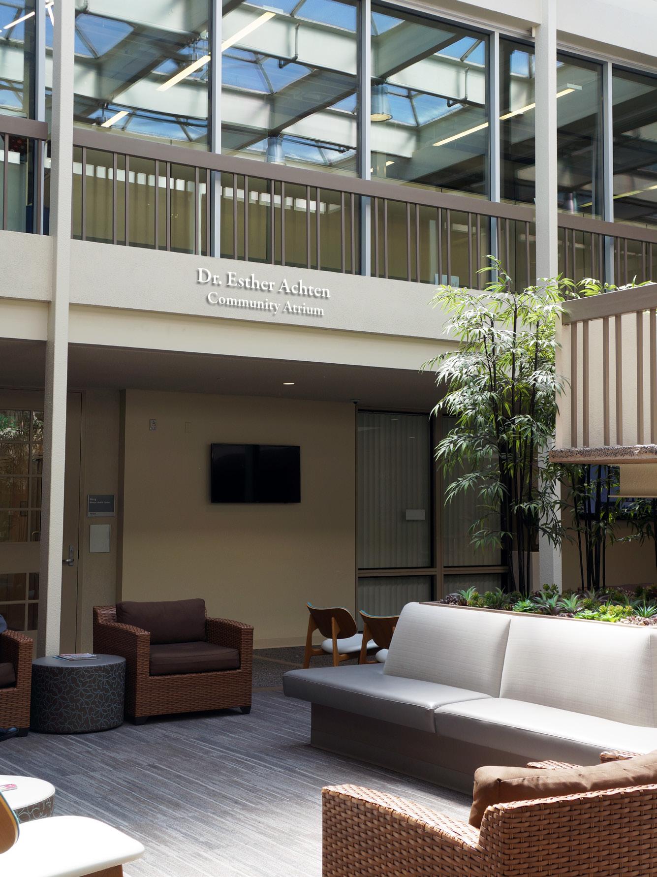 The atrium in the Melinda Hoag Smith Center for Healthy Living is the receiving space, signaling an entry point for better days. With its broad halls, greenery, and gathering spots, it welcomes people from all walks of life who come to Hoag in need. In the atrium, children play together, and adults bond and support each other during challenges. It is the equalizer, a safe touchdown spot that reassures those who’ve entered the building that within these walls are the tools to build better futures. This light-filled atrium is where hope shines for the most vulnerable. Beyond the doors that line this central space are solutions and advocates ready to help improve lives. As the Dr. Esther Achten Community Atrium, this space will honor its namesake, her legacy as a selfless person, and as a beloved member of your family. It brands this lifeline with everything she held dear: helping those who need it most.