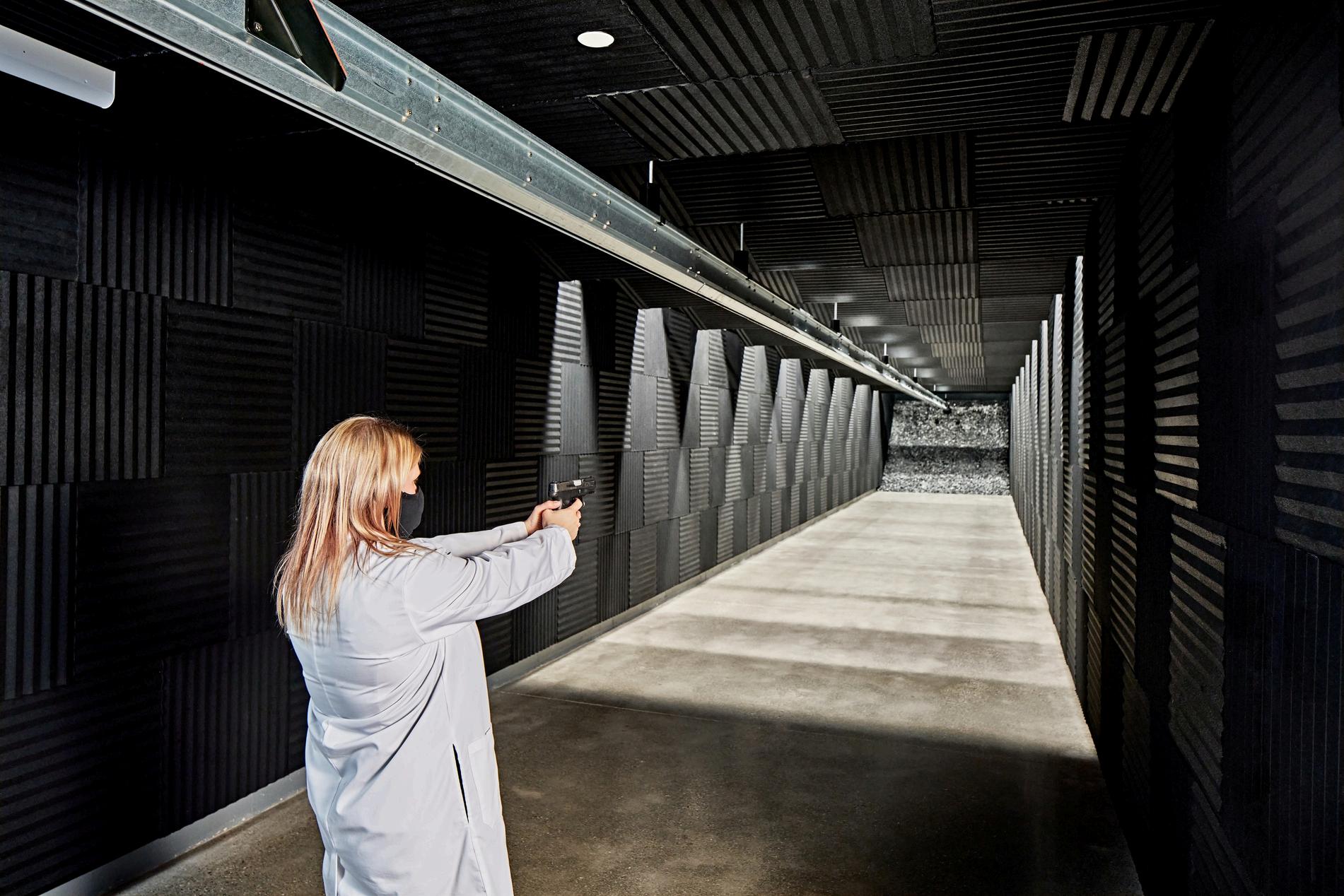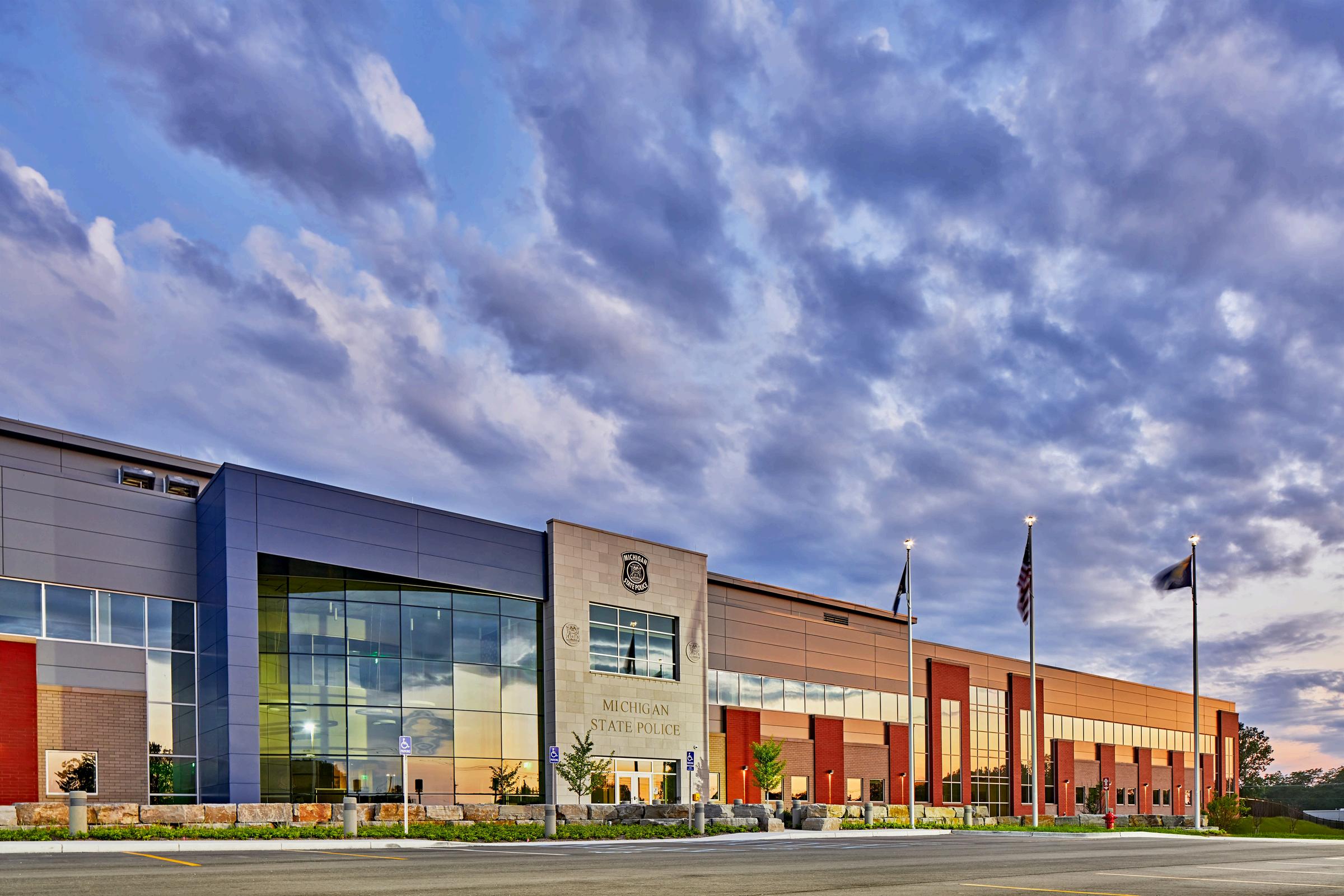 The Michigan State Police Headquarters is a state-of-the-art office and energy-efficient building that presents a monumental and civic presence. The central location in downtown Lansing, Michigan, provides a strong and welcoming community interface, while the hardened structure, containment wall, and highsecurity parking lot provide critical safety needs A collaborative team approach was used to successfully meet the project objectives of the complex program, tight timeline, and budget constraints, with environmental awareness informing the entire design process