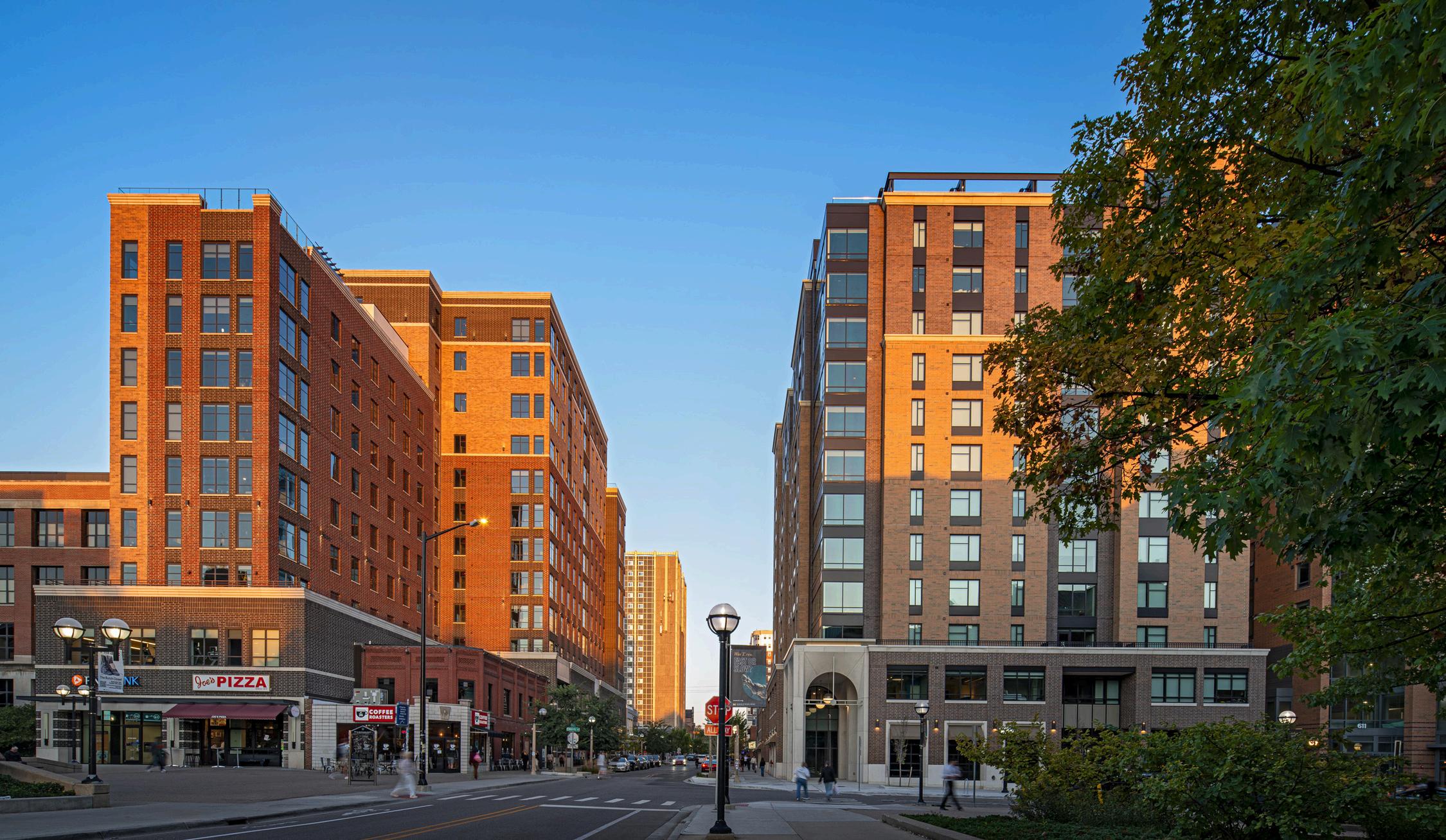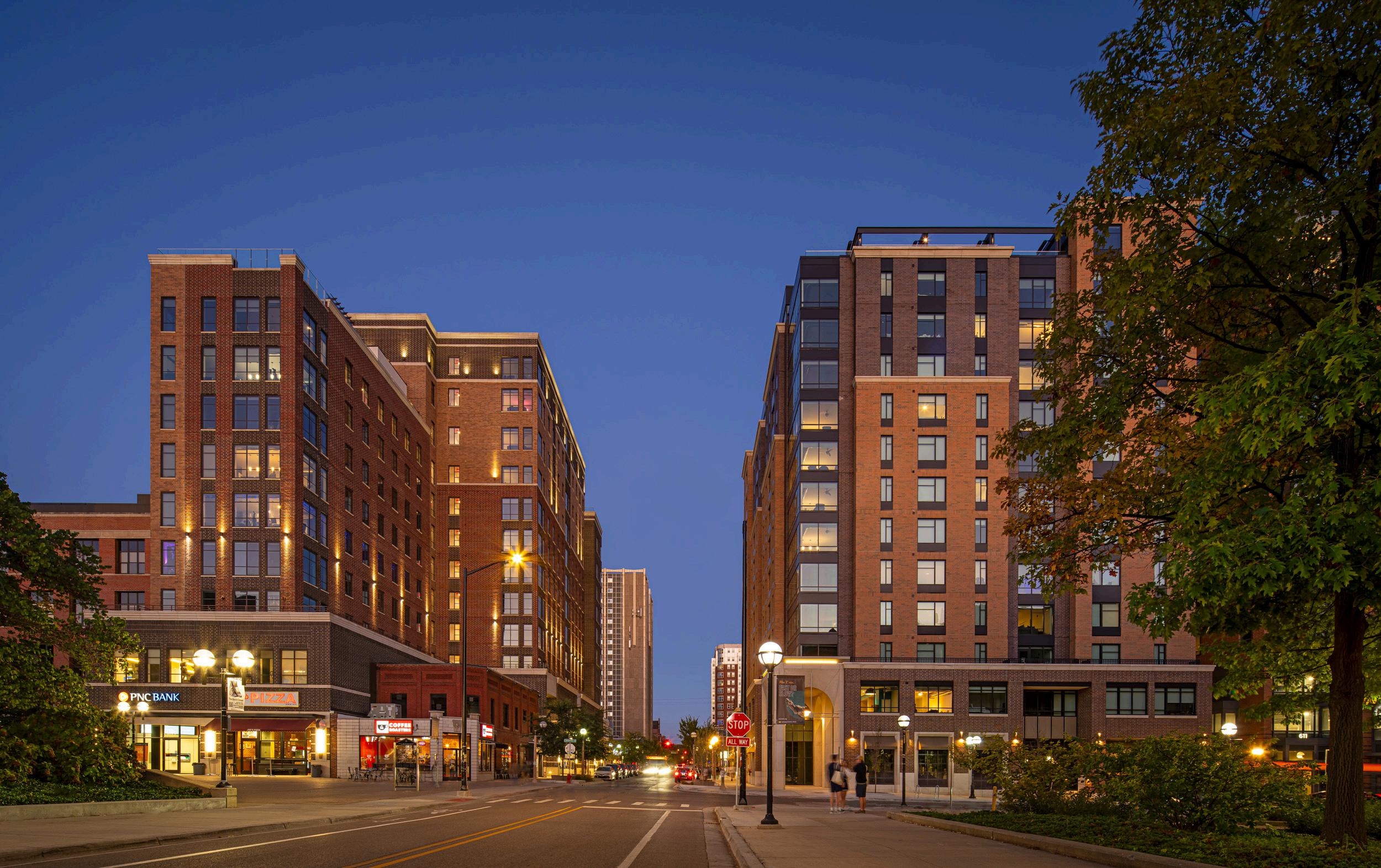 Vic Village South, the sister property to the completed Vic Village North project, is a mixed-use, thirteenstory high-rise located in the South University district at the University of Michigan in Ann Arbor The building offers student housing apartments and living amenities such as a CrossFit gym, study rooms, lounge spaces, below ground parking garage, game room, a penthouse sky lounge, technology lounge, and first-floor leasable retail space. By blending the balance between interior and exterior living spaces through roof-top patios and gathering spaces, the completion of this project continues to develop the South University district into a central hub that encourages students and local Ann Arbor residents alike to enjoy the walking paths, parks, shopping and dining this City is known for
