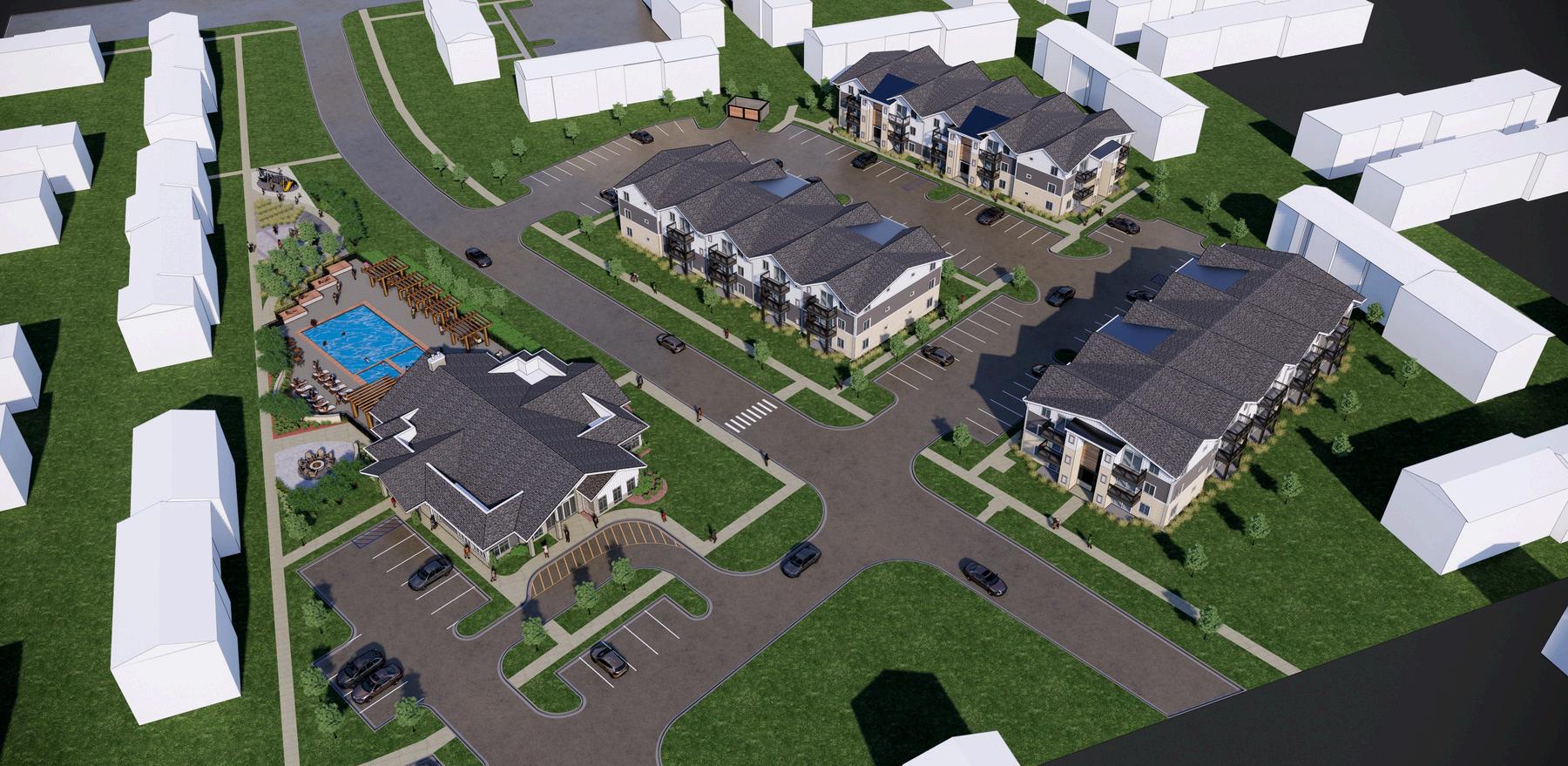 4 new, 3-story stacked flat apartment buildings incorporating approximately 104 new units into the project in multiple phases of construction 1 new community building with offices, gathering space, fitness, locker rooms, laundry and dog washing station, including a new resort style pool and recreation area.