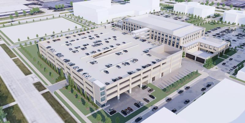 The new parking structure and office facility contain 2,034 parking spaces in a seven-story structure. The site also affords an additional parcel of land on the north side that may be considered for a future expansion