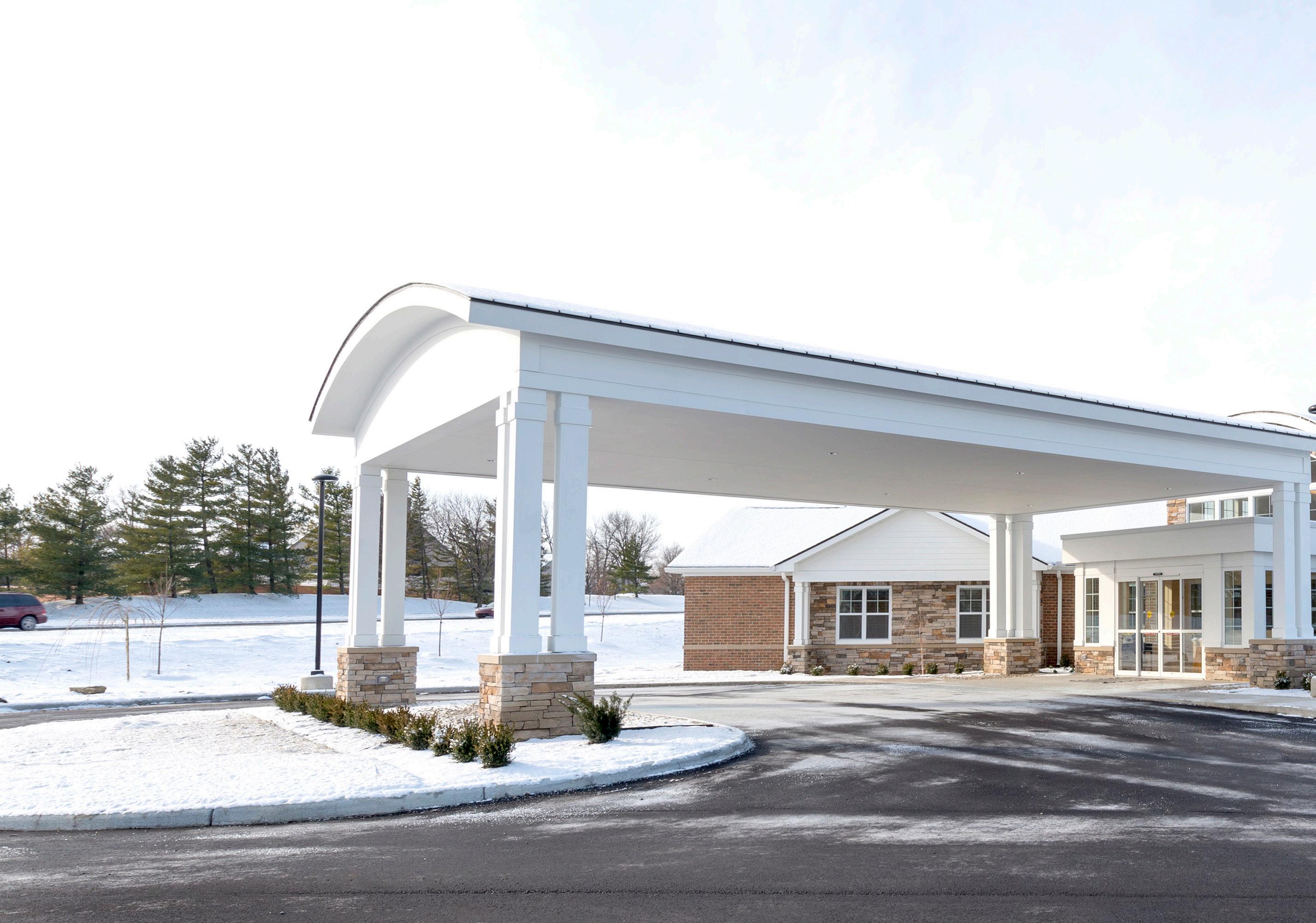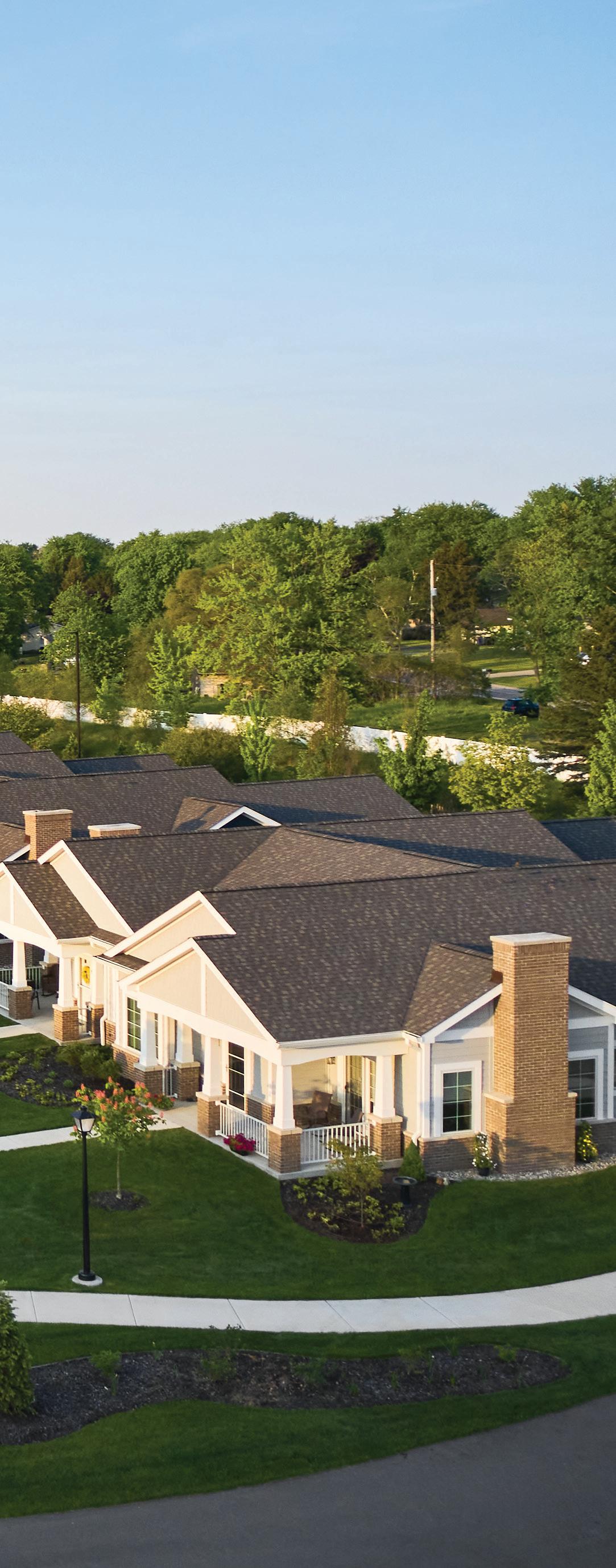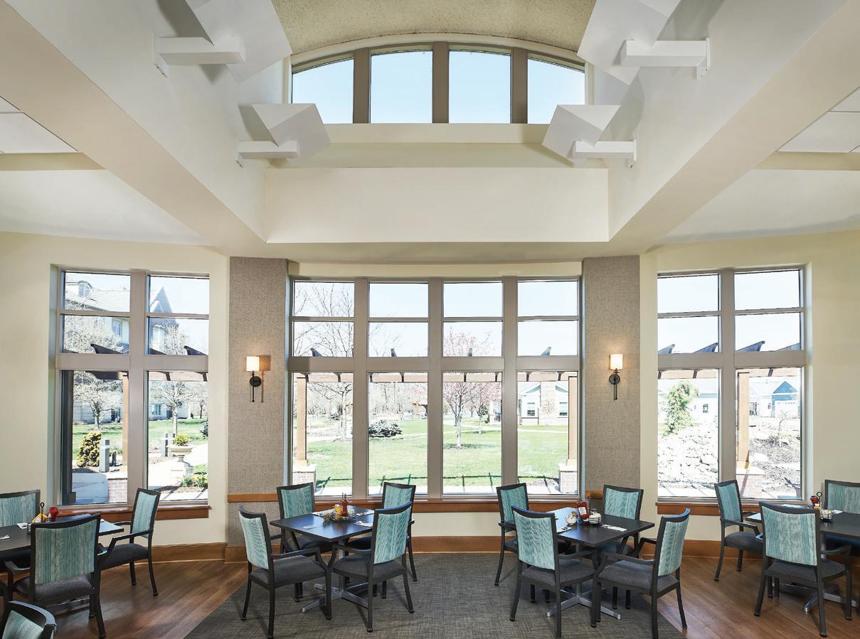 Symphony at Centerville is a Memory Care community in the greater Dayton, Ohio area. It is comprised of 56 private apartments and four semi-private apartments arranged into two neighborhoods. Each neighborhood has an activity room with a light-filled vaulted ceiling, an elegant dining room, and staff support spaces. There is also a shared activity room which is used for games and movies. The building surrounds a 12,000 square foot courtyard complete with walking path, areas of respite, and active planting beds. The shared activity room has a covered exterior porch ideal for sitting in the shade while spending time outdoors. The activity rooms in each neighborhood provide a connection to the outdoors, with a looping walk path both outdoors and indoors.