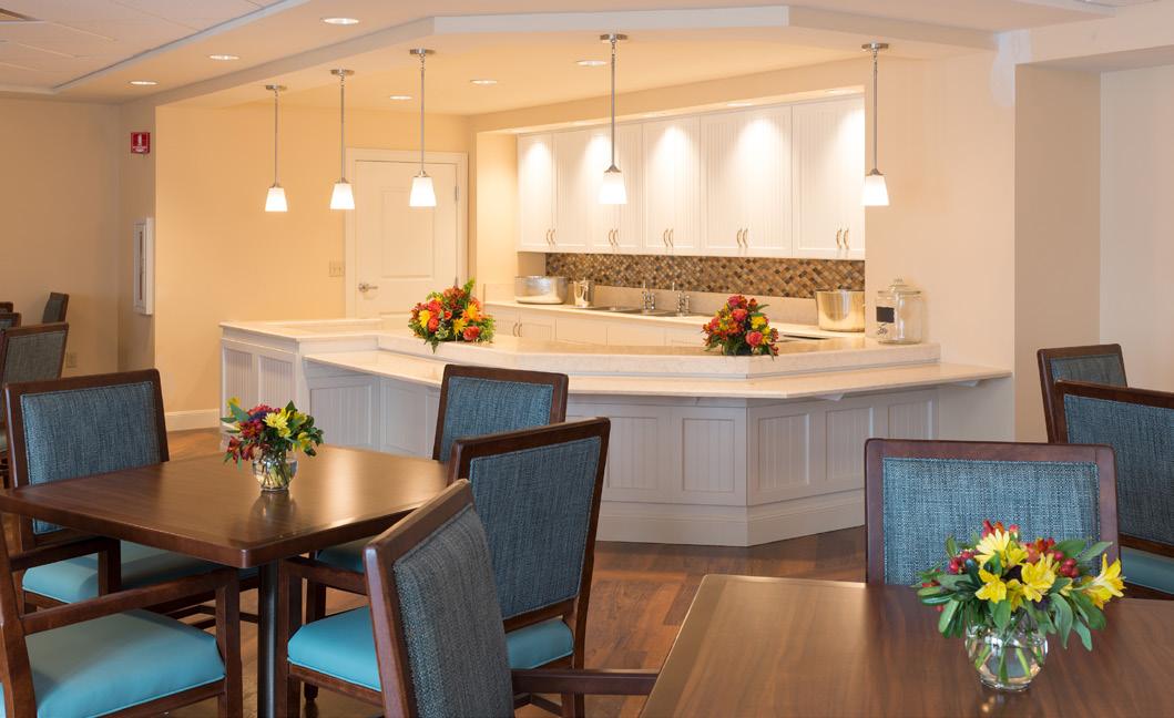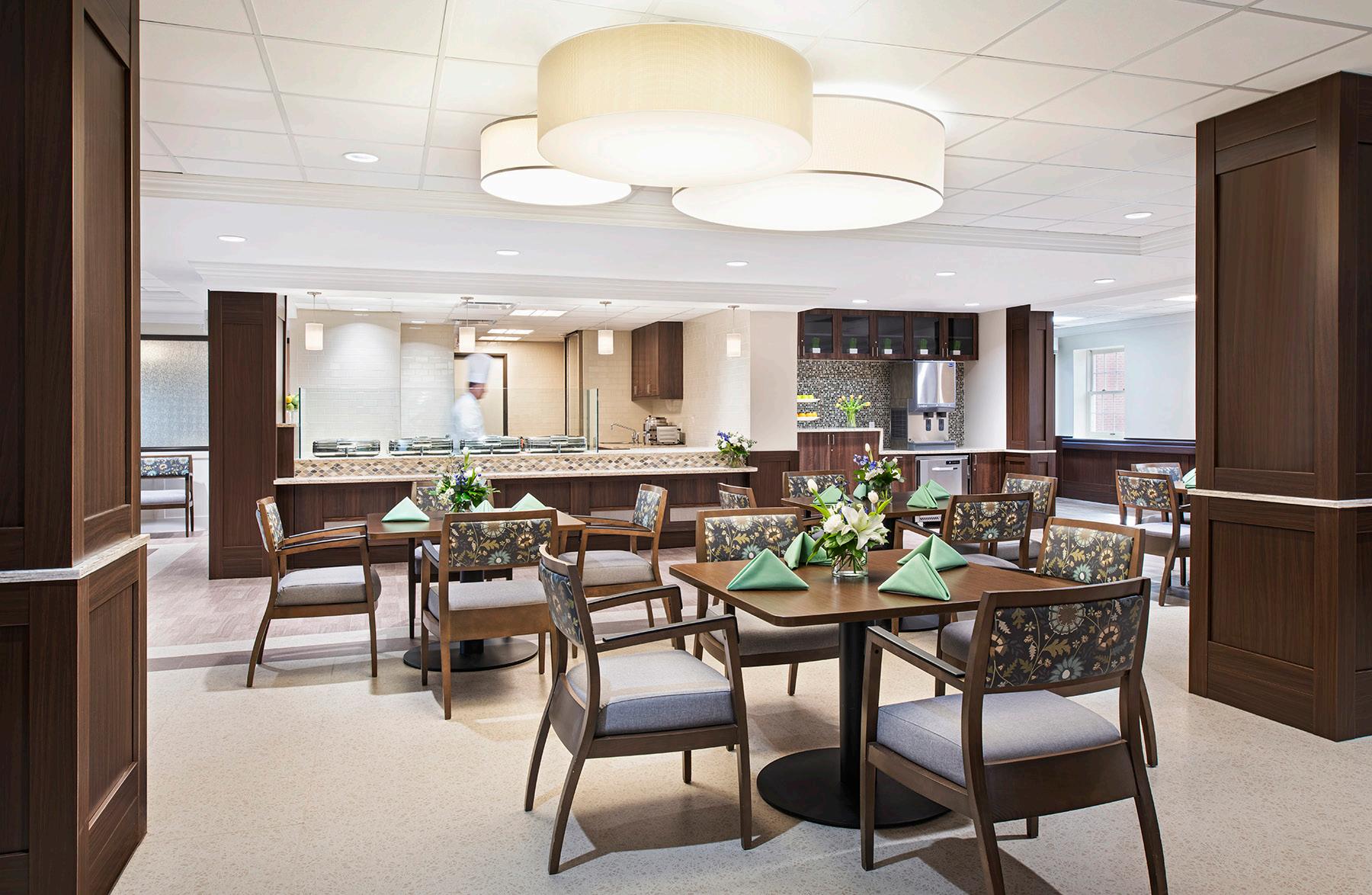 Phase two is a renovation of the first floor, starting with a new first impression at the main entrance and open great room seating area. The reconfiguration opens up circulation throughout the building and connects residents and guests to the full campus. Two new dining venues are provided, one which serves the long term care residents and the other focuses on short term rehab and guest dining.