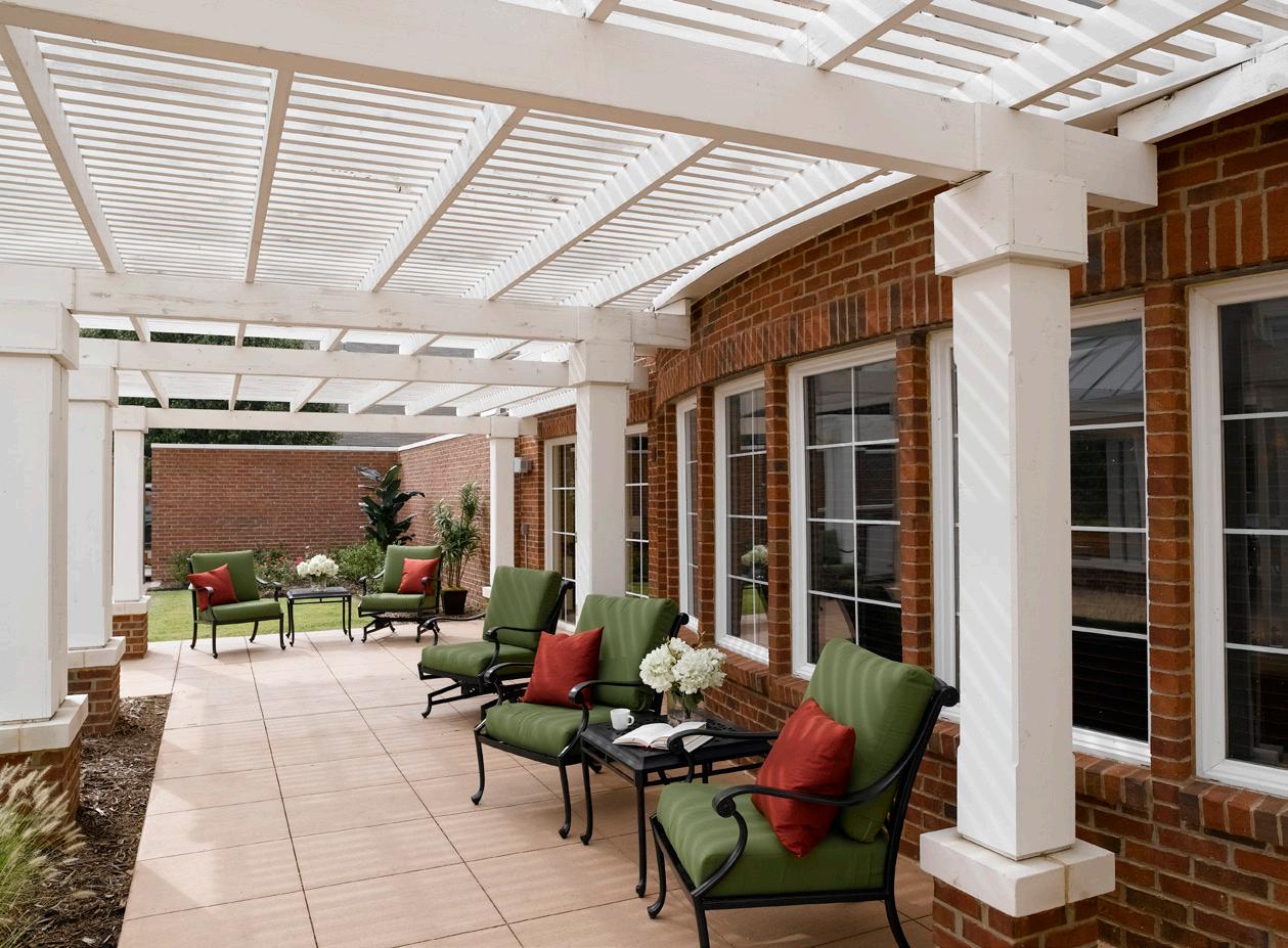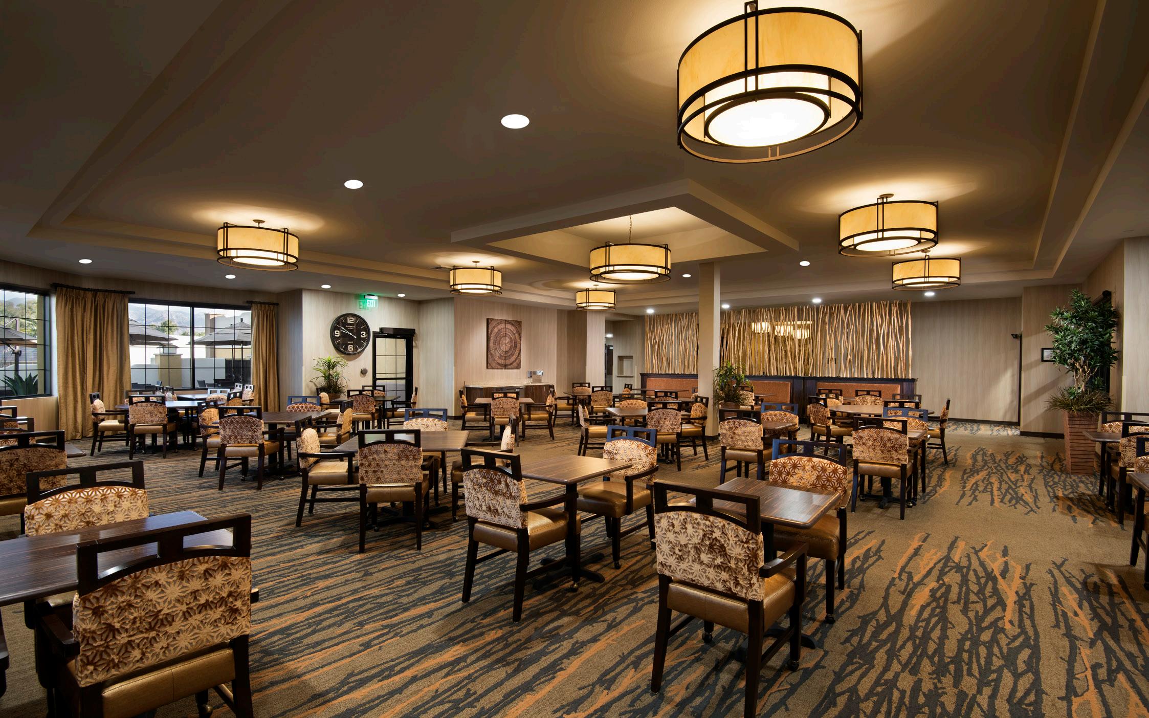 The renovated community boasts numerous upgrades. The addition of a porte-cochere creates a welcoming entrance that adds comfort and ease for those who need assistance entering and exiting vehicles. The facade was refreshed, and the public patio was redone in coordination with walkways and outdoor lighting to create an accessible and comfortable space.