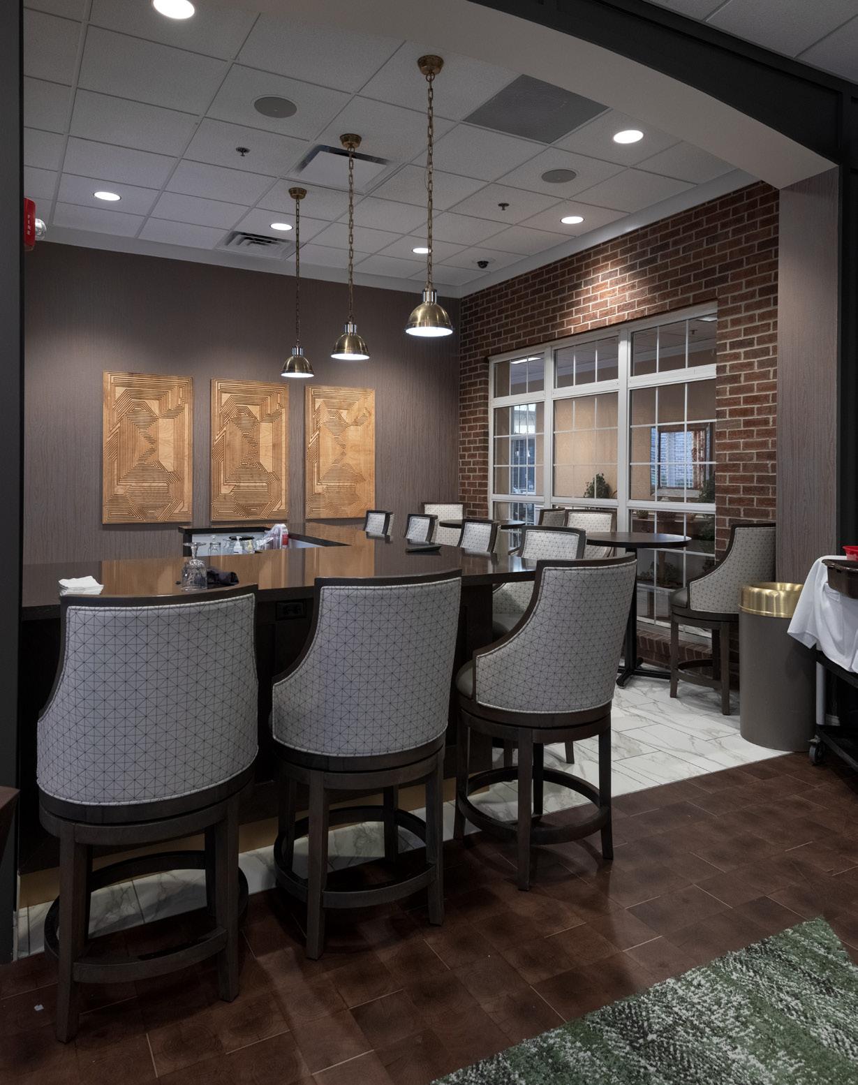 The Bistro refresh included: new finishes throughout, including flooring, wall finishes and window treatments; new furniture throughout; new fan; and we enlarged opening into space by bar area.